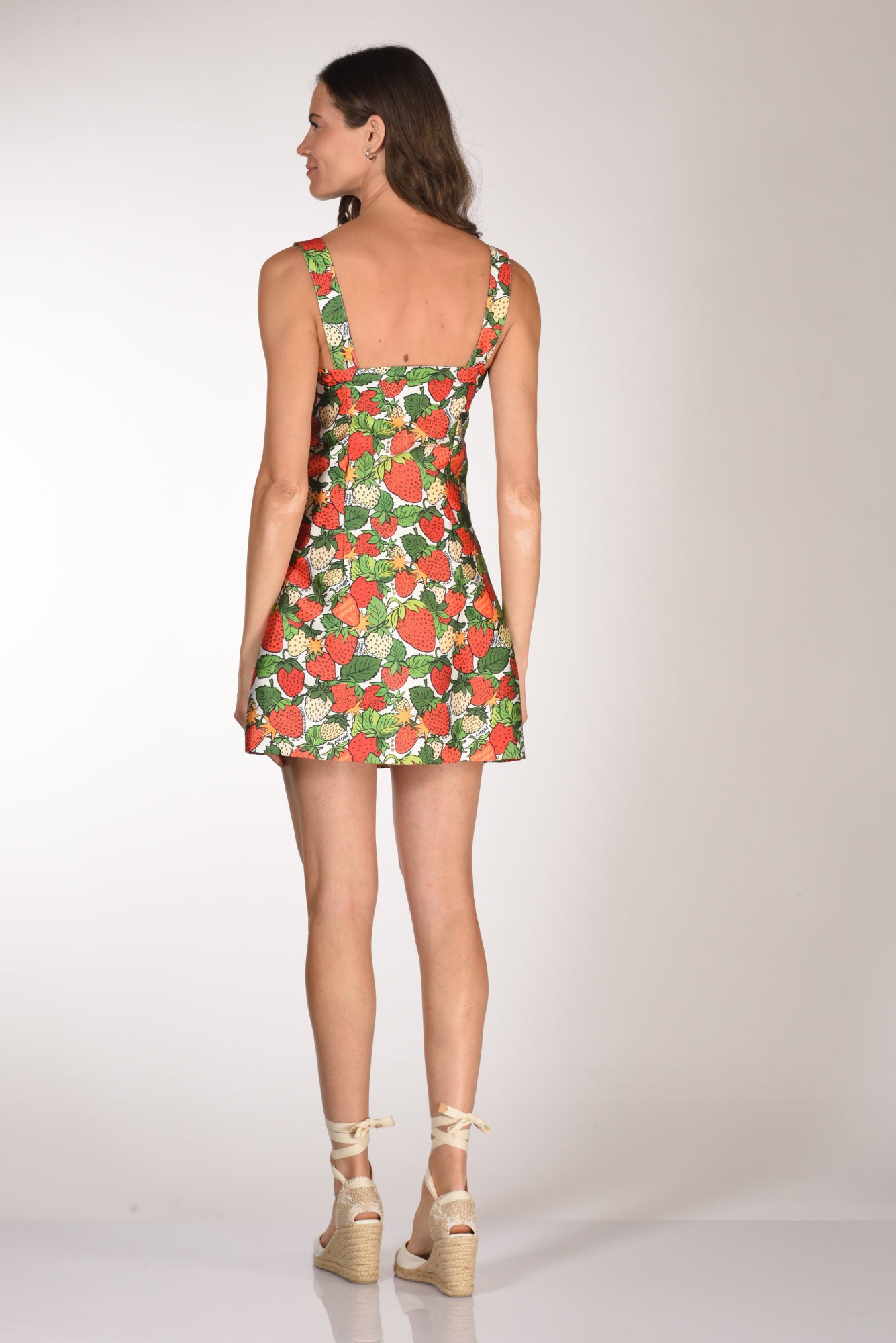 Mini Abito Stampa Fragole, Smanicato, Linea Semi Aderente, Chiusura Layerale Con Zip Invisibile, Foderato, Made In Italy, Composizione 100 Poliestere