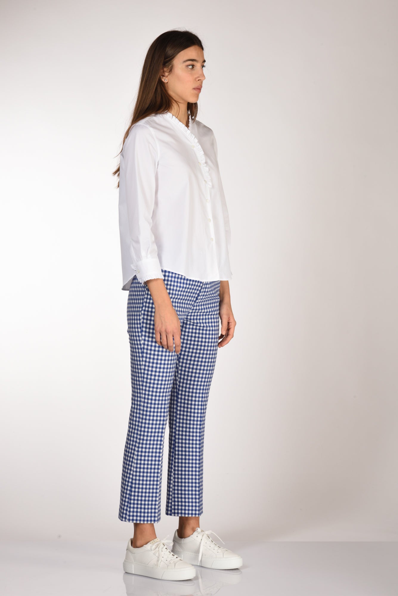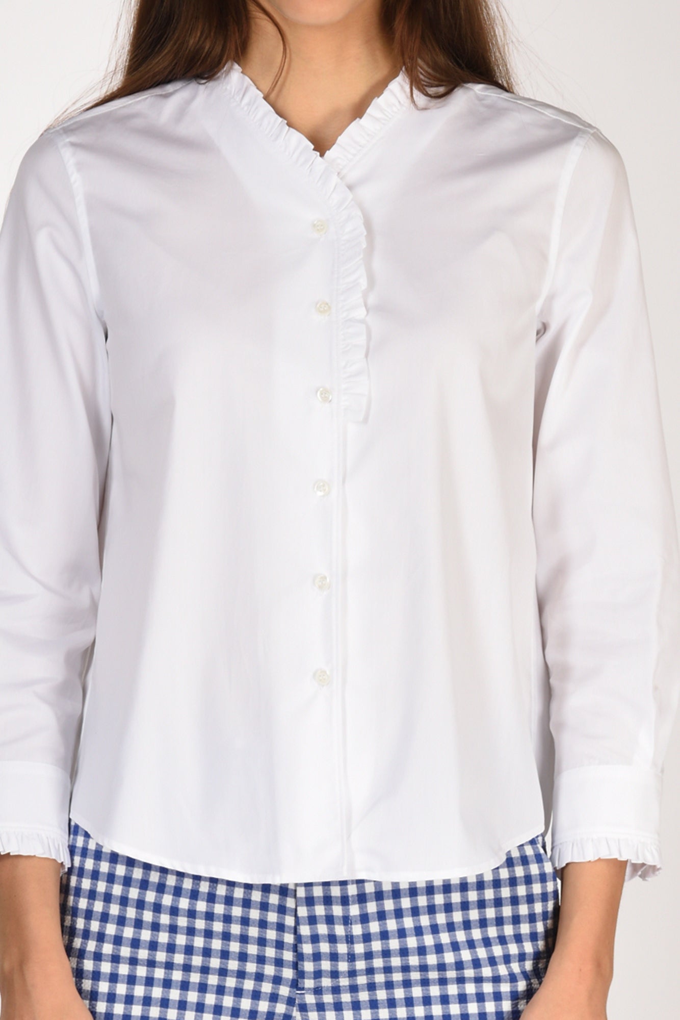 Camicia Scollo A V Profilato Con Rouches, Manica 3/4, Polso Tondo Chiuso Da Bottobe E Profilato Da Rouches, Chiusura Bottoni A Vista, Line Diritta, Cannoncino Centrale Posteriore, Fondo Stondato, Vestibilita' Regular, Made In Romania, Composizione 100 Cotone