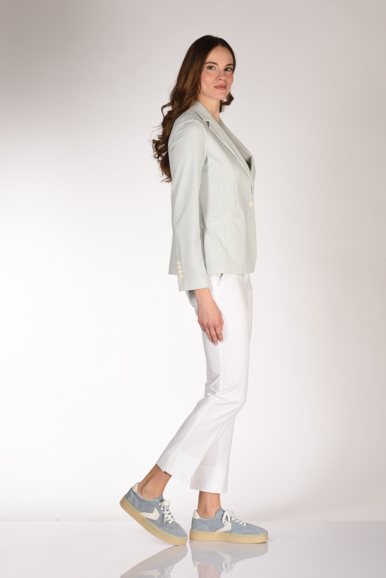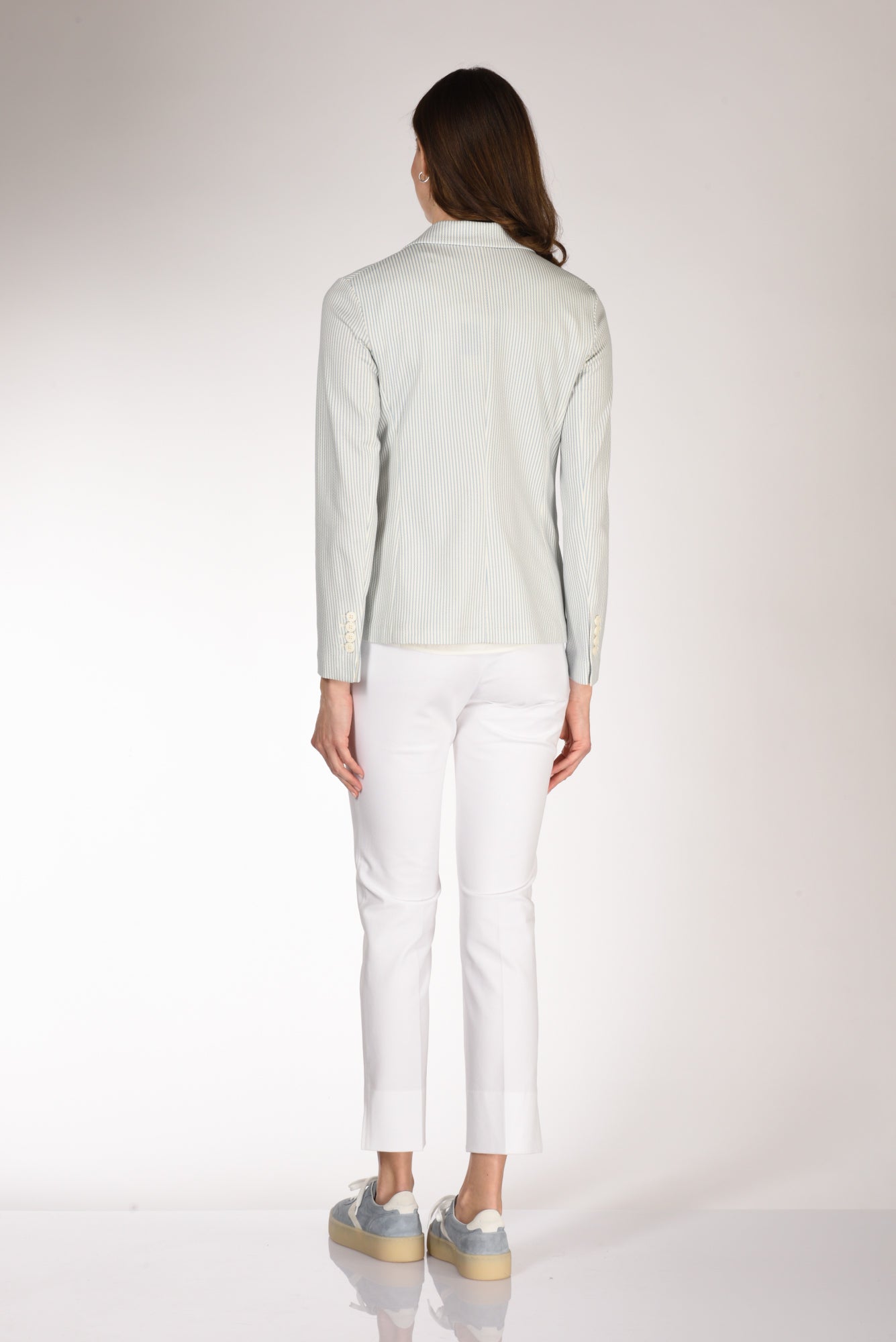Giacca Monopetto Rigata, Scollo Revers, Chiusura Ad Un Bottone Logato, Tasche Frontali A Filetto, Sfoderata, Vestibilita' Slim, Made In Romania, Composizione 97 Cotone, 3 Elastan