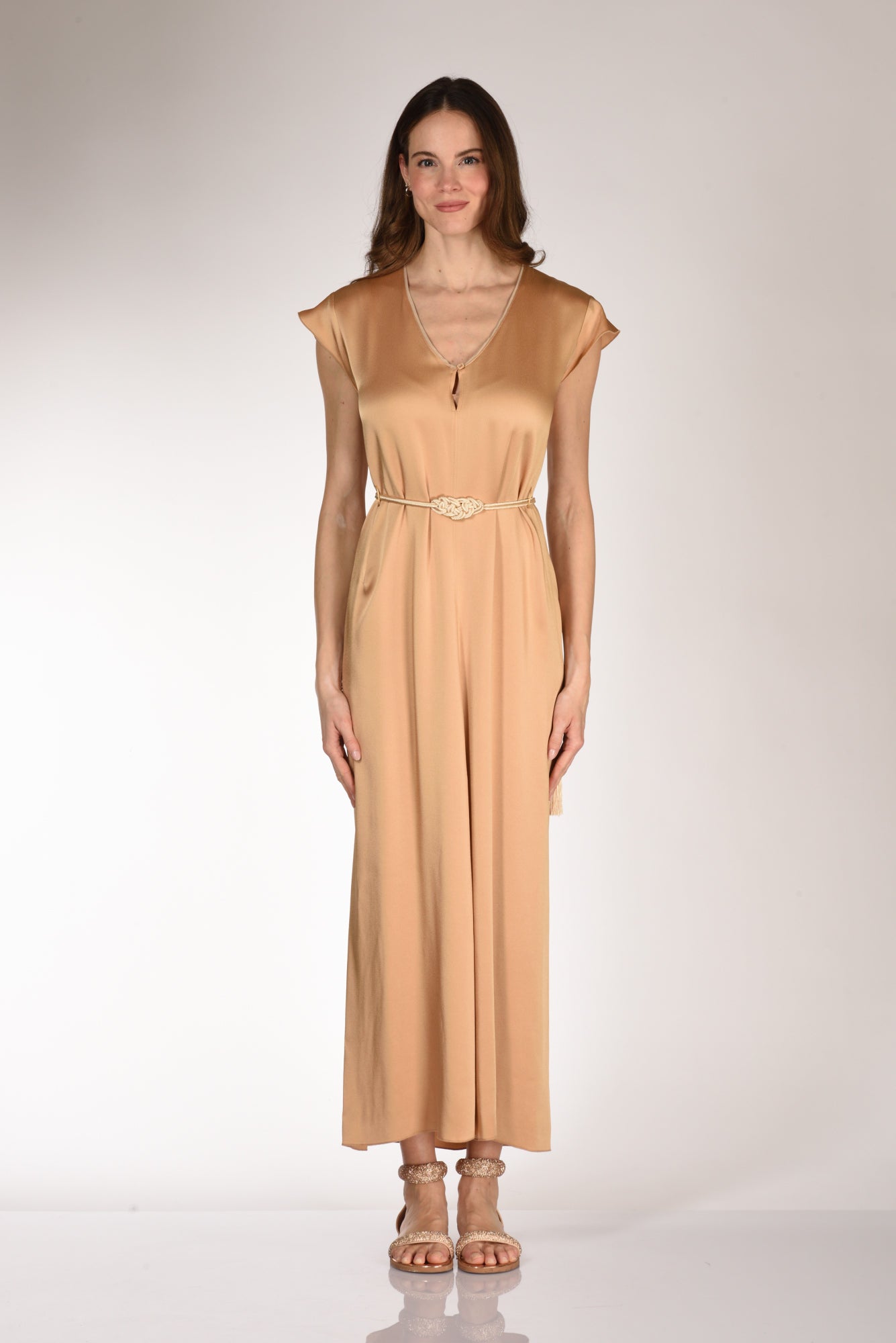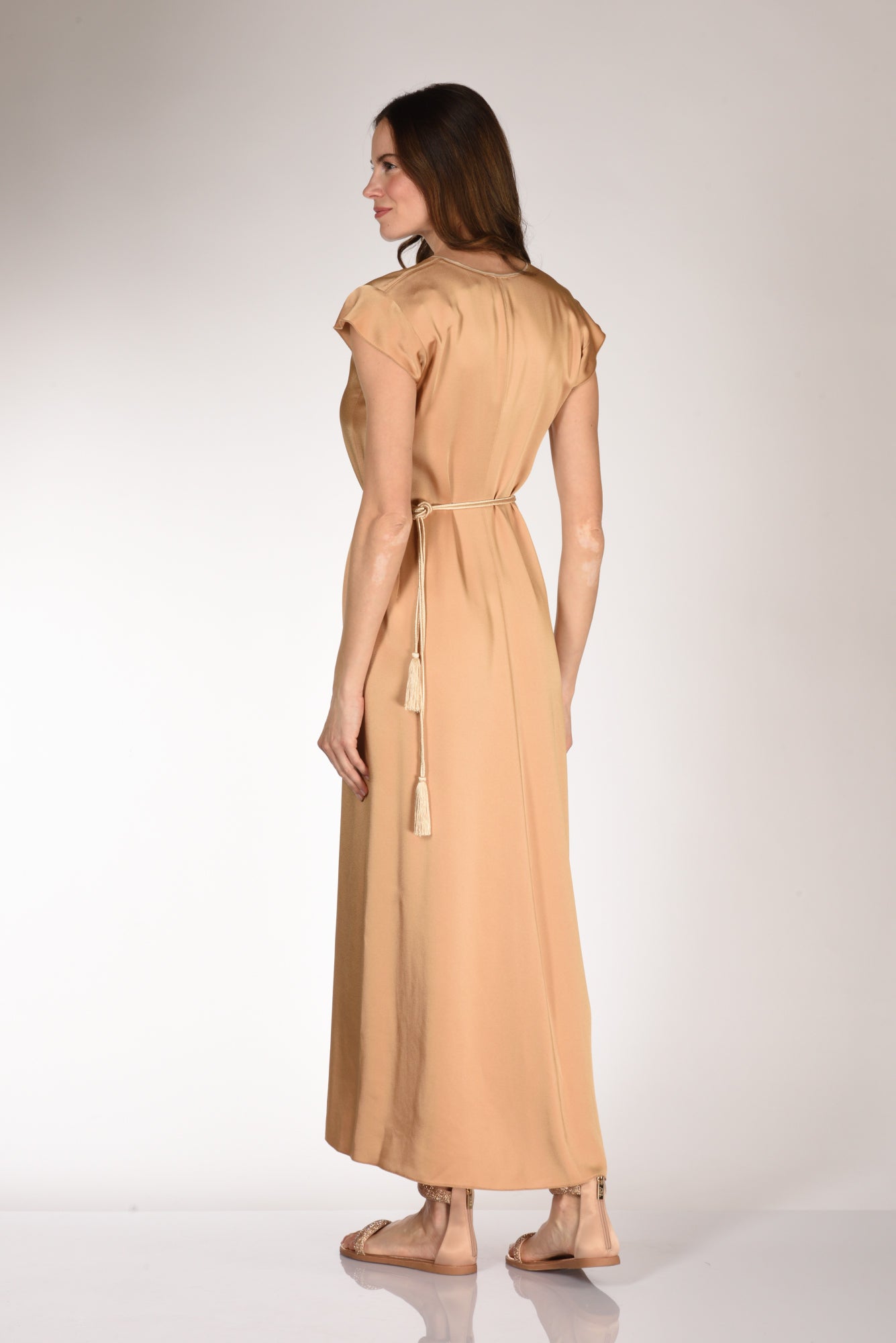 Abito Lungo Realizzati In Envers Satin, Scollo V Con Goccia Chiusa Da Un Bottone, Manica Ad Aletta, Vita Con Passanti E Cintura Abbinata, Fondo Spacco Frontale Centrale, Vestibilita' Regular, Made In Italy, Composizione 74 Acetato, 26 Viscosa.