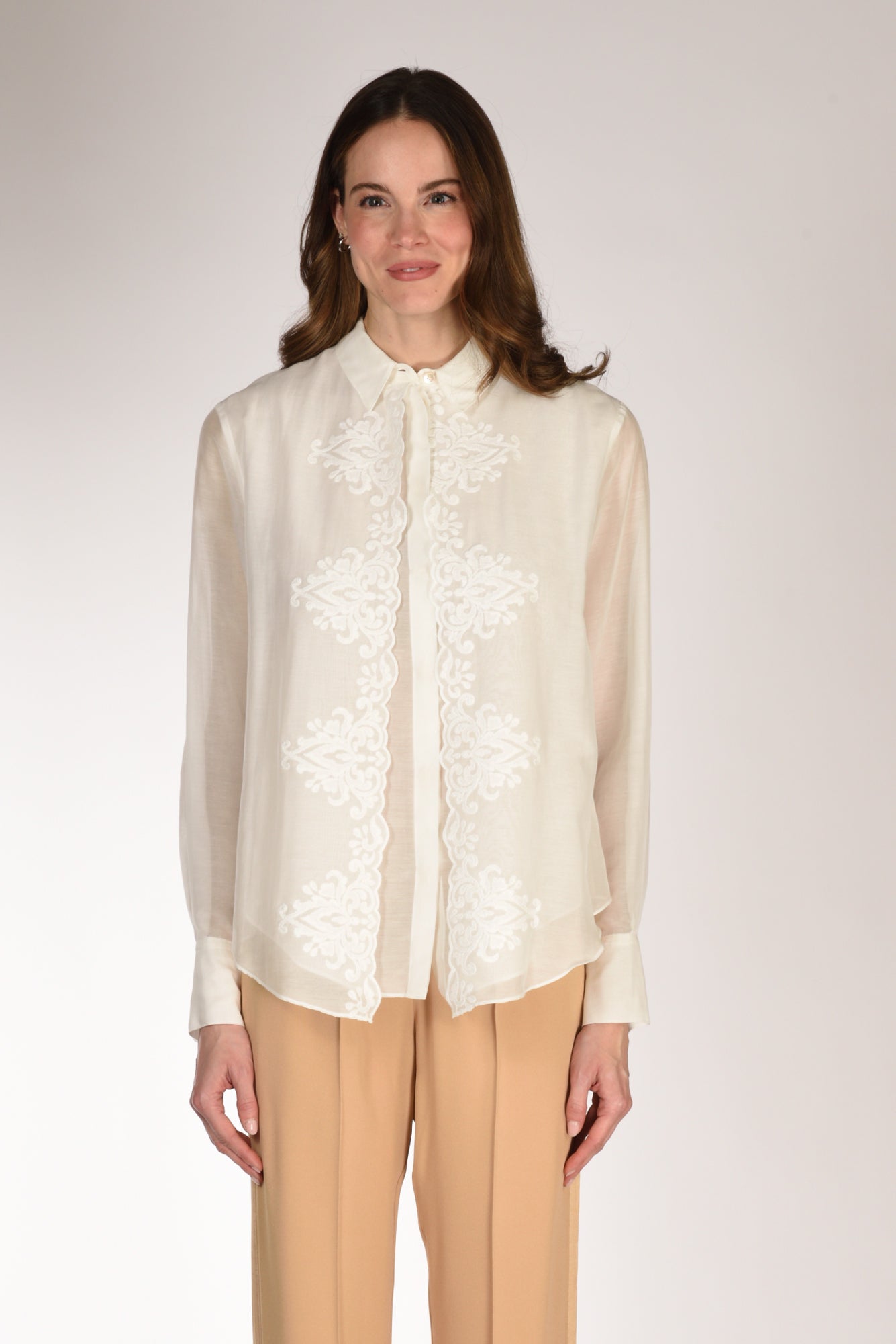 Camicia Realizzata In Voile Di Seta E Cotone, Colletto All'italiana, Chiusura Con Bottoni In Madreperla Nascosti, Frontale Un Doppio Pannello Ricamato Artigianalmente Con Bordo Smerlato,sfondo Piega Posteriore, Fondo Stondato, Polso Alto Ad Un Bottone, Vestibilita' Morbida, Made In Italy, Composizione 70 Cotone 30 Seta .