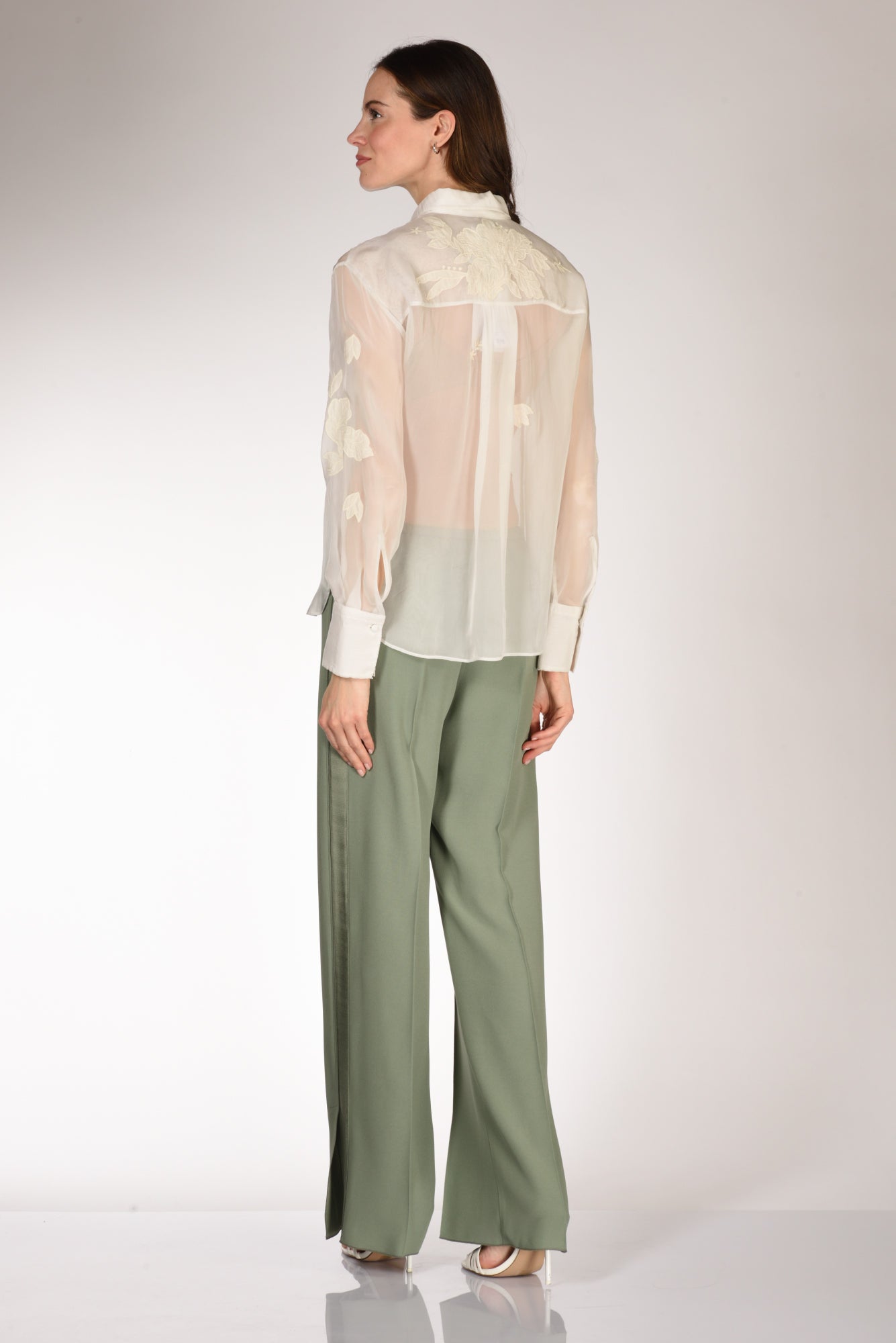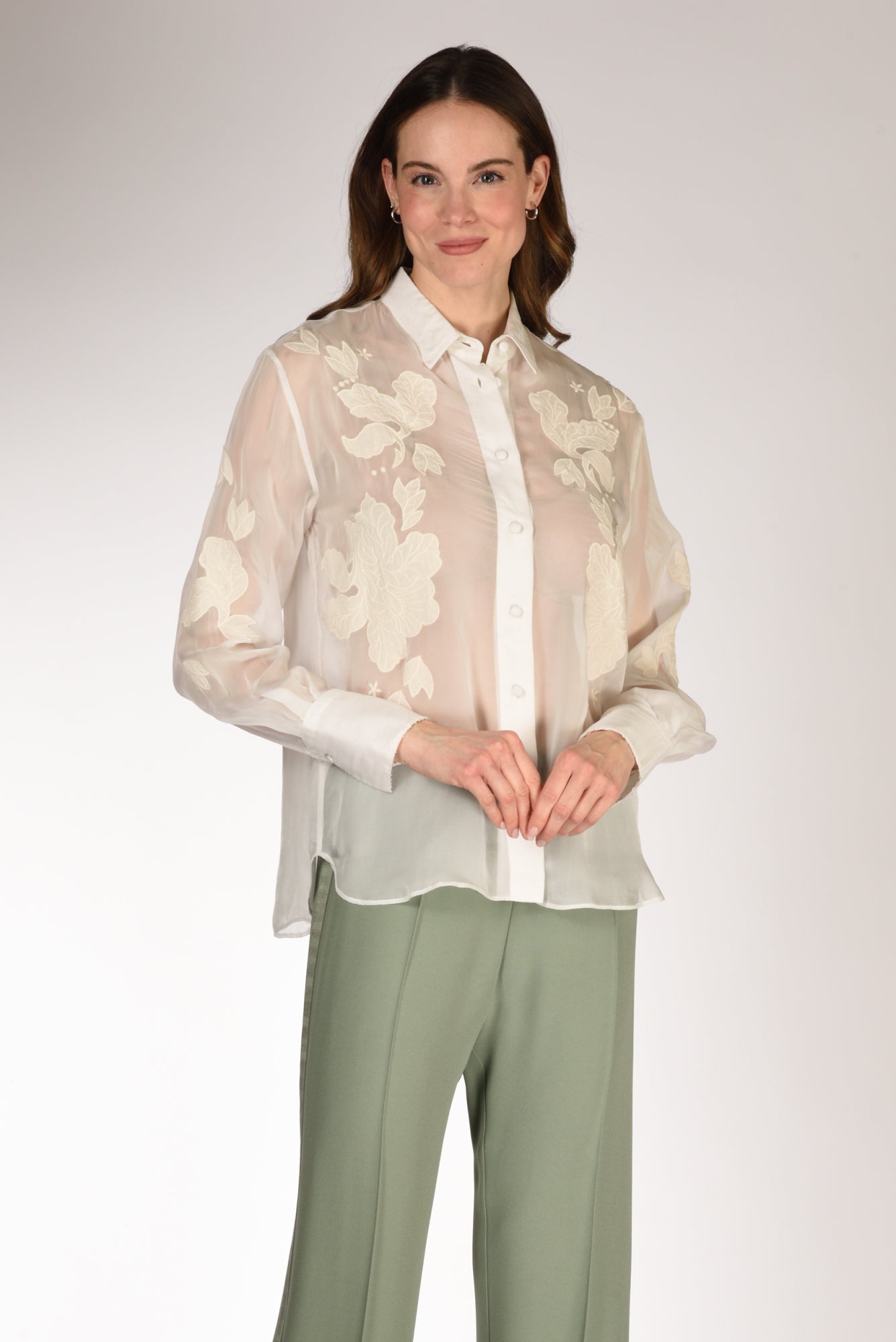Camicia Trasparente Con Ricami In Tessuto Tono Su Tono, Maniche Lunghe Con Alto Poslino Decorato Da Perline E Chiuso Da Bottone, Orlo Stondato, Chiusa Da Bottoni Rivestiti, Vestibilita' Regular, Composizione 100 Viscosa, Ricamo 100 Cotone, Made In Italy.