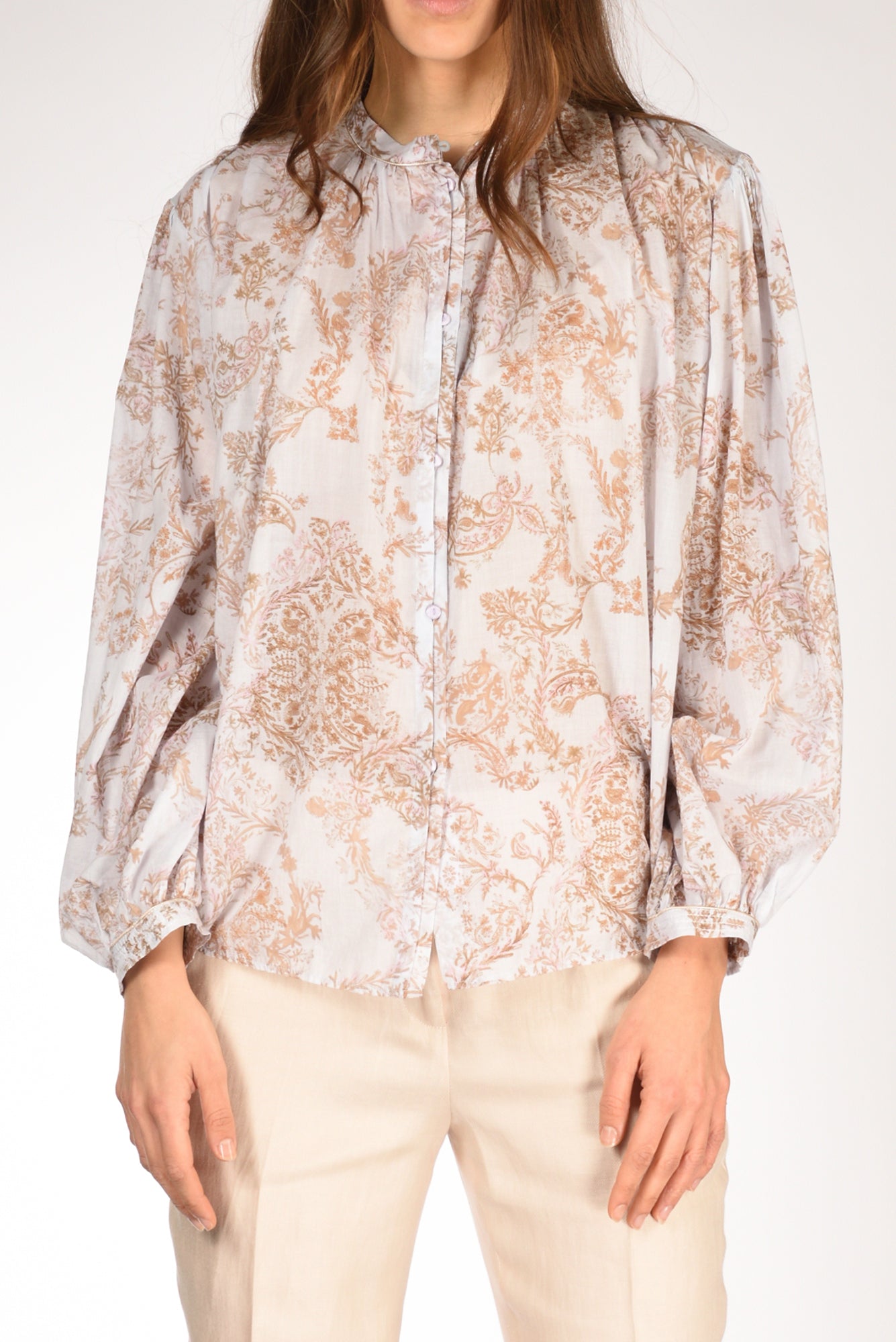 Camicia Over Stampa 'non Ti Scordar Di Me', Collo Alla Coreana, Spalla Scesa, Maniche Lunghe Con Polsino Largo, Chiusa Da Bottoni Ricoperti Semi Nascosti, Fondo Stondato, Made In Italy, Composizione 100 Cotone.