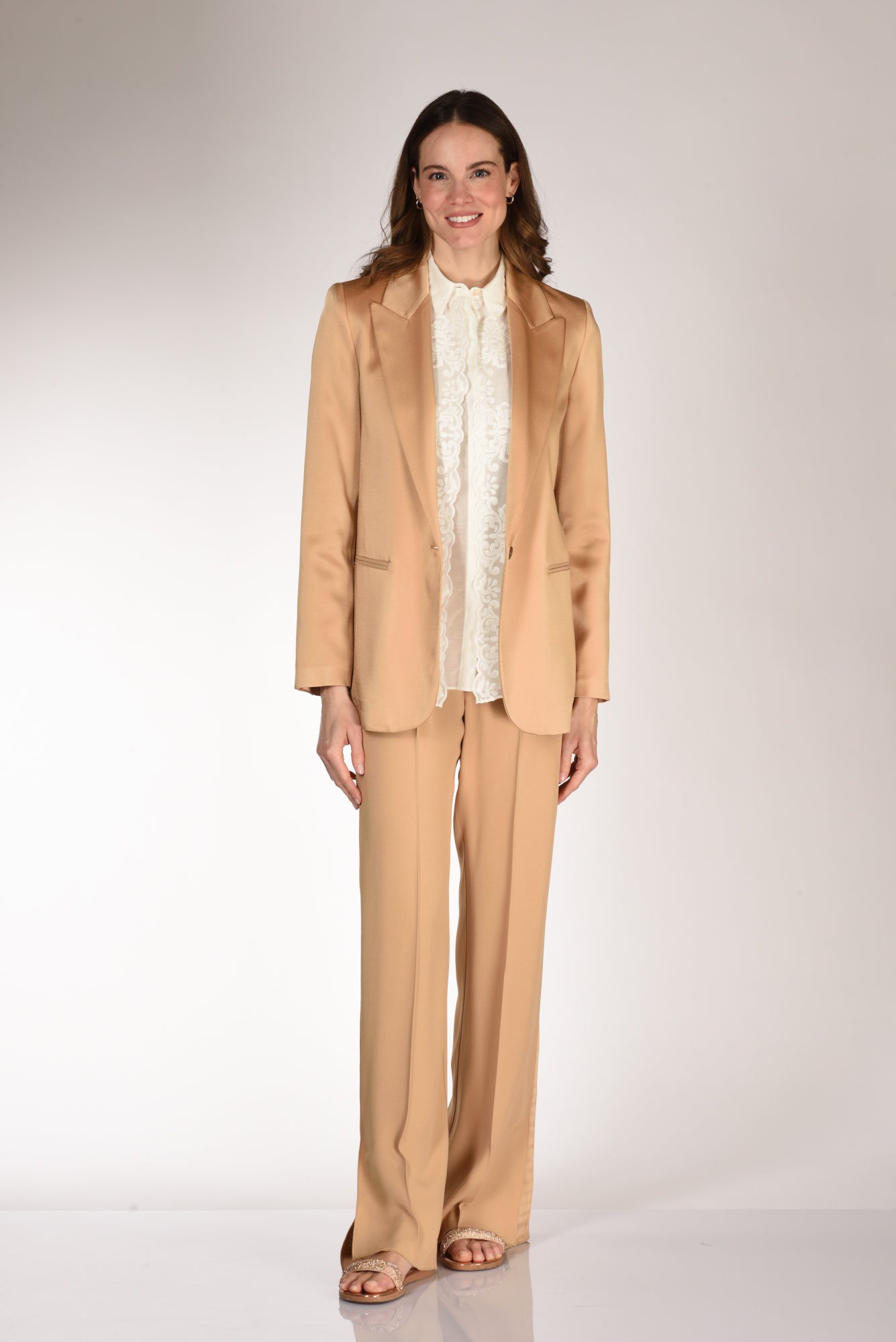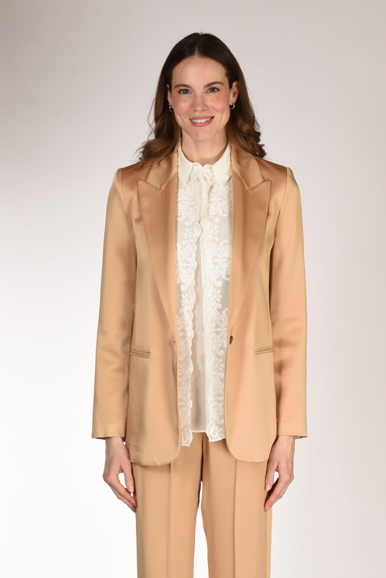 Giacca Di Media Lunghezza, Monopetto, Realizzati In Envers Satin, Rever A Lancia, Chiusura Ad Un Bottone A Vista, Polso Con Finte Asole E Bottoni, Linea Diritta, Foderata, Vestibilita' Morbida, Made In Italy, Composizione 74 Acetato, 26 Viscosa Fodera 60 Acetato, 40 Viscosa.