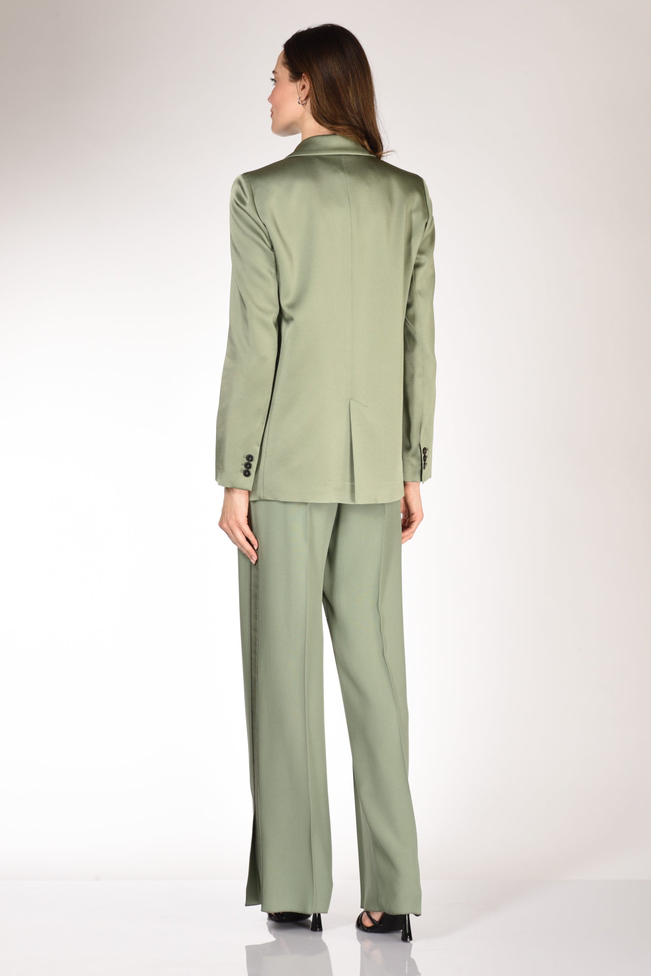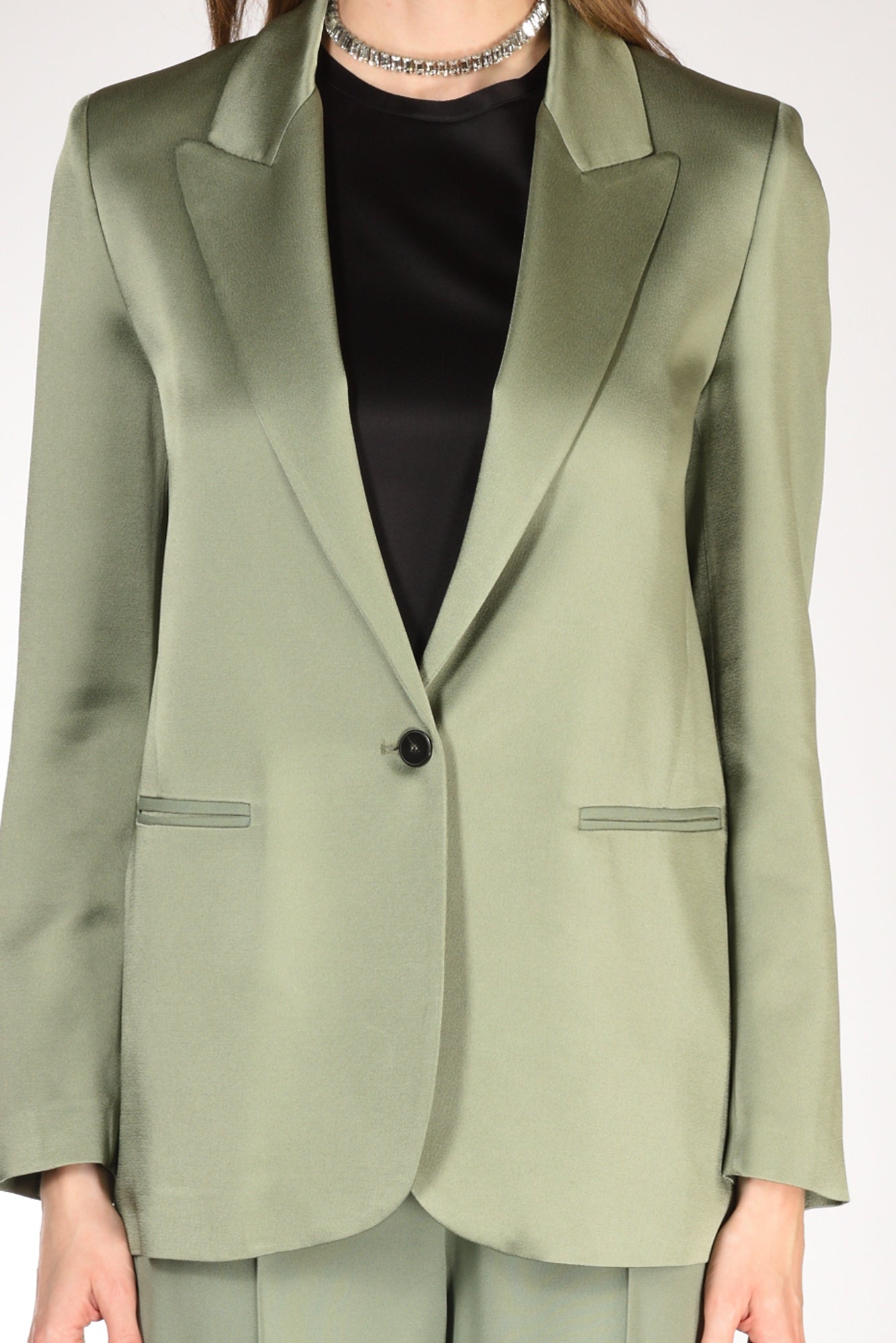Giacca Di Media Lunghezza, Monopetto, Realizzati In Envers Satin, Rever A Lancia, Chiusura Ad Un Bottone A Vista, Polso Con Finte Asole E Bottoni, Linea Diritta, Foderata, Vestibilita' Morbida, Made In Italy, Composizione 74 Acetato, 26 Viscosa Fodera 60 Acetato, 40 Viscosa.