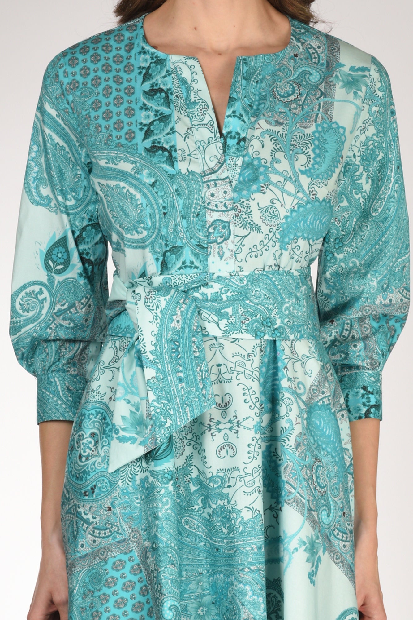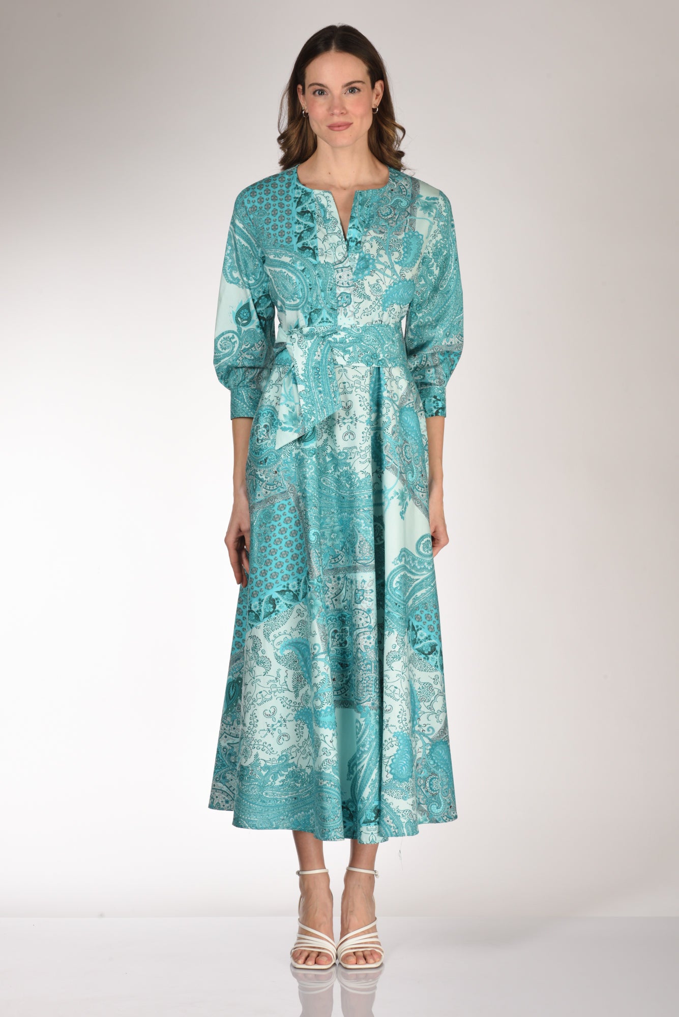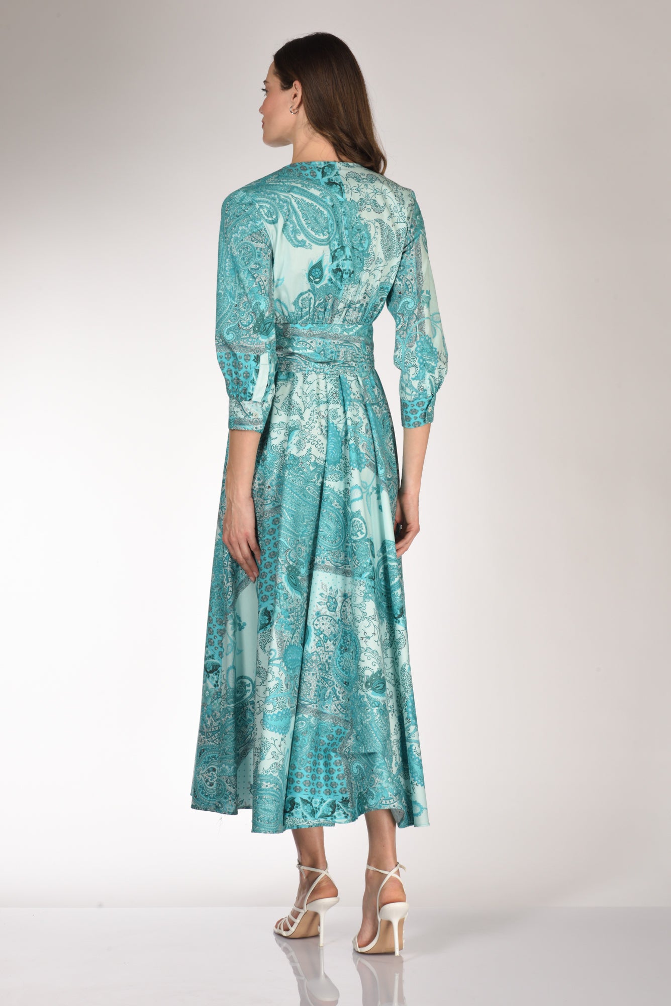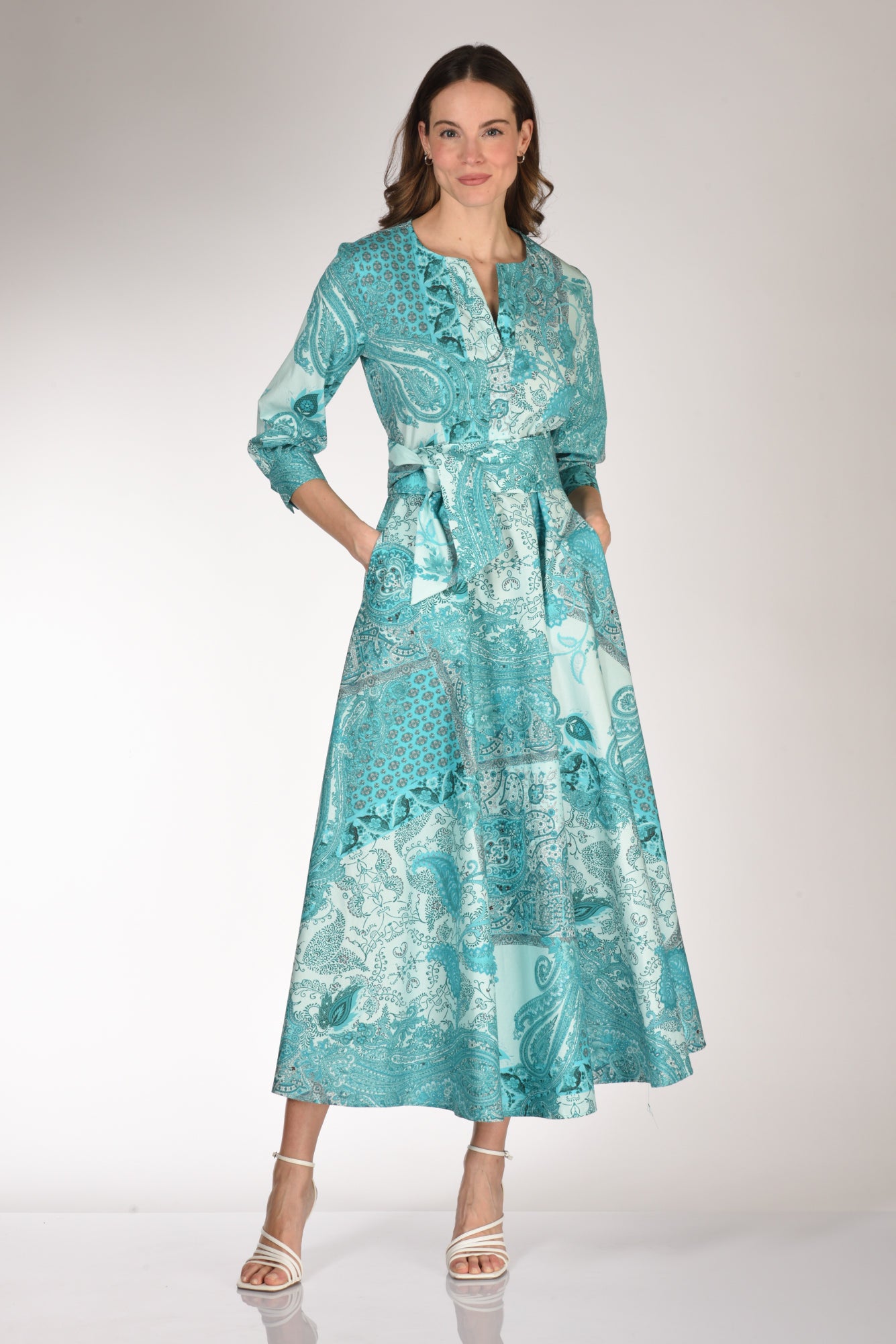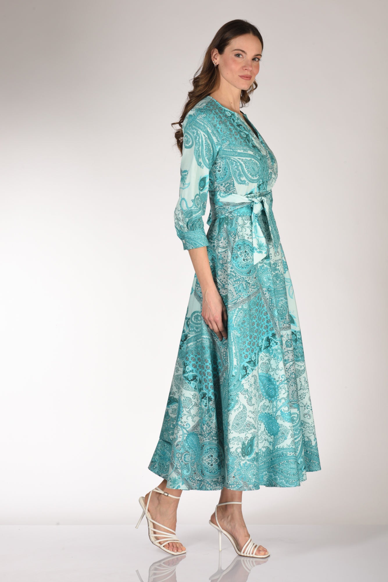 Abito Lungo Stampato, Manica 3/4, Taglio In Vita Con Elastico Posteriore, Gonna Ampia, Tasche Inserite Nel Fianco, Scollo A V, Cintura A Fusciacca Tono Su Tono, Made In Italy, Composizione 97 Cotone, 3 Elastan