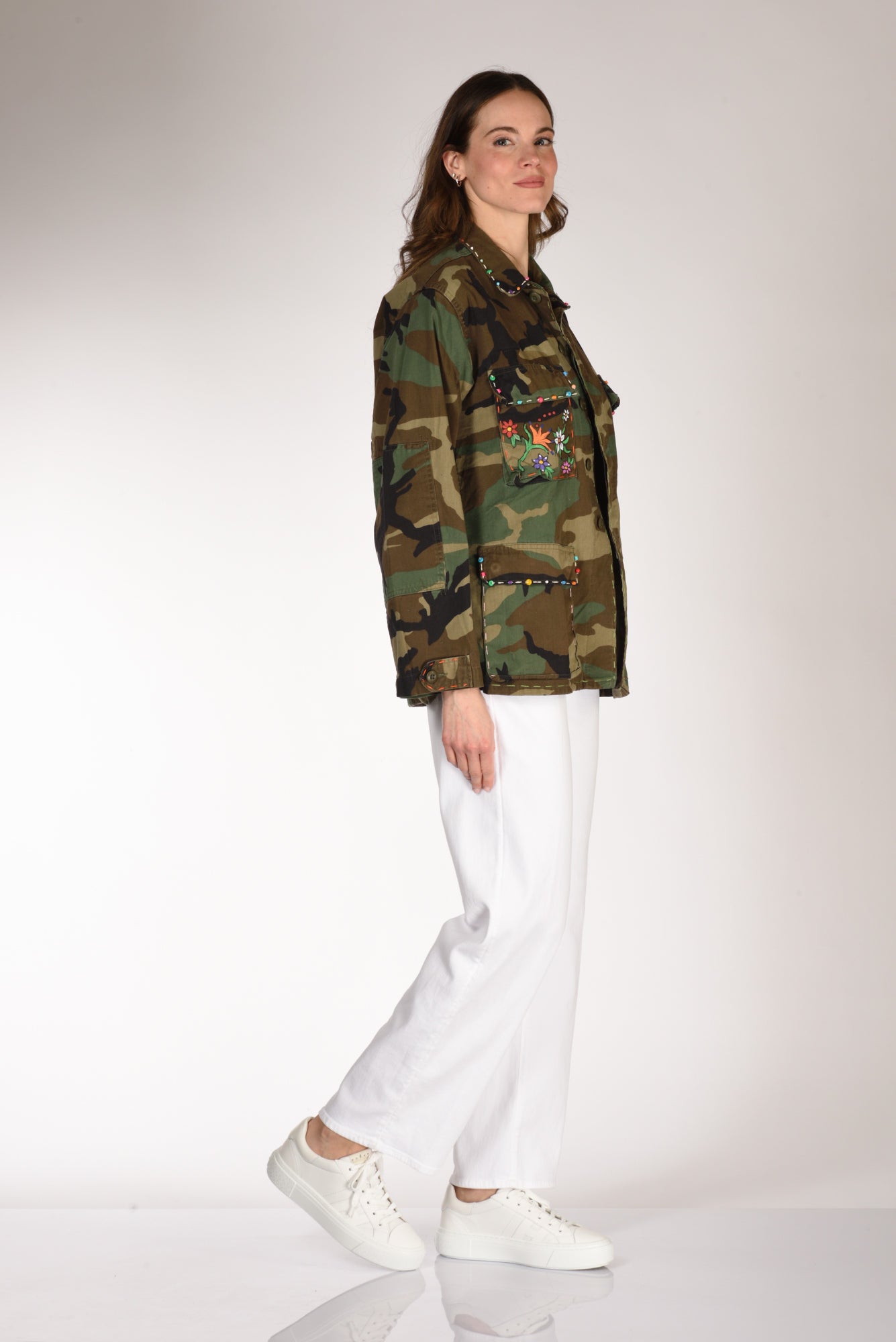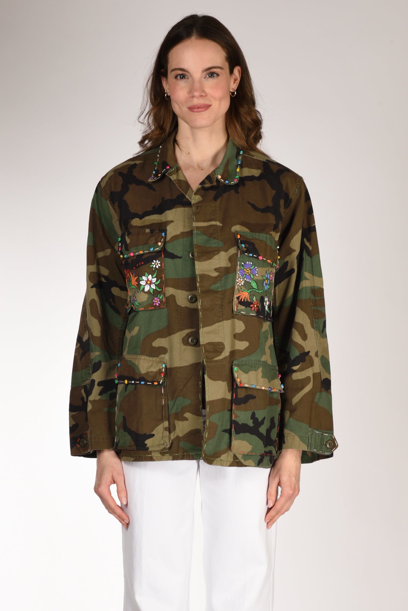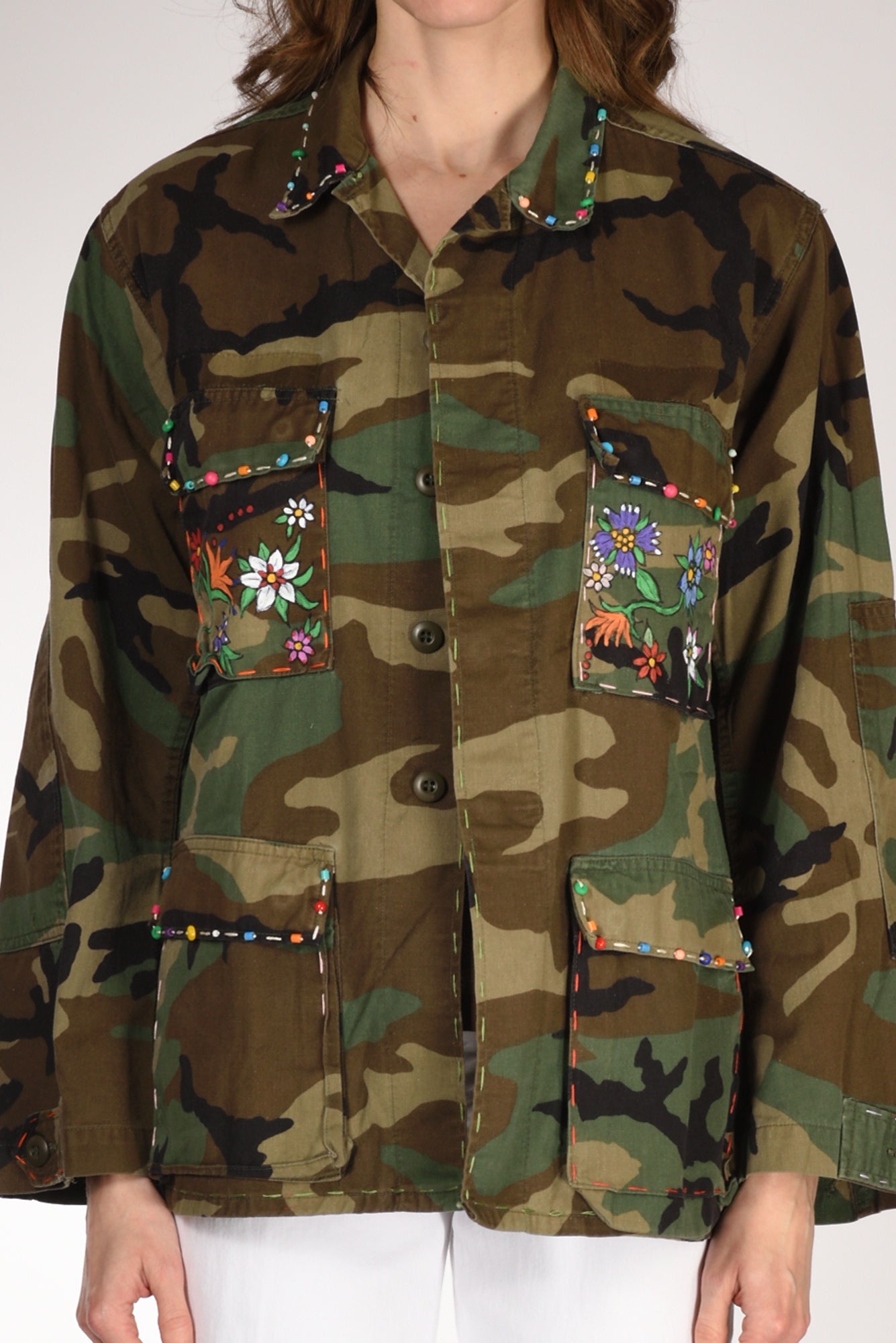Giacca Modello Mimetica Vintage, Decorata E Dipinta A Mano, Collo A Camicia, Chiusura Bottoni Metallici Nascosti, Manica Lunga Con Polso Regolabile A Due Bottoni, Tasche Frontali Applicate Chiuse Con Patta, Profilo Con Impunture, Linea Diritta, Vestibilita' Morbida, Made In Italy, Composizione 50 Cotone, 50 Nylon