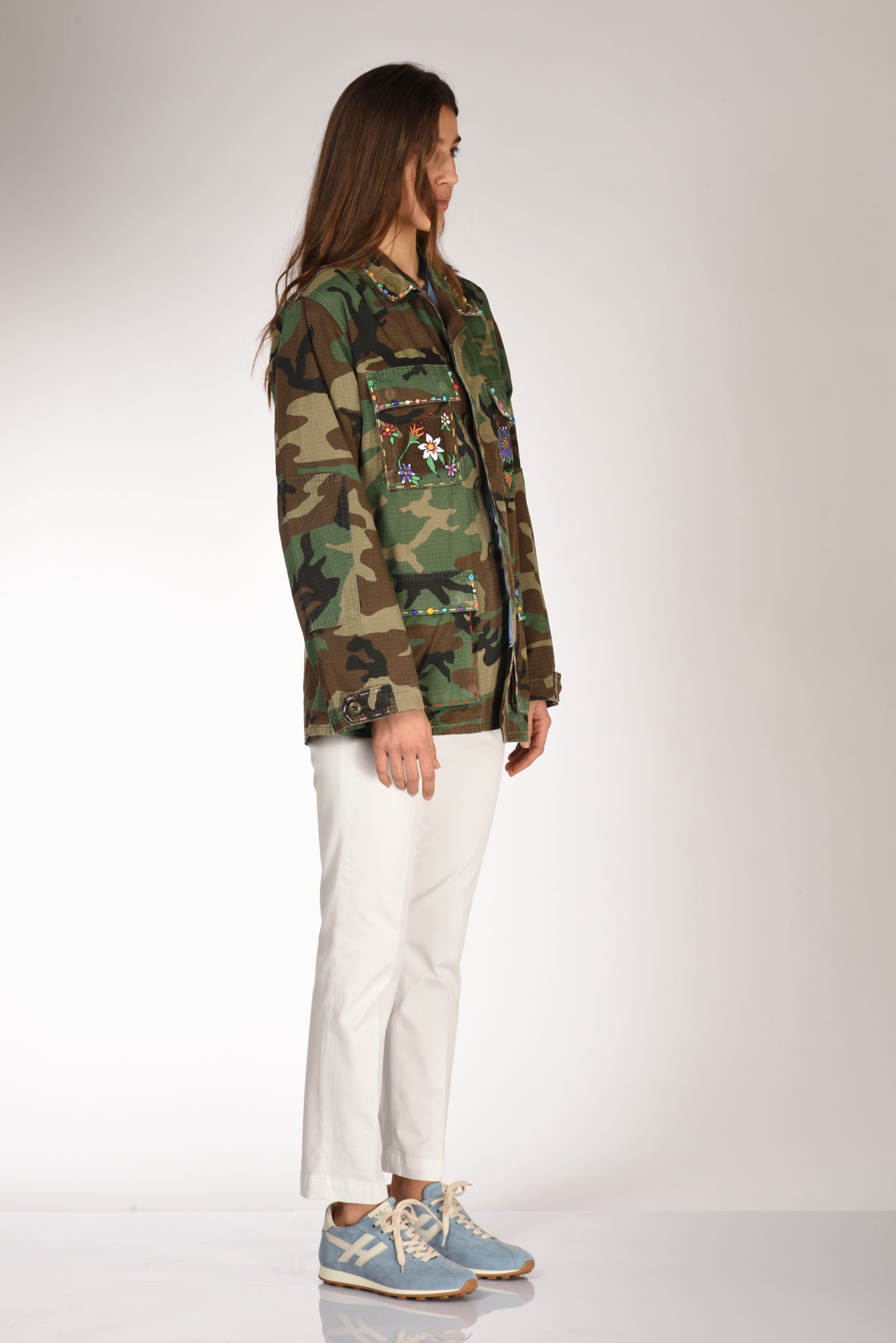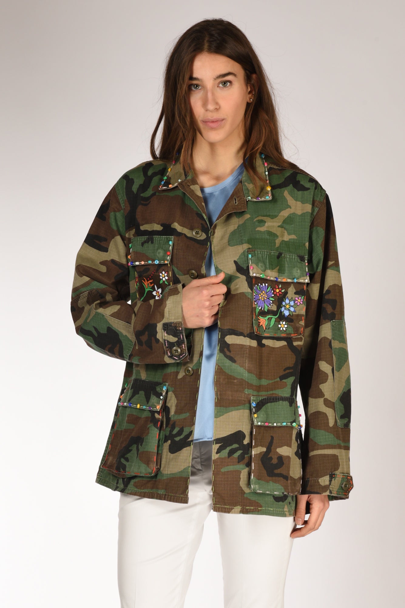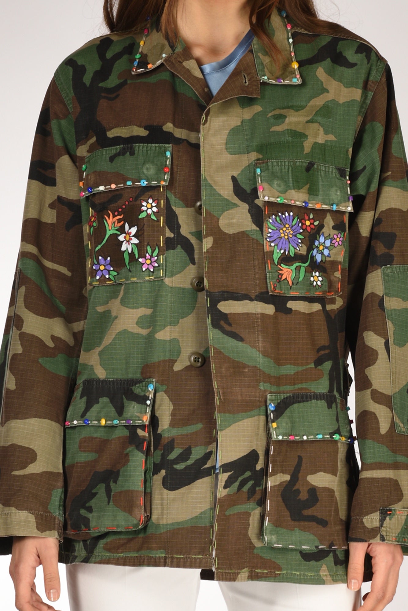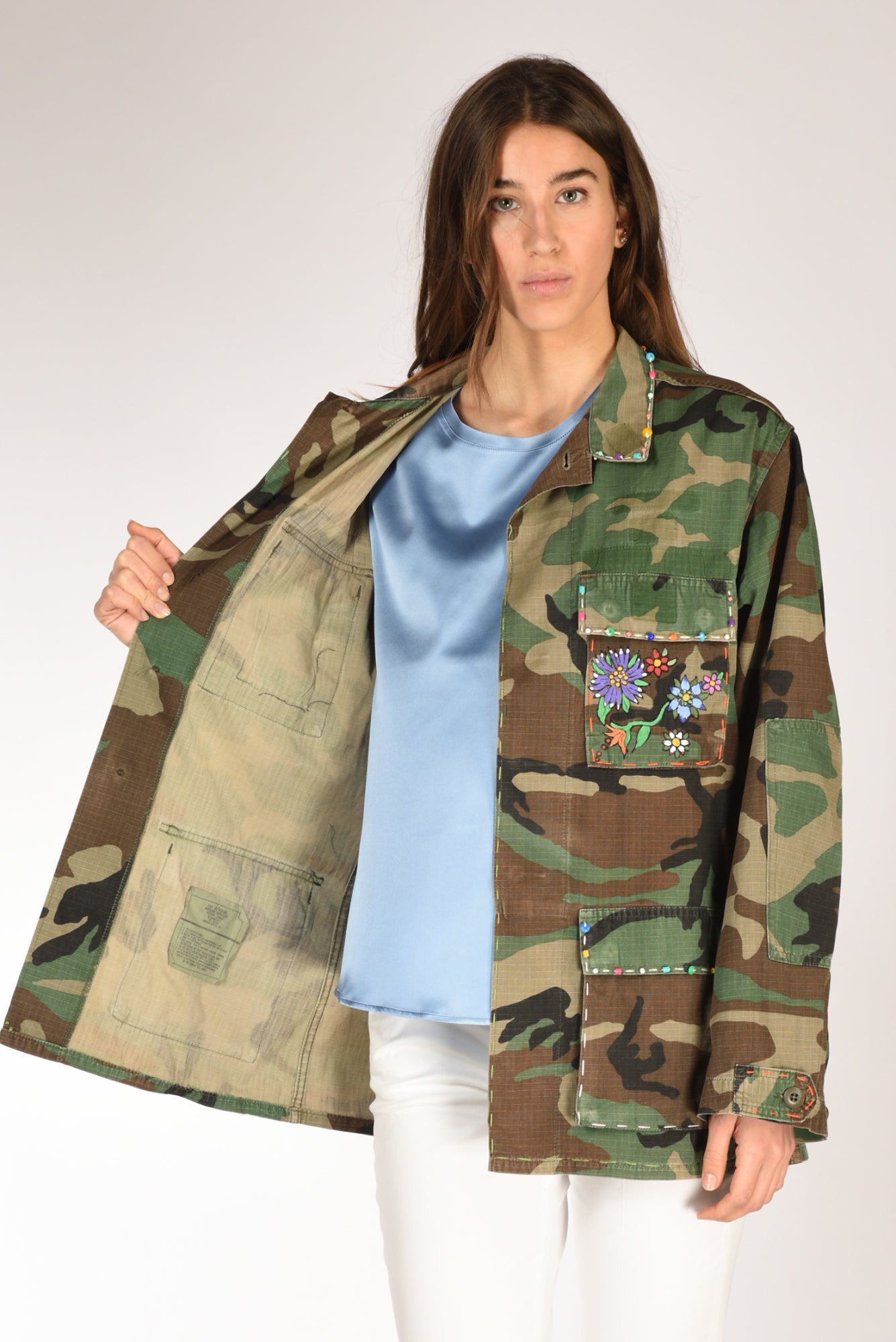 Giacca Modello Mimetica Vintage, Decorata E Dipinta A Mano, Collo A Camicia, Chiusura Bottoni Metallici Nascosti, Manica Lunga Con Polso Regolabile A Due Bottoni, Tasche Frontali Applicate Chiuse Con Patta, Profilo Con Impunture, Linea Diritta, Vestibilita' Morbida, Made In Italy, Composizione 100 Cotone