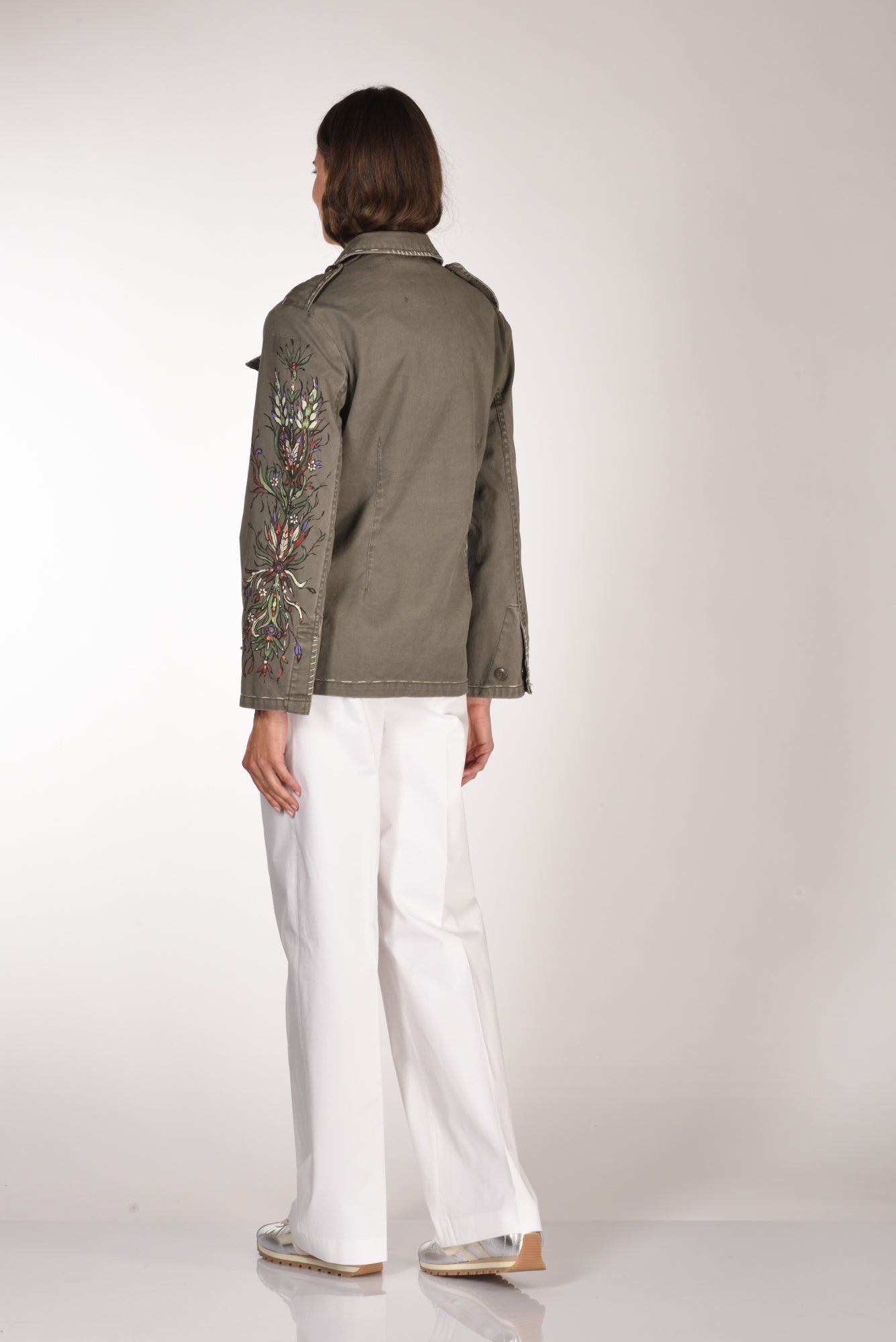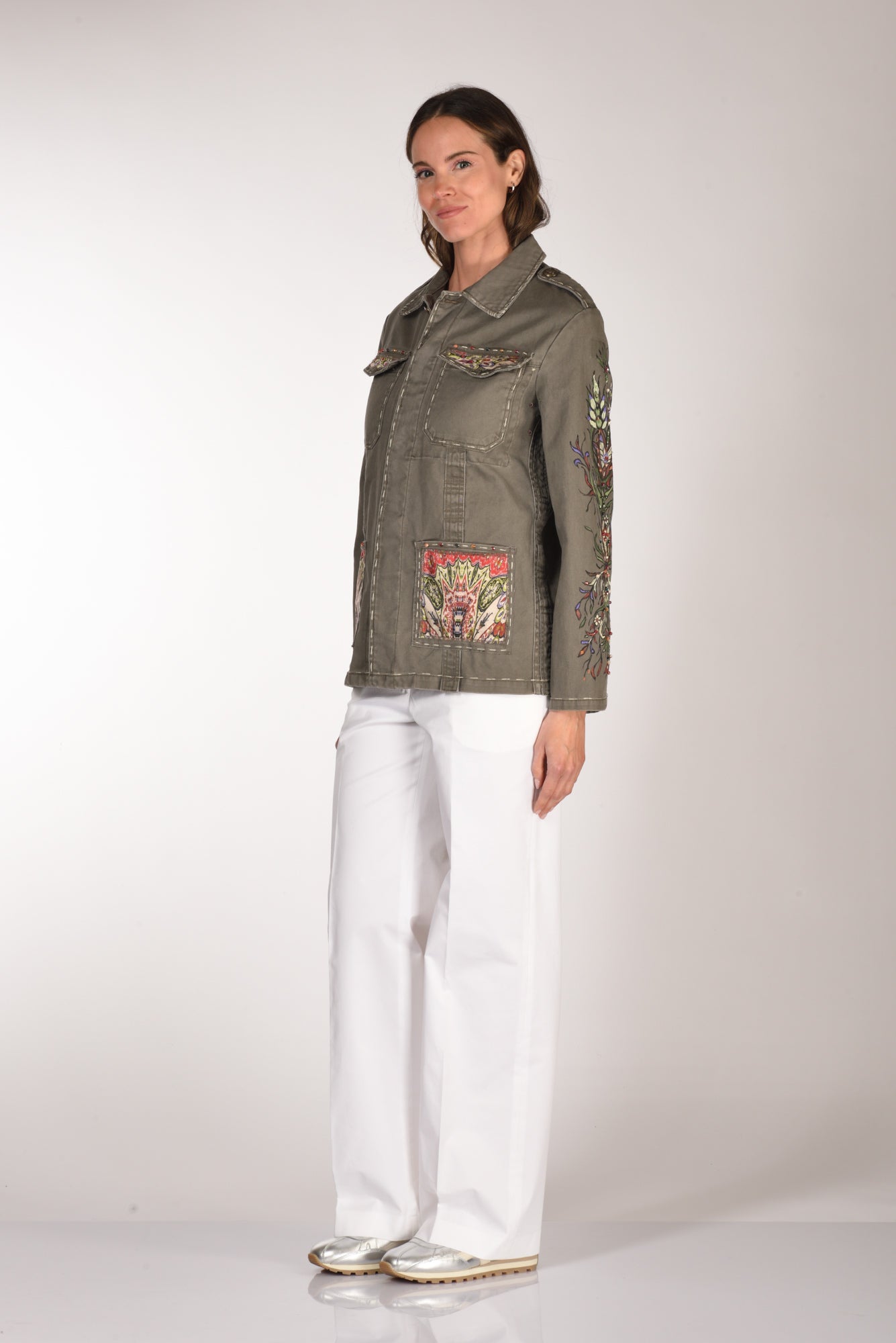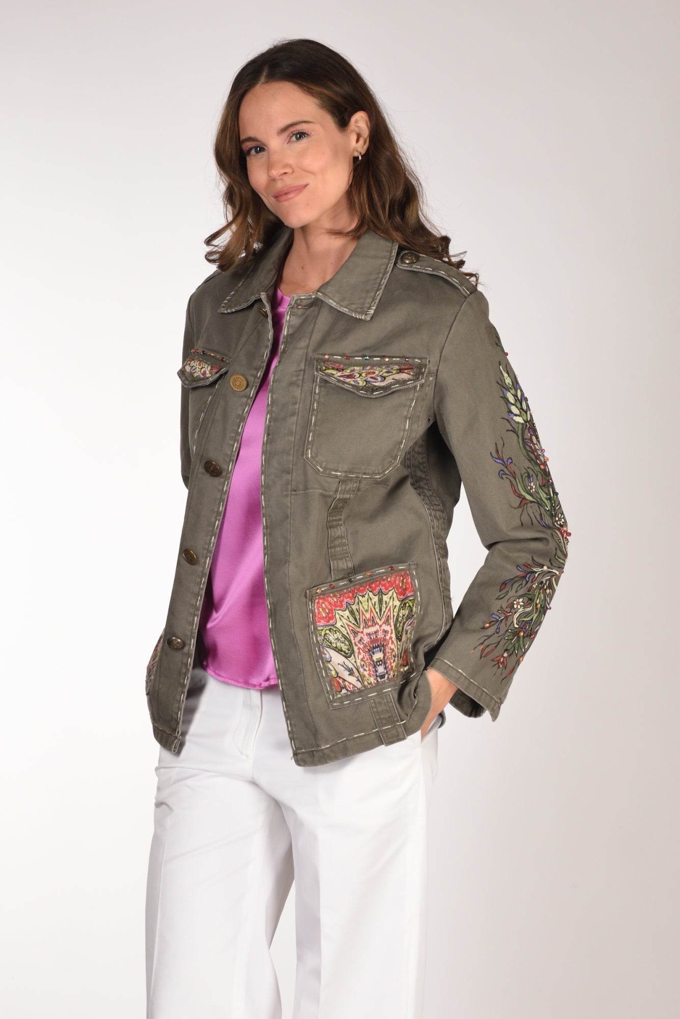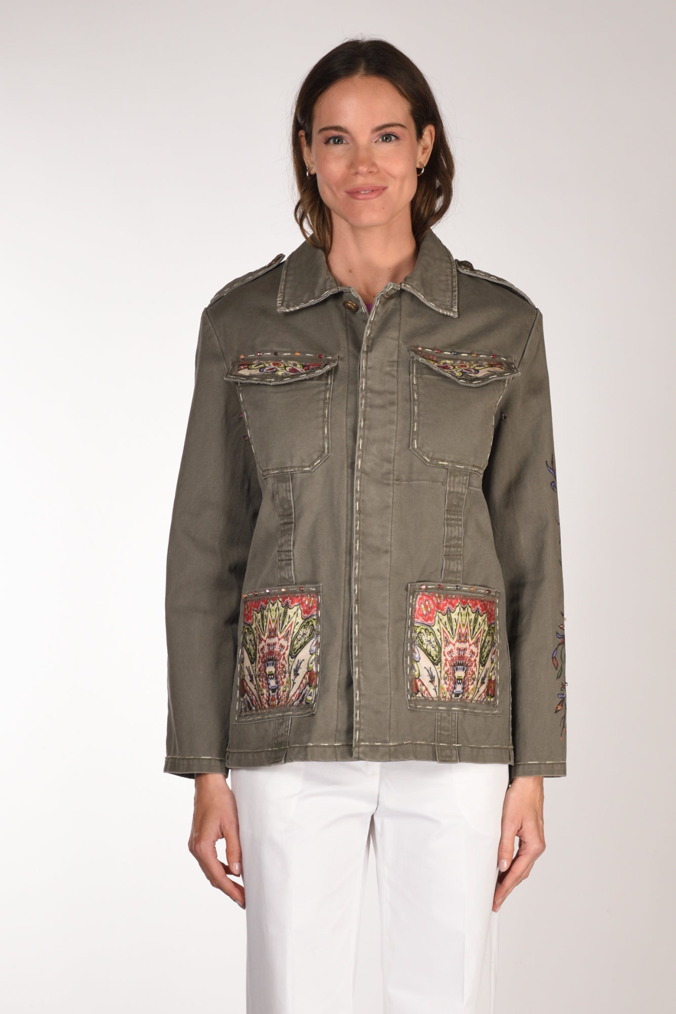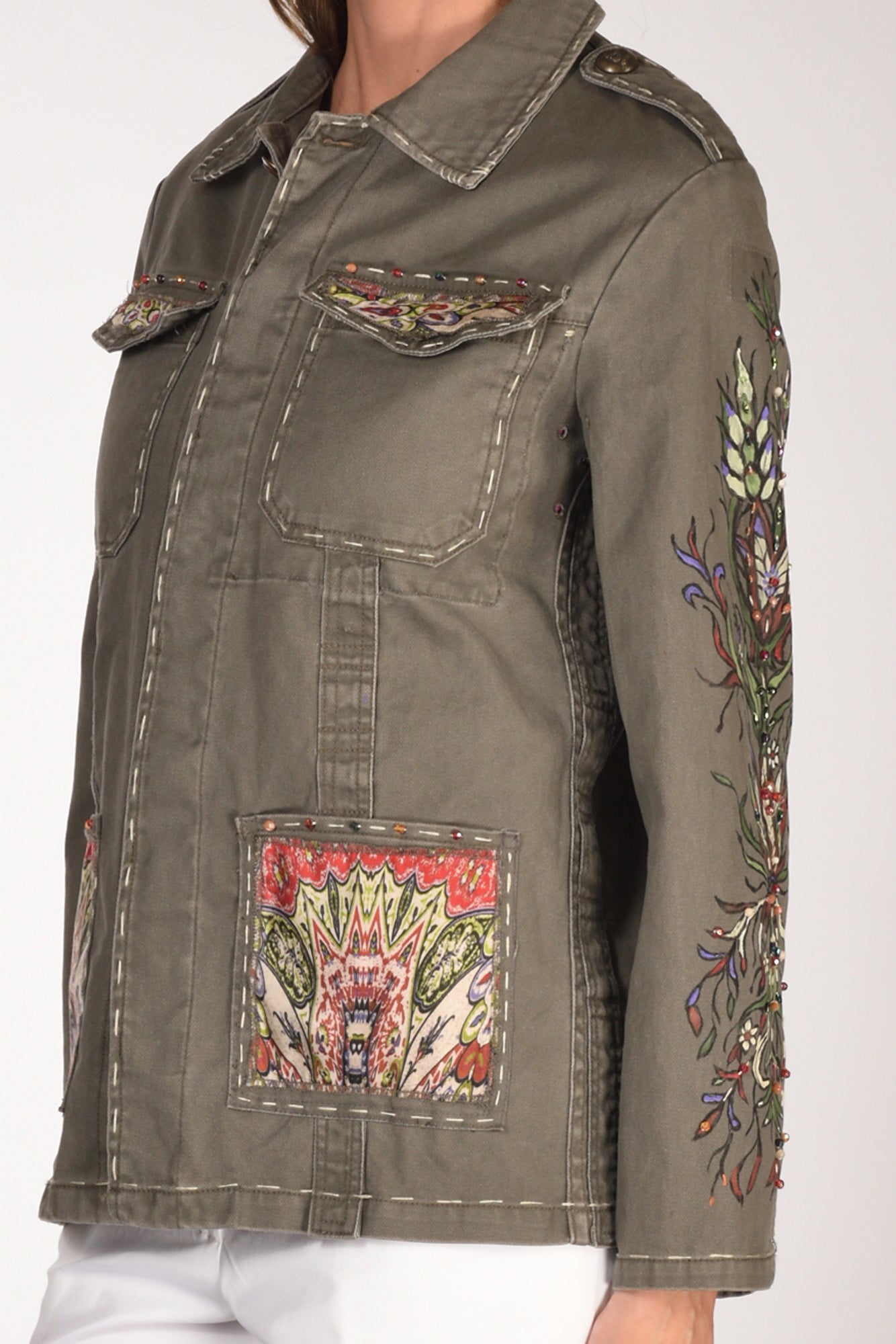 Giacca Modello Moleskine Ramage, Decorato E Dipinto A Mano, Collo A Camicia, Chiusura Bottoni Metallici Nascosti, Manica Lunga Con Polso Regolabile A Due Bottoni, Alamari Sulle Spalle Con Bottone, Tasche Frontali Applicate Con Patch A Contrasto, Le Superiori Chiuse Con Patta, Profilo Con Impunture, Linea Diritta, Vestibilita' Morbida, Made In Italy, Composizione 100 Cotone