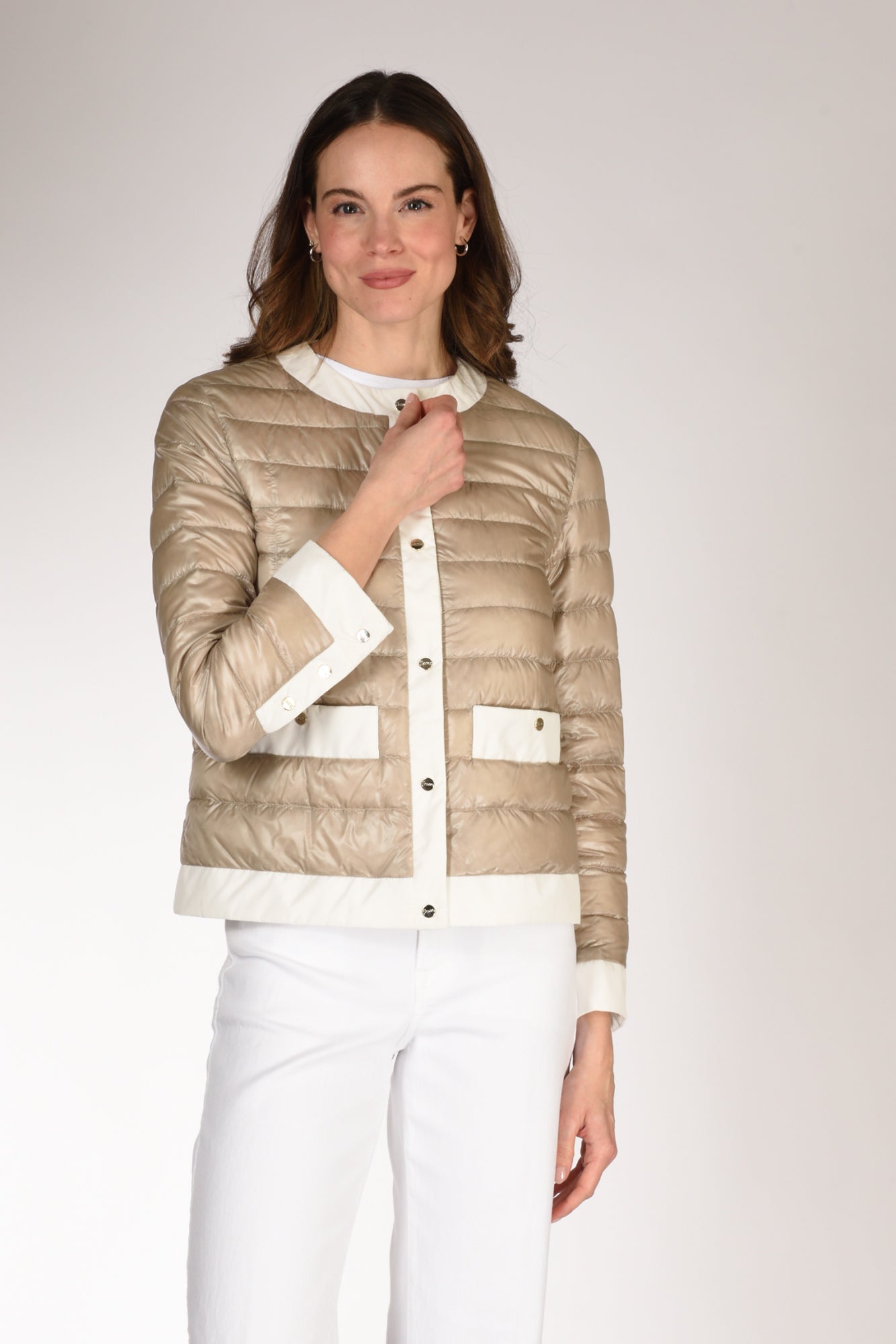 Piumino Girocollo, Tasche Frontali Applicate Chiuse Da Bottoni A Pressione, Chiuso Frontalmente Da Bottoni A Pressione, Bordi Maniche, Tasche, Collo E Parte Frontale Contrasto Colore, Vestibilita' Regular, Composizione 100 Poliammide, Imbottitura 90 Piumino, 10 Piuma, Made In Romania