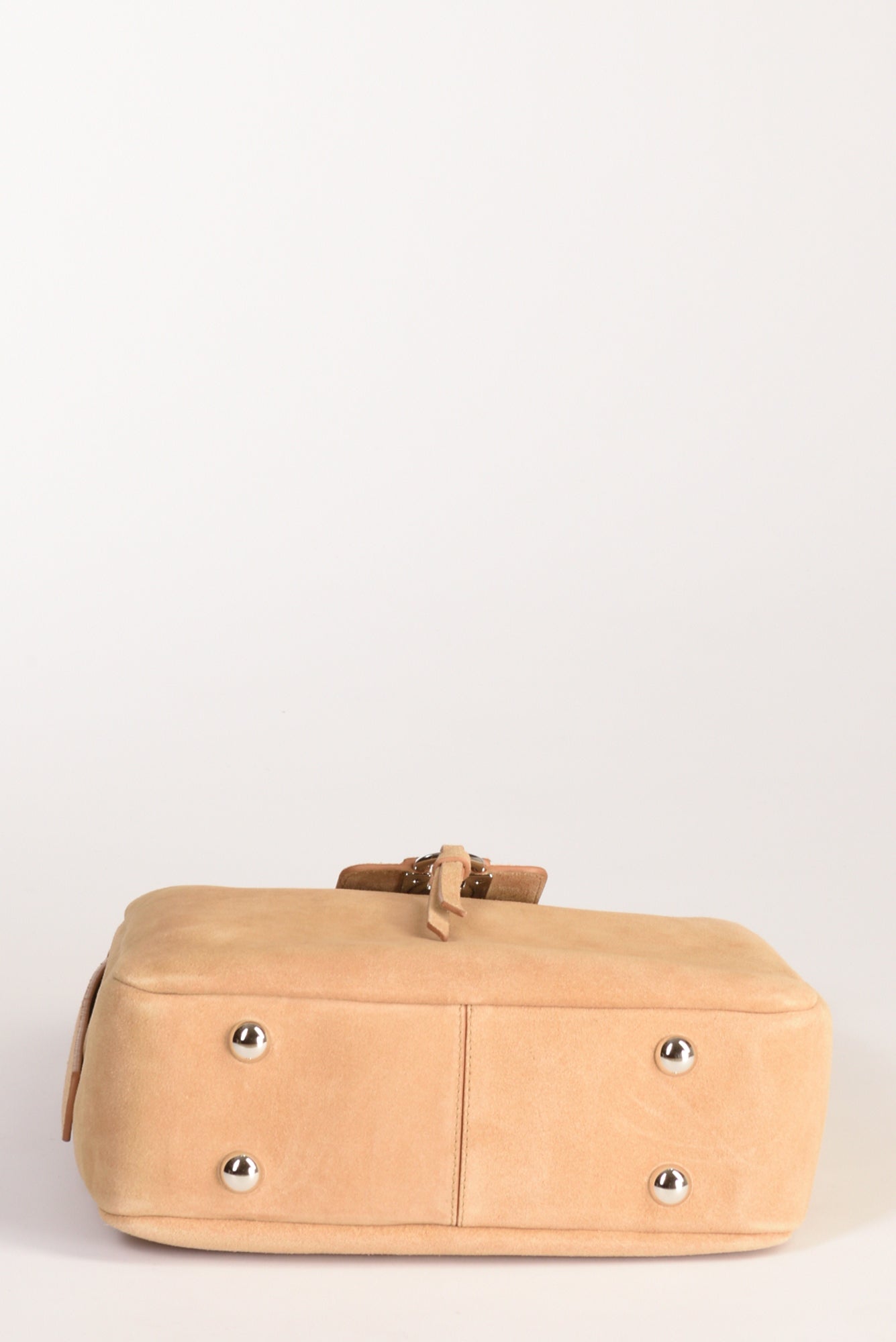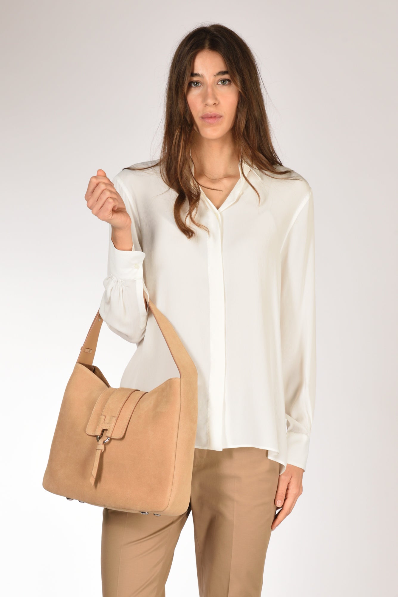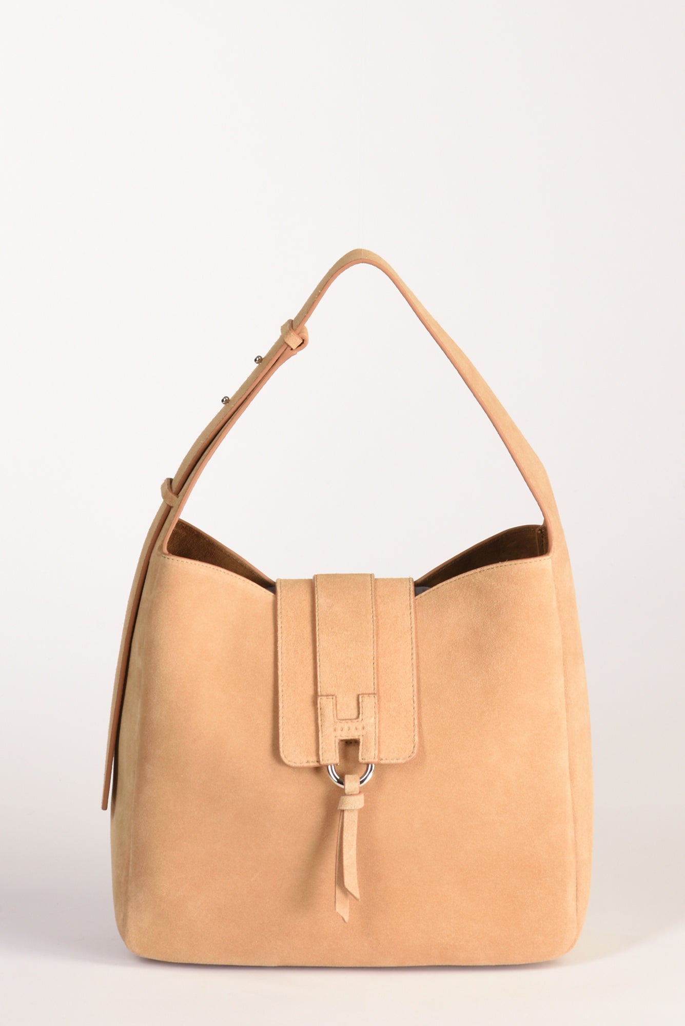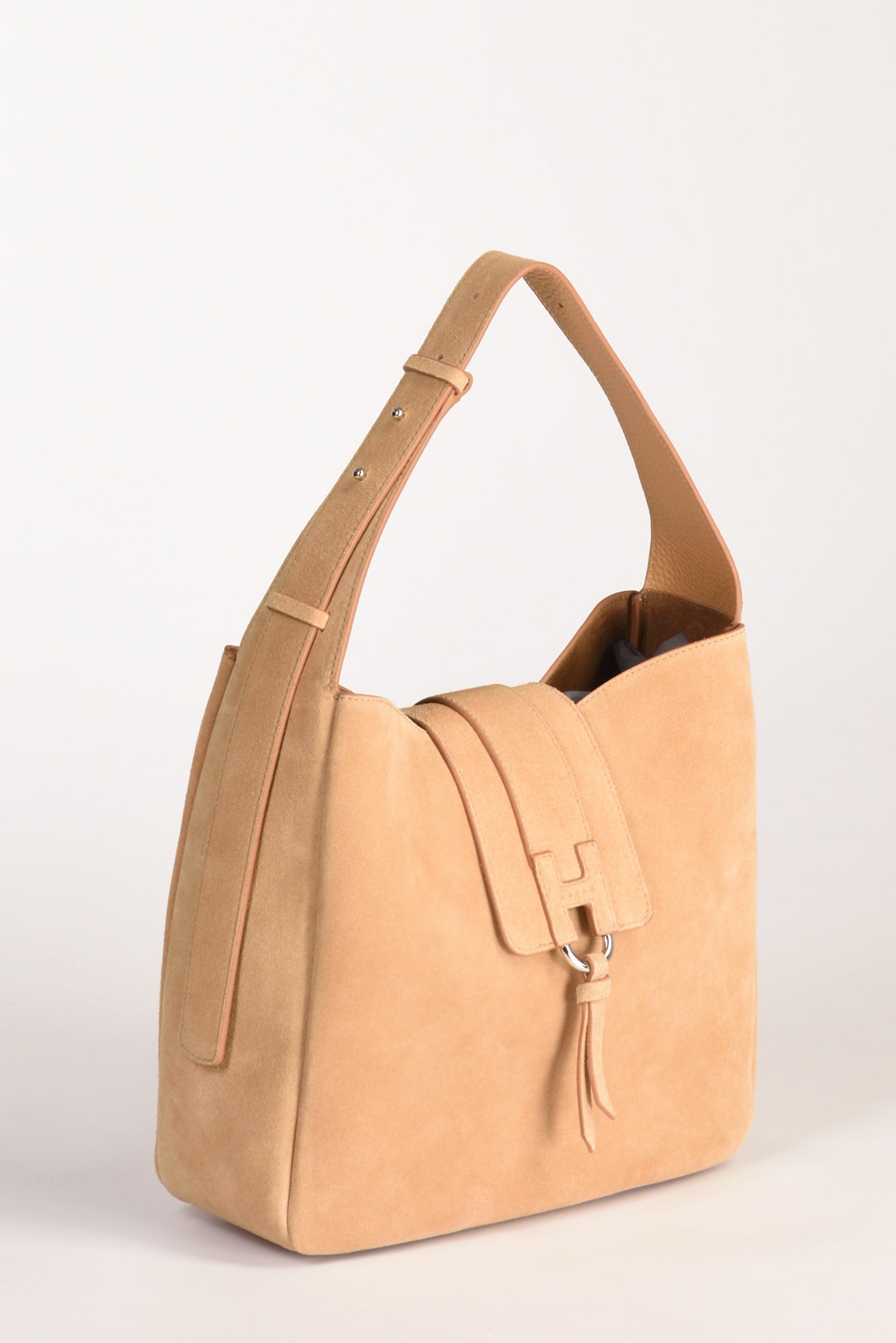Borsa Hobo Con Manico A Spalla Regolabile, Realizzata In Pelle Scamosciata, Chiusa Da Pattina E Bottone Magnetico, Sulla Chiusura H In Rilievo Con Logo Impresso E Nappine, Sfoderata, Tasca Interna, Piedini In Metallo, Composizione Pelle, Made In India, Dimensioni 28x29x9