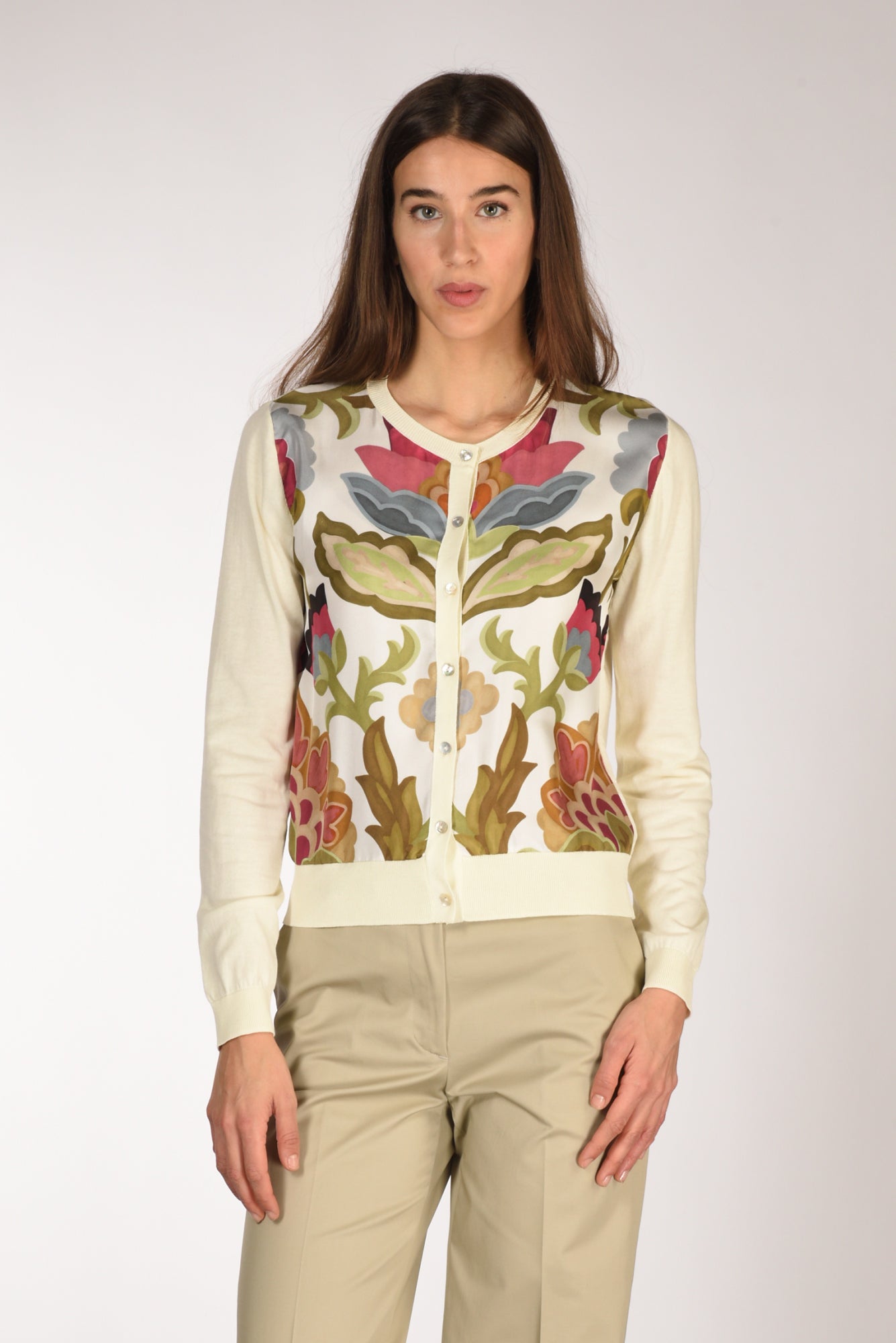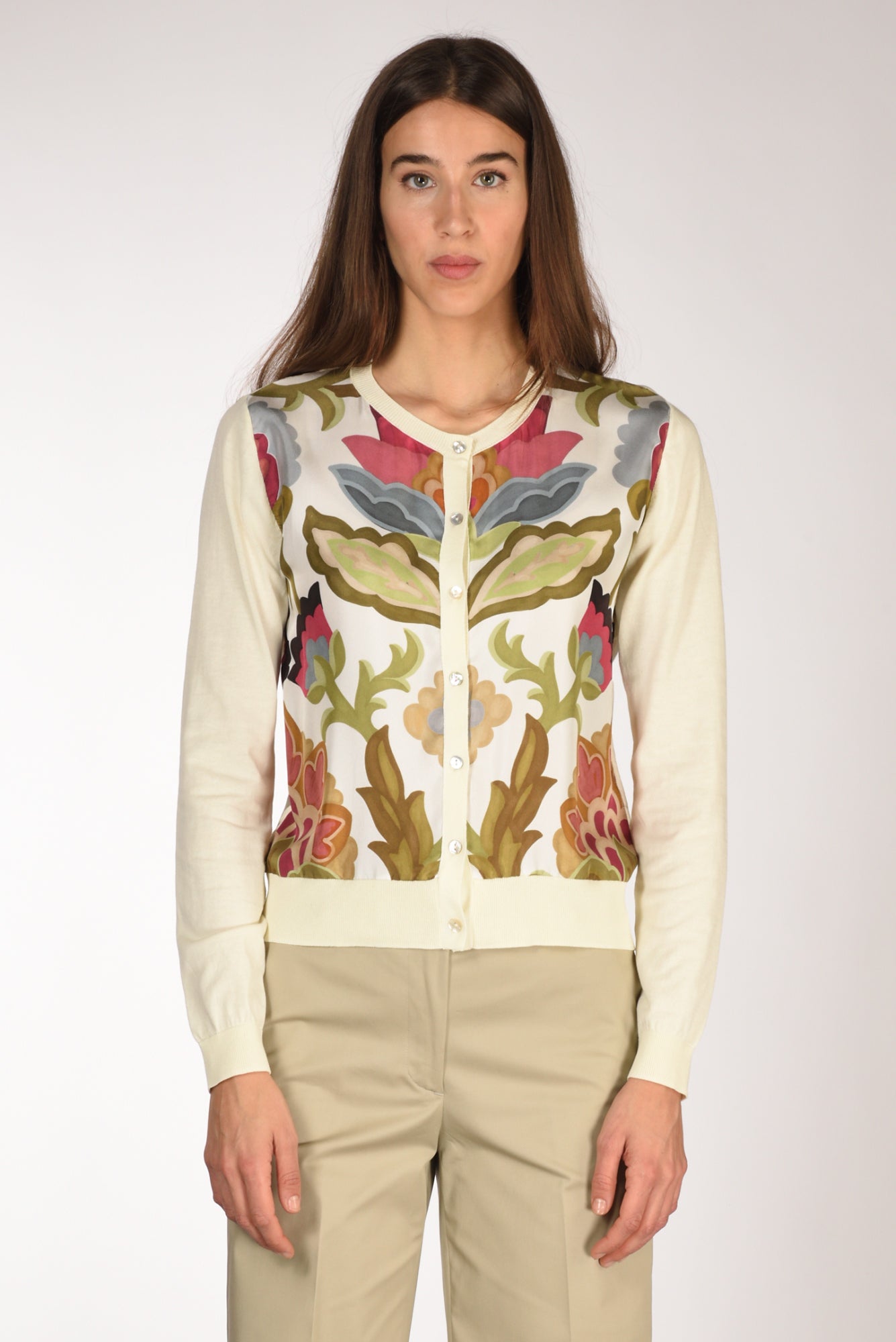 Cardigan Girocollo Bi Tessuto, Maniche Lunghe, Chiuso Frontalmente Da Bottoni A Vista, Parte Frontale In Seta Stampata, Vestibilita' Regular, Composizione 60 Cotone, 40 Viscosa, 100 Seta, Made In Italy