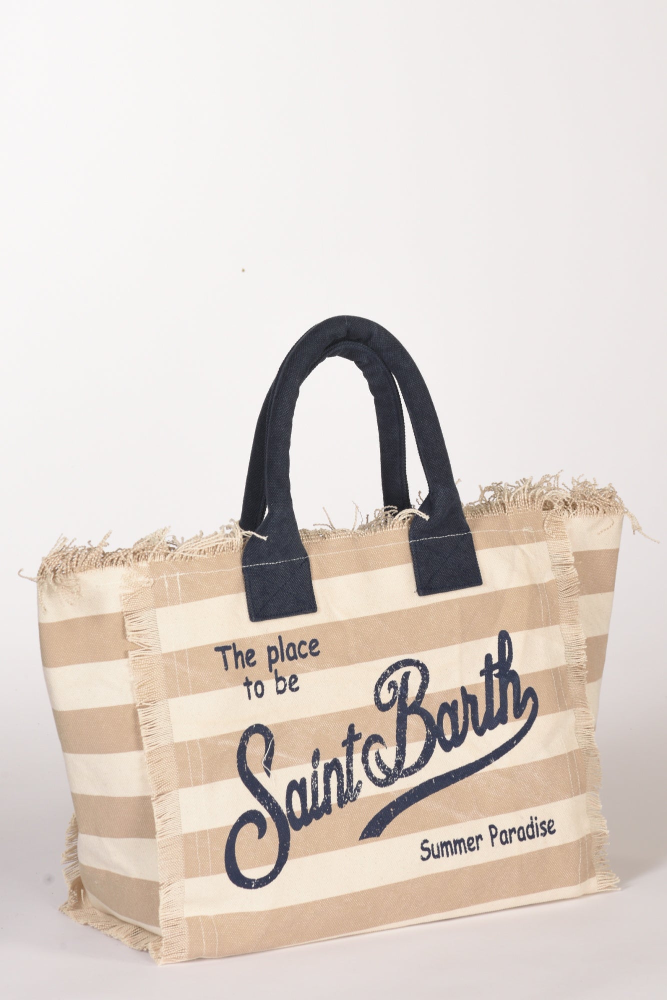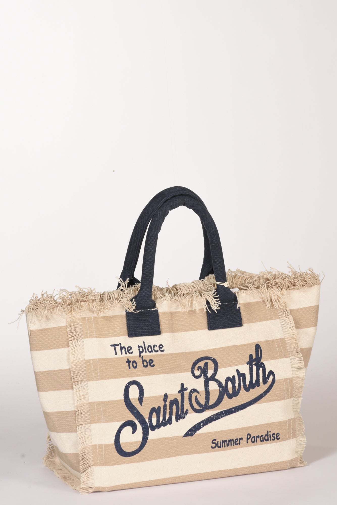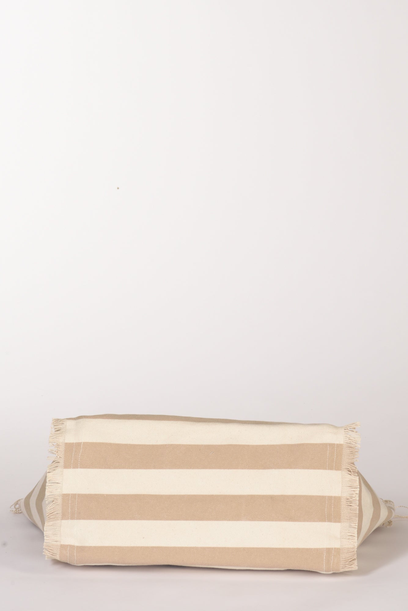 Shopper Foderata A Righe, Fondo Morbido, Frange Laterali, Logo Stampato Ambo I Lati, Chiusura Zip Centrale, Due Tasche Interne Multiuso Di Cui Una Zippata, Dimensioni 40x32x18, Luce Manico 15 Cm, Made In India, Composizione 100 Cotone, Fodera 100 Cotone
