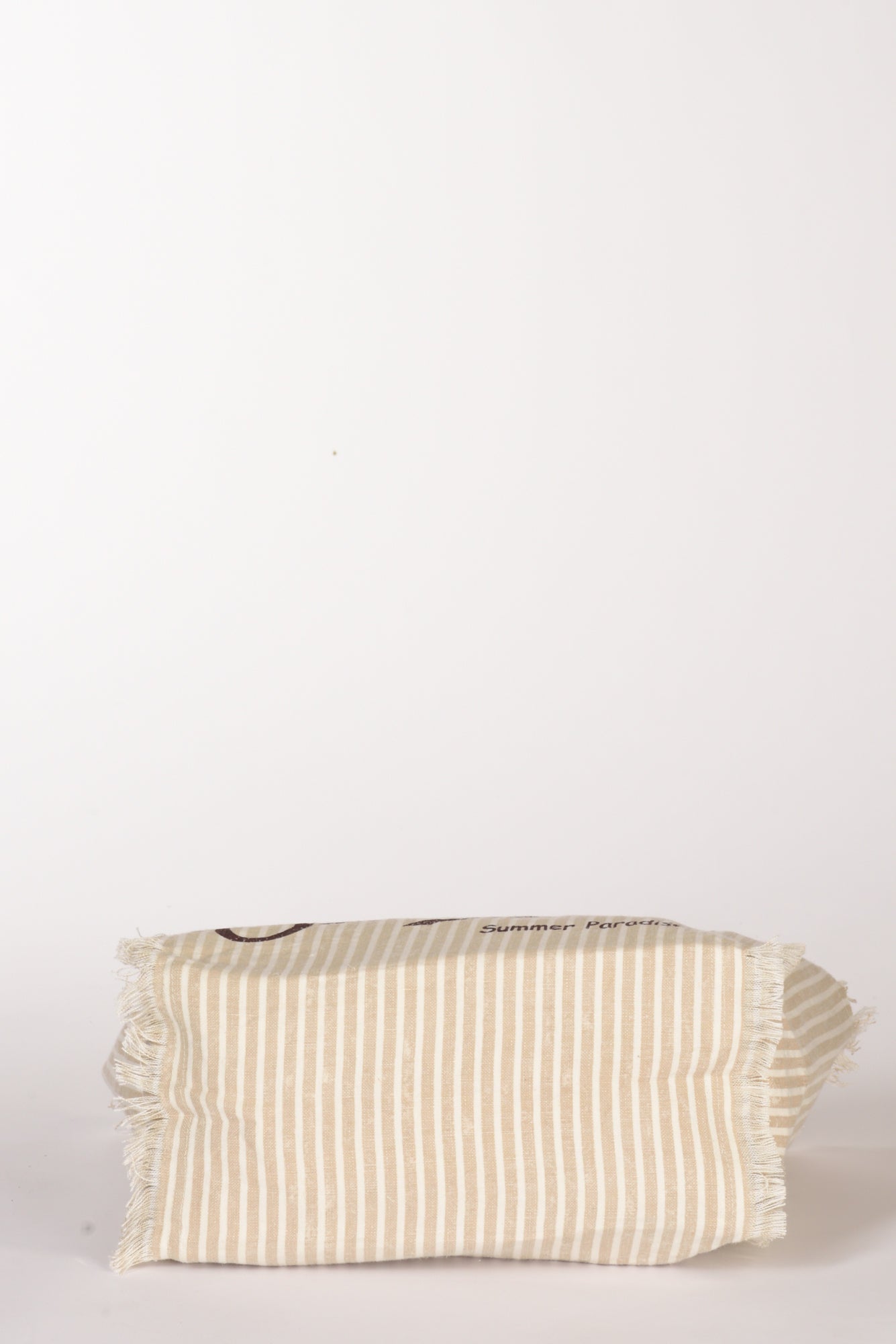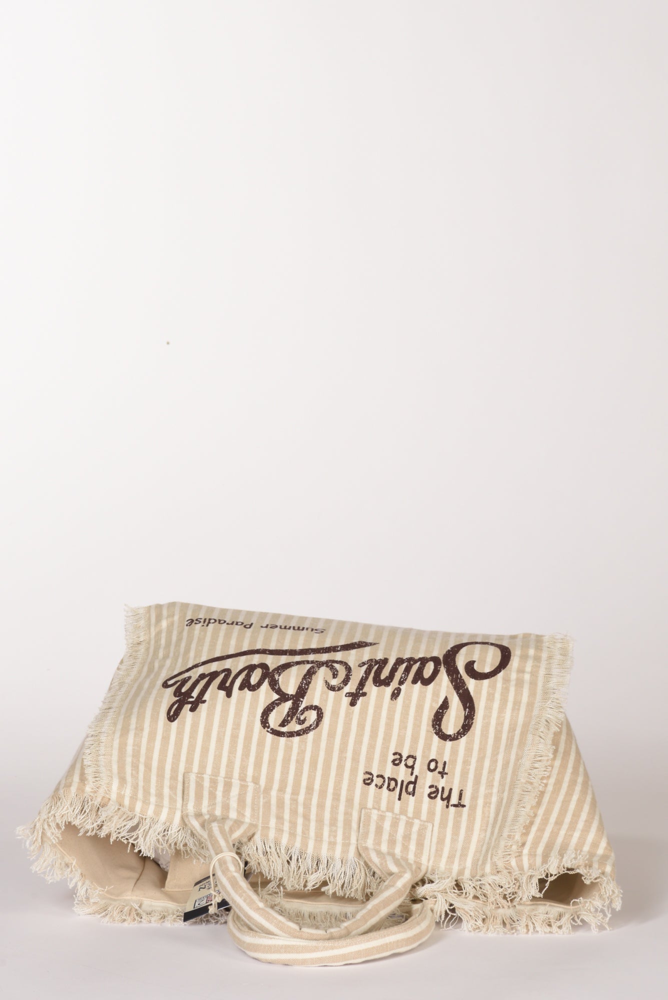 Shopper Rigata Foderata, Fondo Morbido, Frange Laterali, Logo Stampato Ambo I Lati, Chiusura Zip Centrale, Due Tasche Interne Multiuso Di Cui Una Zippata, Dimensioni 40x32x18, Luce Manico 15 Cm, Made In India, Composizione 100 Lino, Fodera 100 Cotone