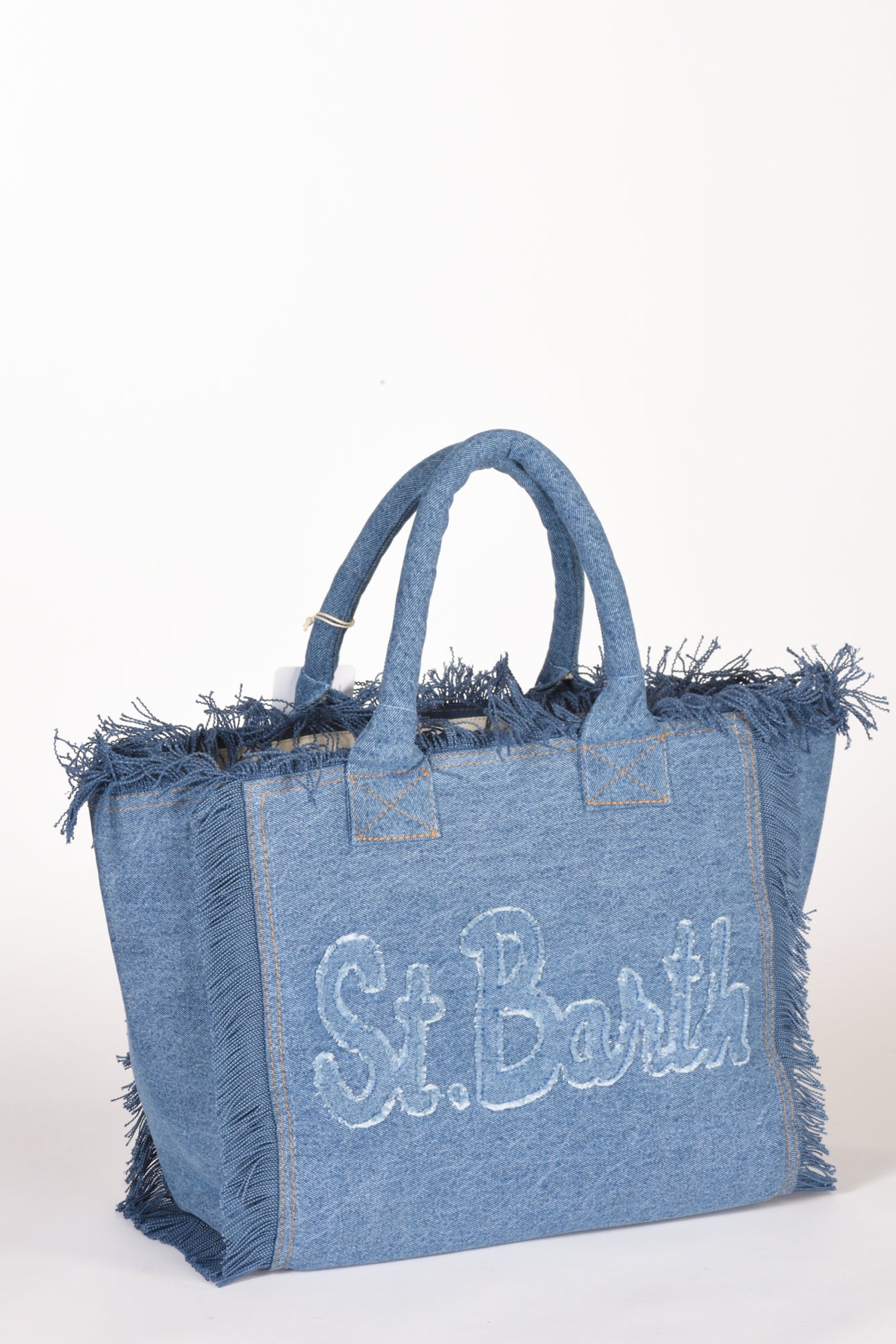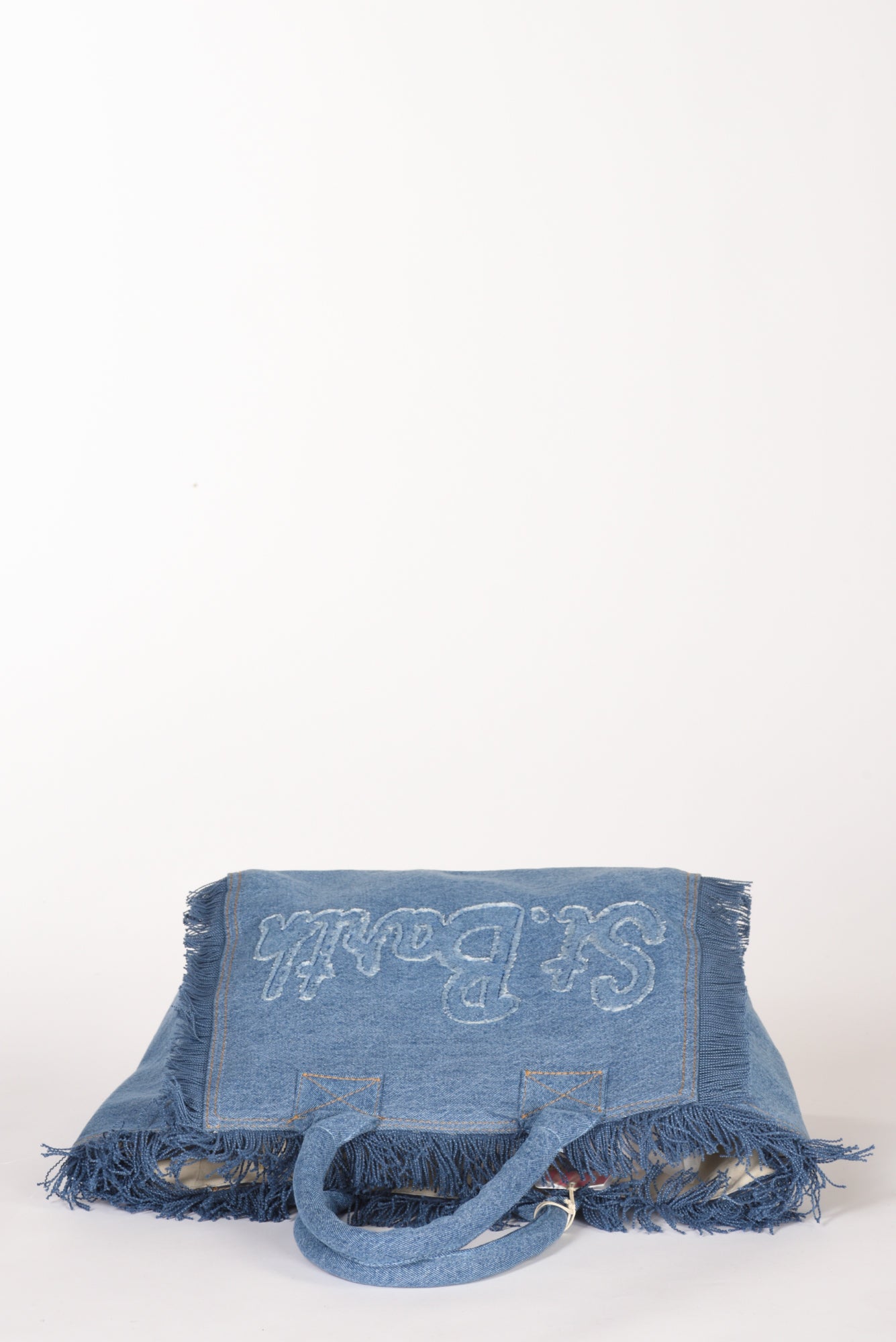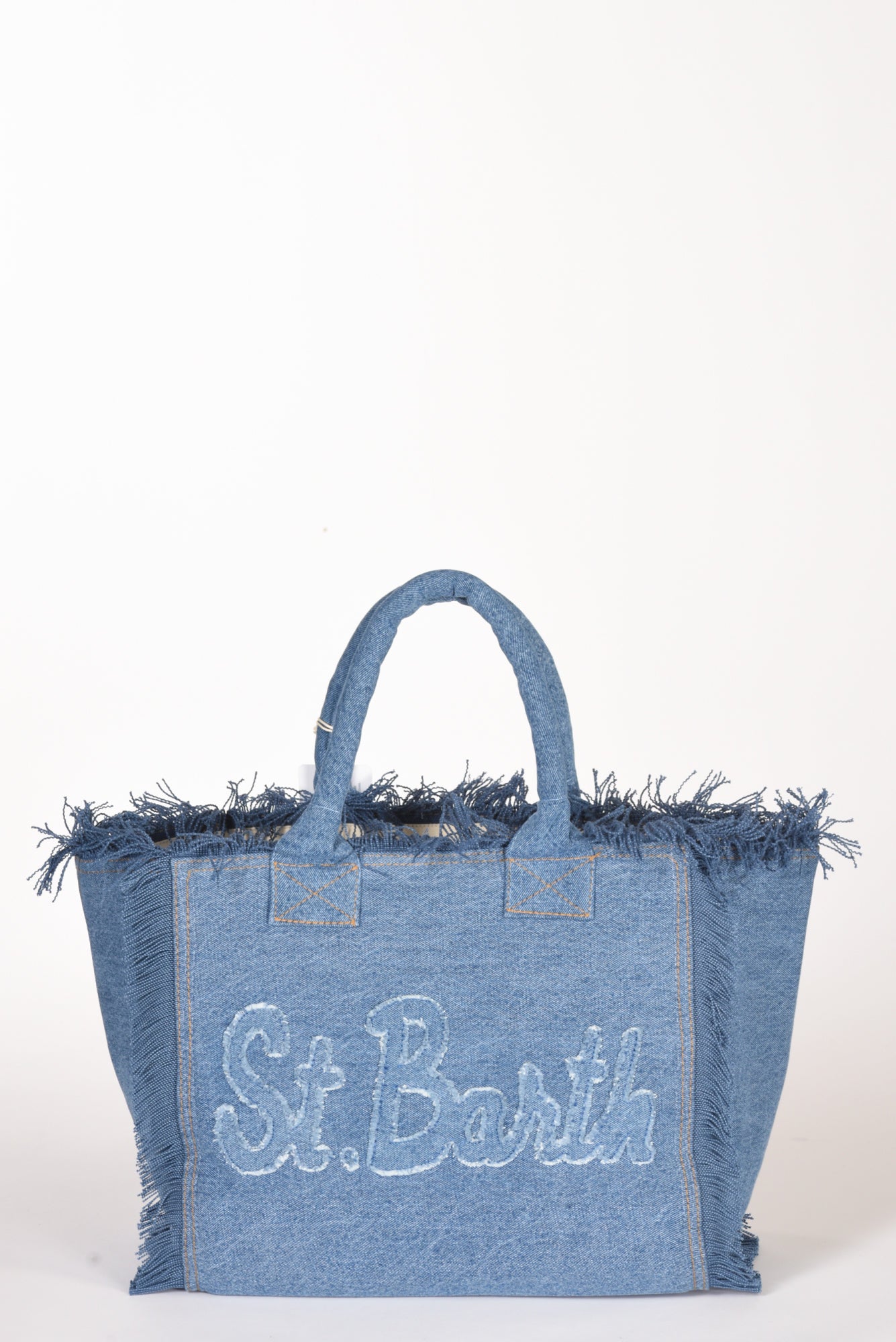 Shopper Realizzata In Tessuto Denim, Foderata, Fondo Morbido, Frange Laterali, Logo Applicato E Cucito Ambo I Lati, Chiusura Zip Centrale, Due Tasche Interne Multiuso Di Cui Una Zippata, Dotata Di Tracolla Di Servizio, Dimensioni 19x19x9, Made In India, Composizione 100 Cotone, Fodera 100 Cotone