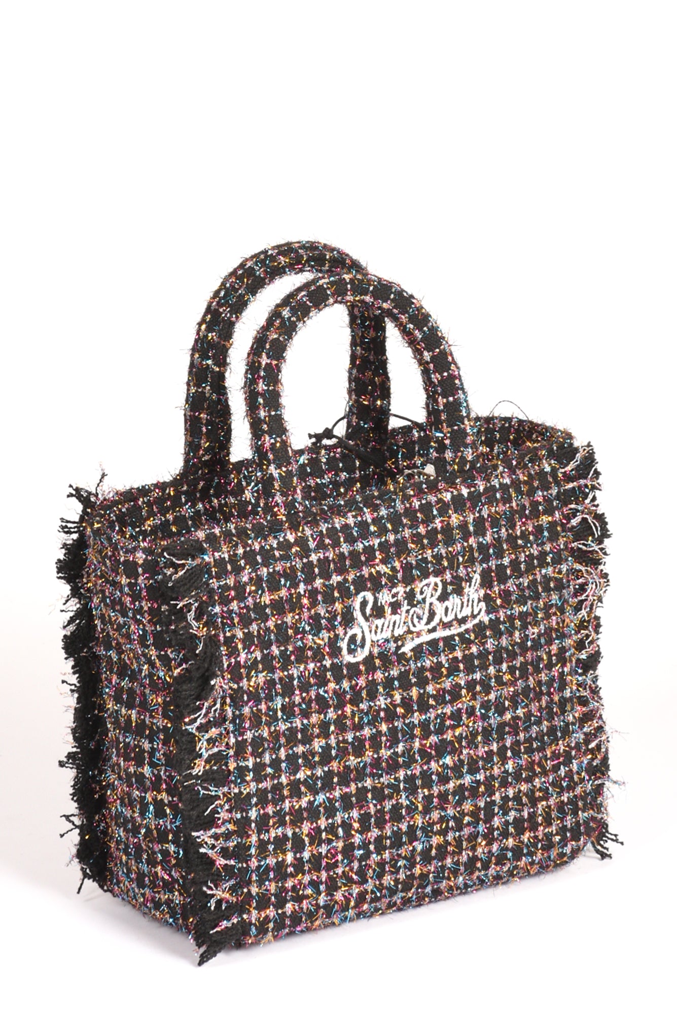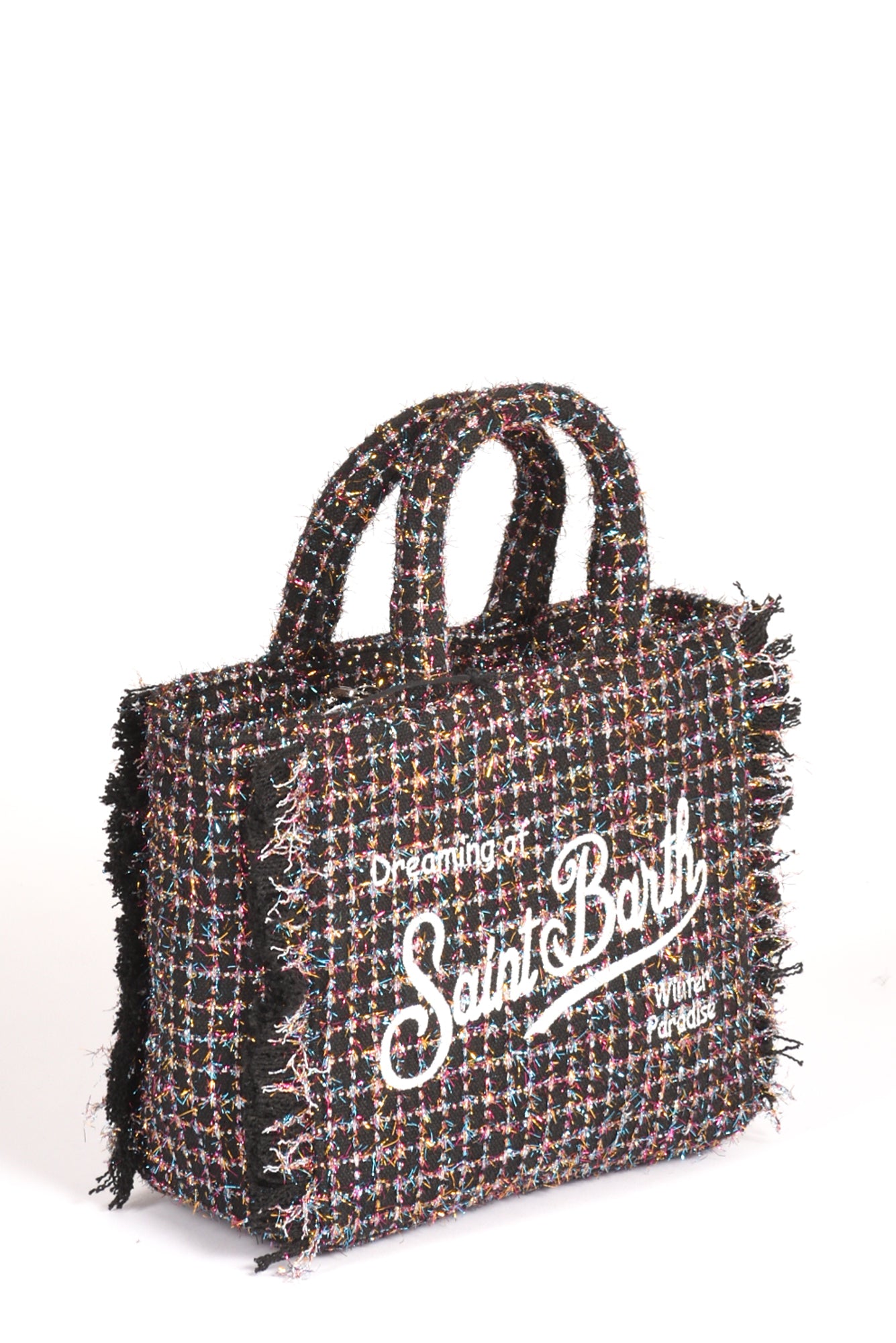 Borsa Effetto Tweed, Foderata, Fondo Con Piedini, Frange Laterali, Logo Ambo I Lati, Chiusura Zip Centrale, Due Tasche Interne Multiuso Di Cui Una Zippata, Tracolla Removibile, Composizione 85 Poliestere 15 Lana, Made In China, Dimensioni 20.