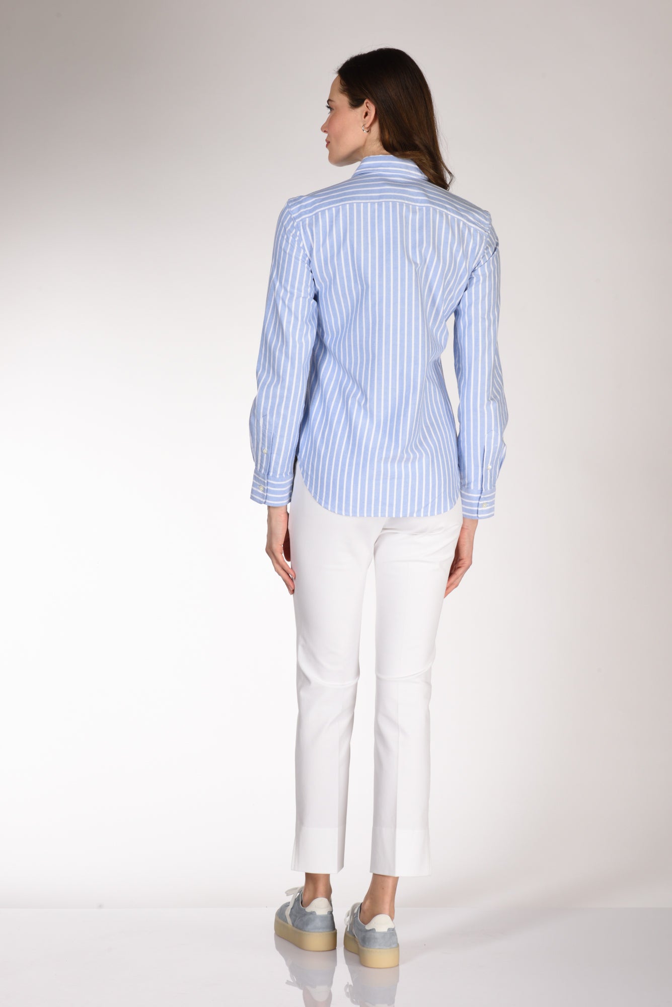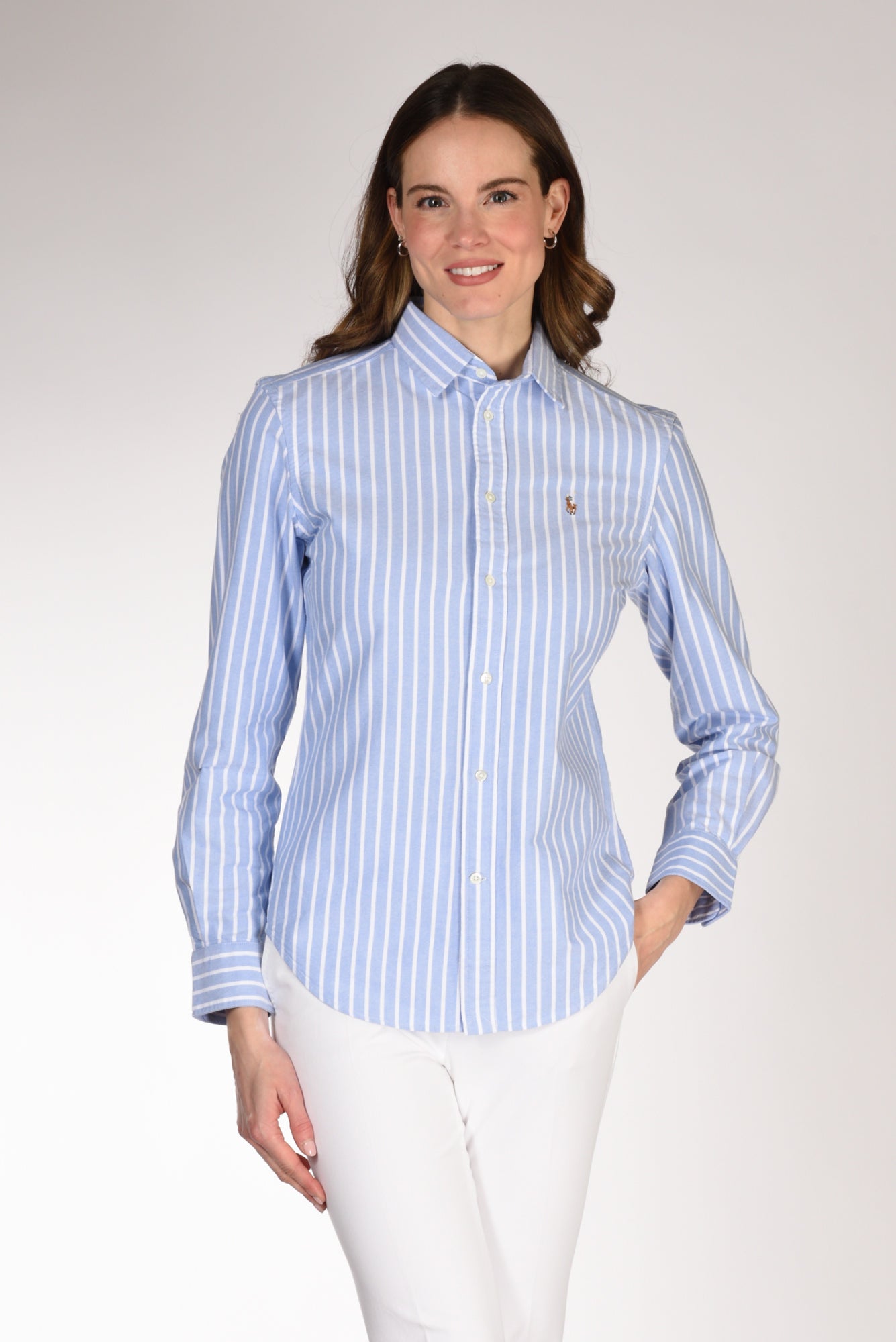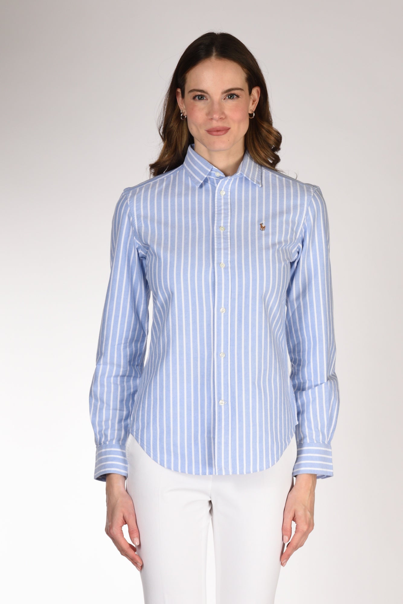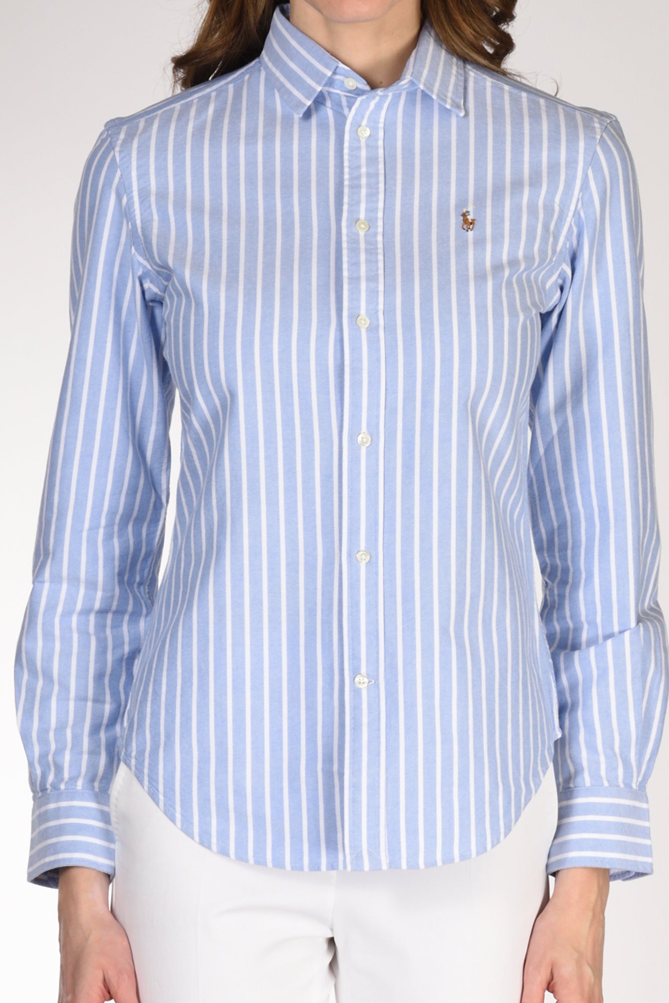 Camicia Rigata A Manica Lunga, Leggermente Sfiancata, Orlo Stondato, Logo Frontale Ricamato, Chiusa Da Bottoni Vista, Vestibilita' Regular, Composizione 100 Cotone, Made In Indonesia.