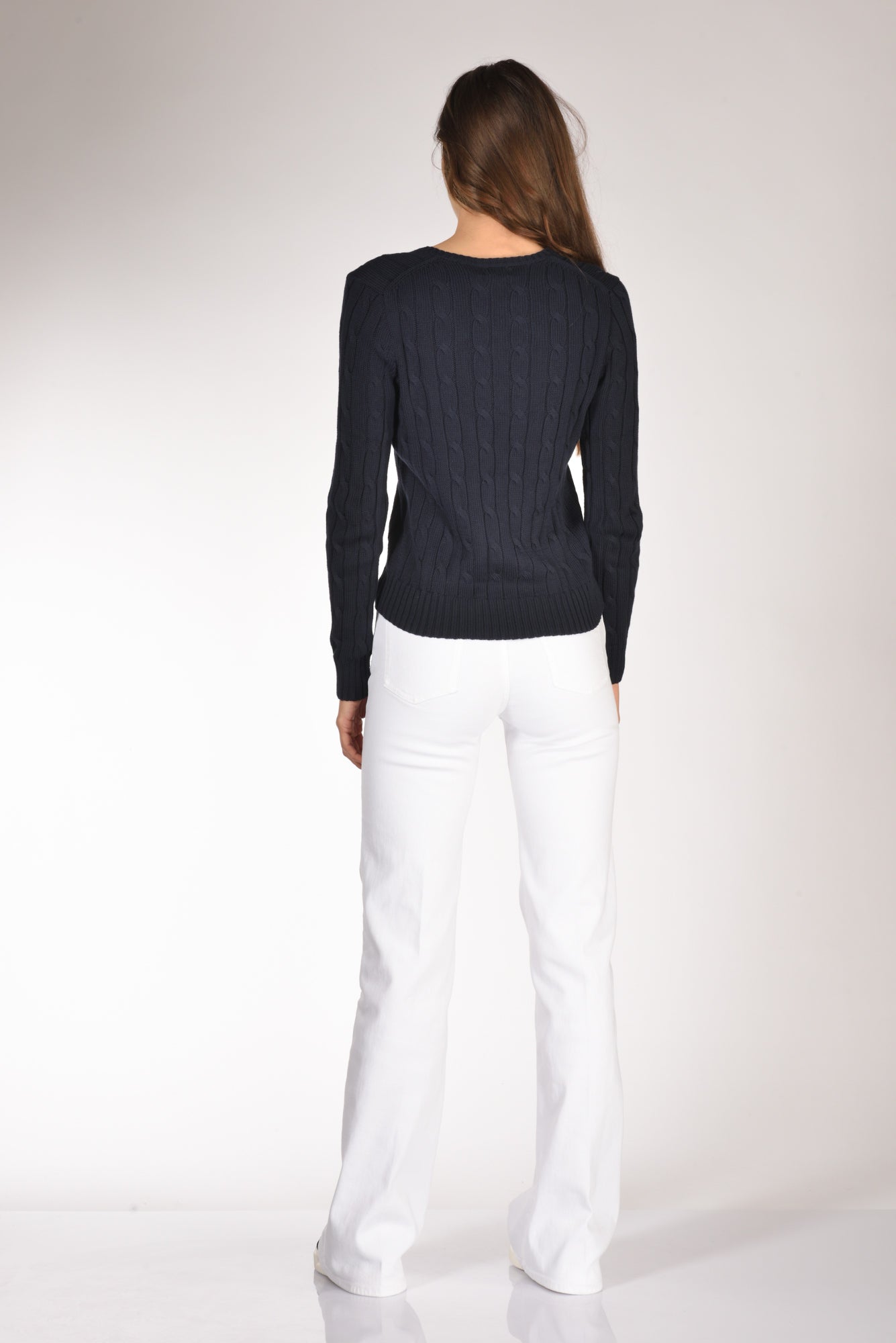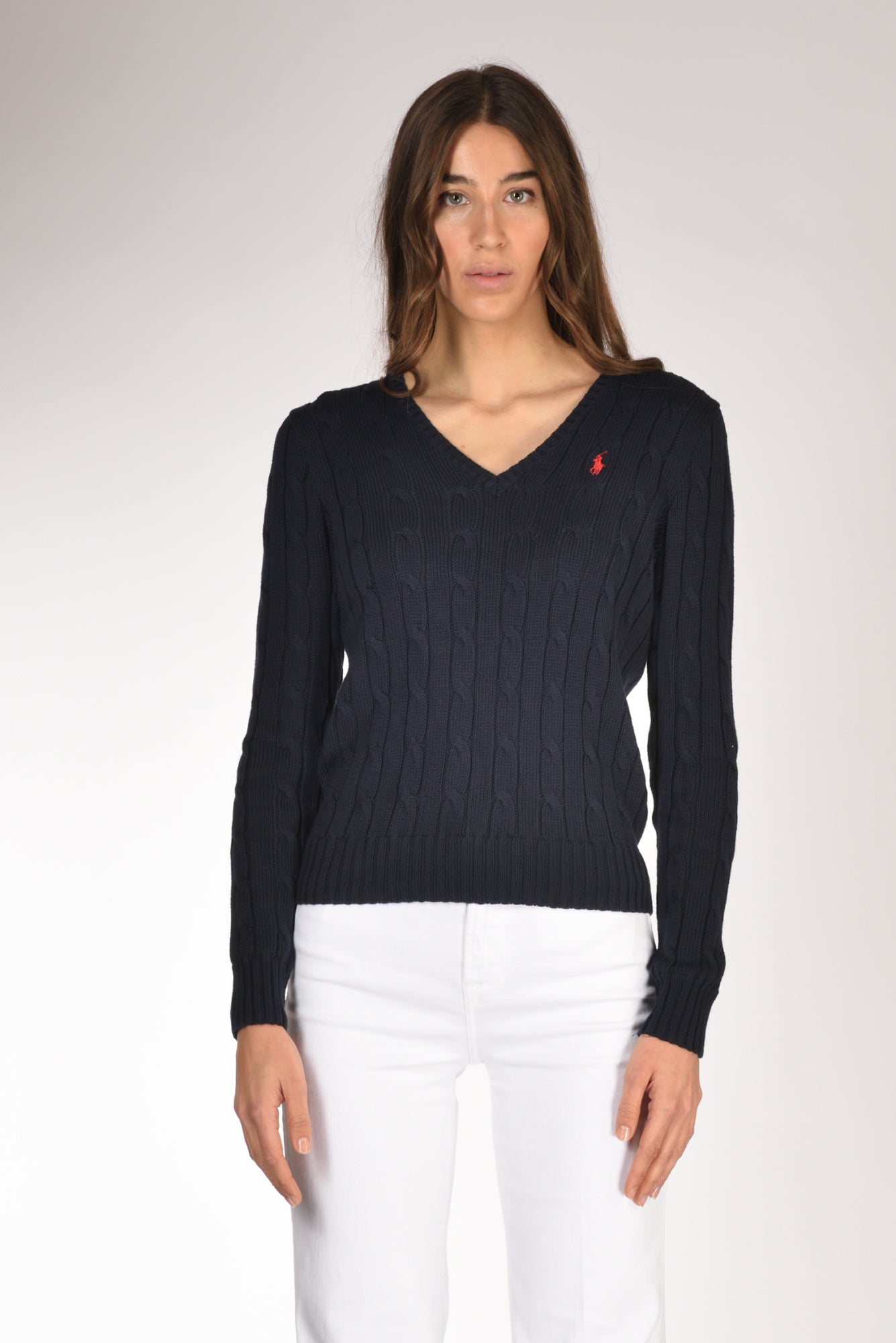 Maglia Scollo A V, Manica Lunga, Lavorazione Trecce, Bordi A Coste, Logo Frontale Ricamato, Vestibilita' Slim, Made In Cina, Composizione100 Cotone