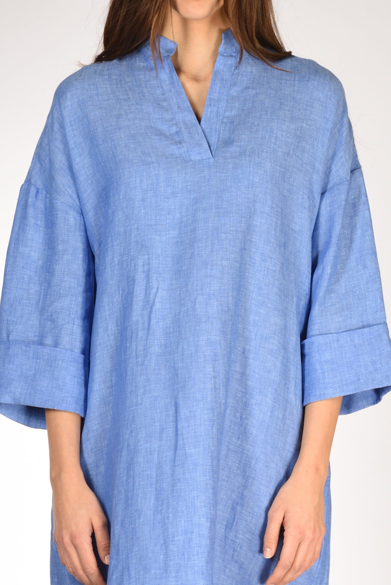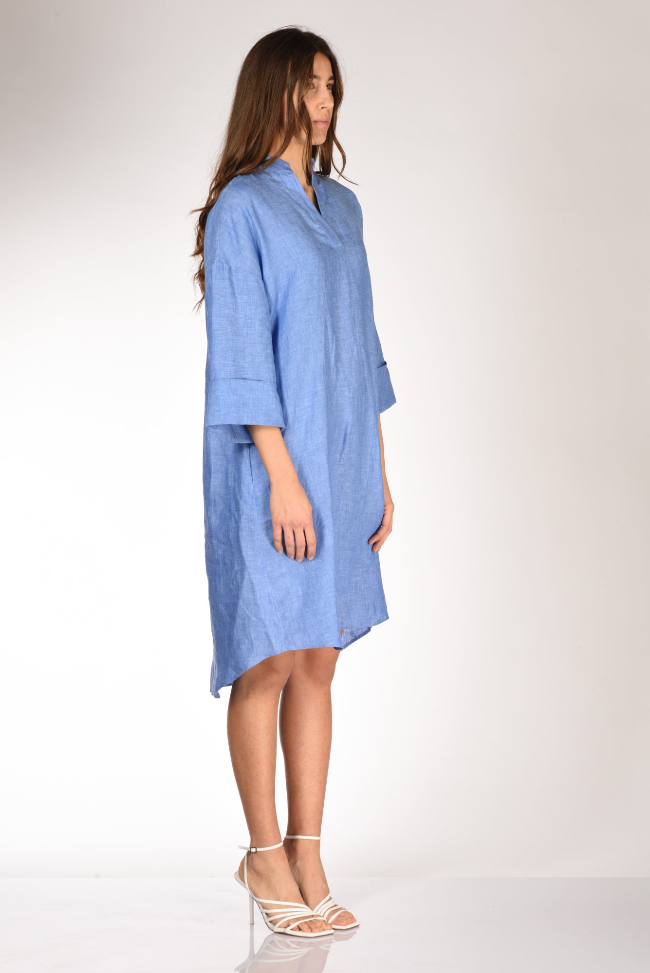 Abito Over, Scollo Serafino, Spalla Scesa, Manica 3/4 Con Risvolto, Tasche Inserite Lateralmente, Sfondo Piega Posteriore, Fondo Stondato Ed Asimmetrico, Vestibilita' Over, Made In Tunisia, Composizione 100 Lino