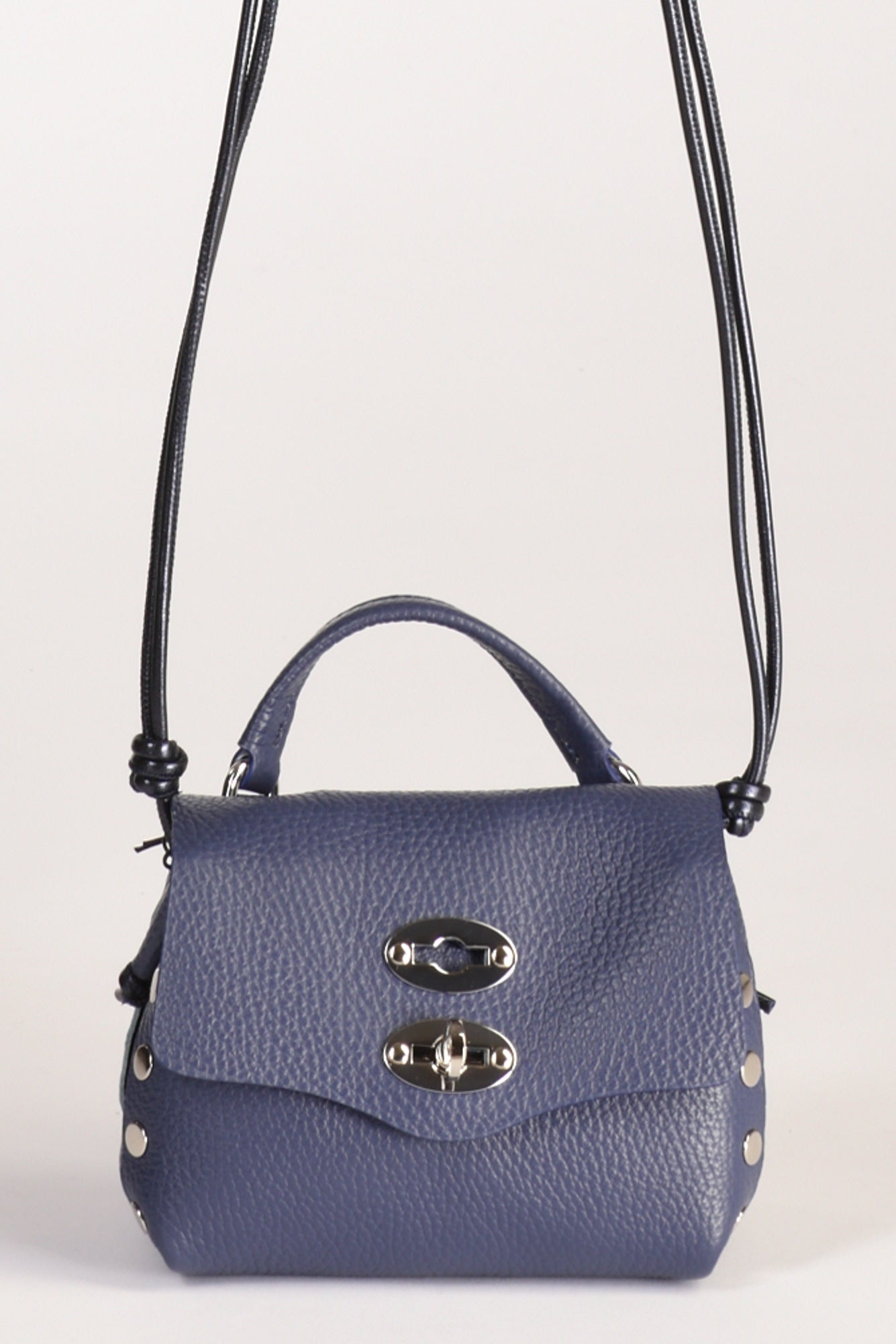 Borsa A Mano Modello Postina, Chiusura A Girello Con Patta Battente, Tracolla Fissa Regolabile, Lavorazione Pelle Martellata, Internamente Presenta Una Tasca Multiuso, Lateralmente Borchie Argentate A Vista, Fondo Senza Piedini,composizione 100 Pelle Bovina, Interno 100 Poliestere, Made In Italy, Misure Cm 16x10x10 Luce Tracolla 43 Cm, Luce Manico 5.