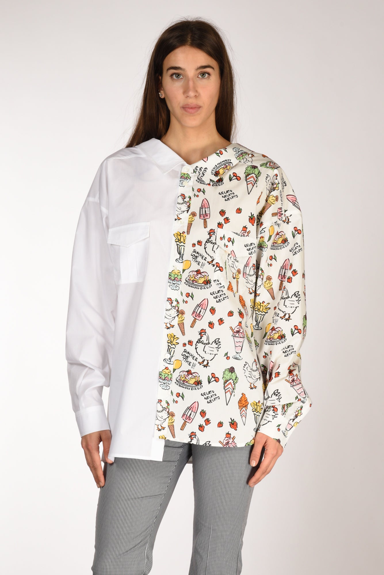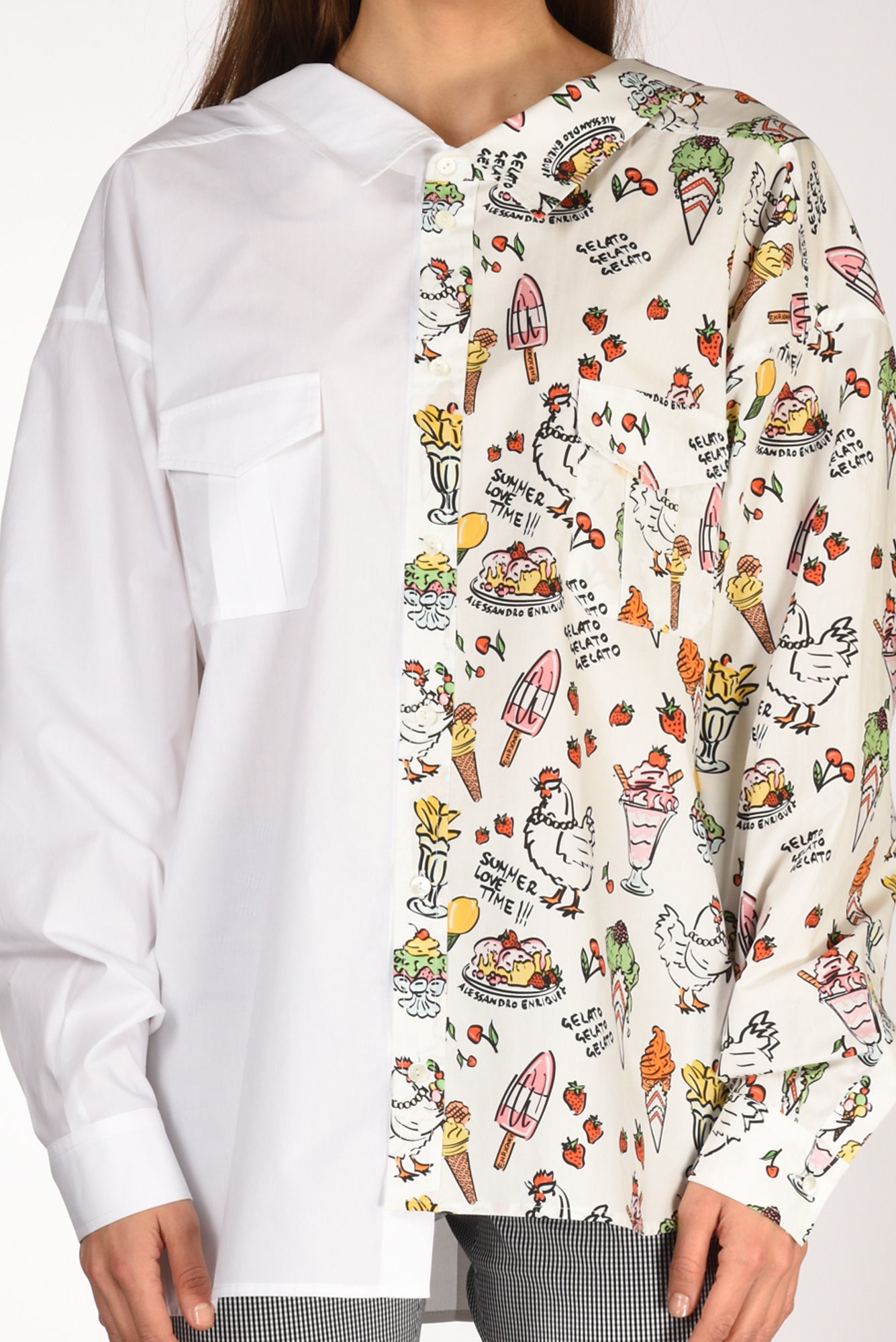 Camicia Over Stampata, Profondo Scollo V Con Colletto Fronte E Retro, Spalla Scesa, Maniche Lunghe Chiuse Da Polsino Con Bottone, Tasche Applicate Frontali, Chiusura Bottoni A Vista, Fondo Stondato Ed Asimmetrico, Vestibilita' Over, Made In Italy, Composizione 100 Cotone