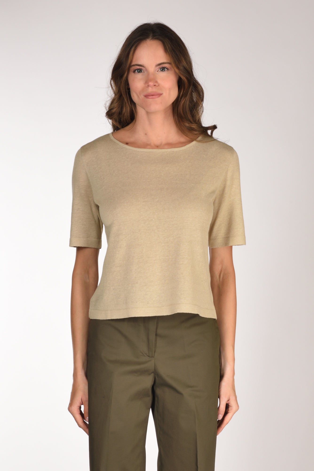 Maglia Manica Al Gomito, Scollo A Barchetta, Linea Boxy, Vestibilita' Morbida, Made In Italy, Composizione 64 Lino, 36 Cotone