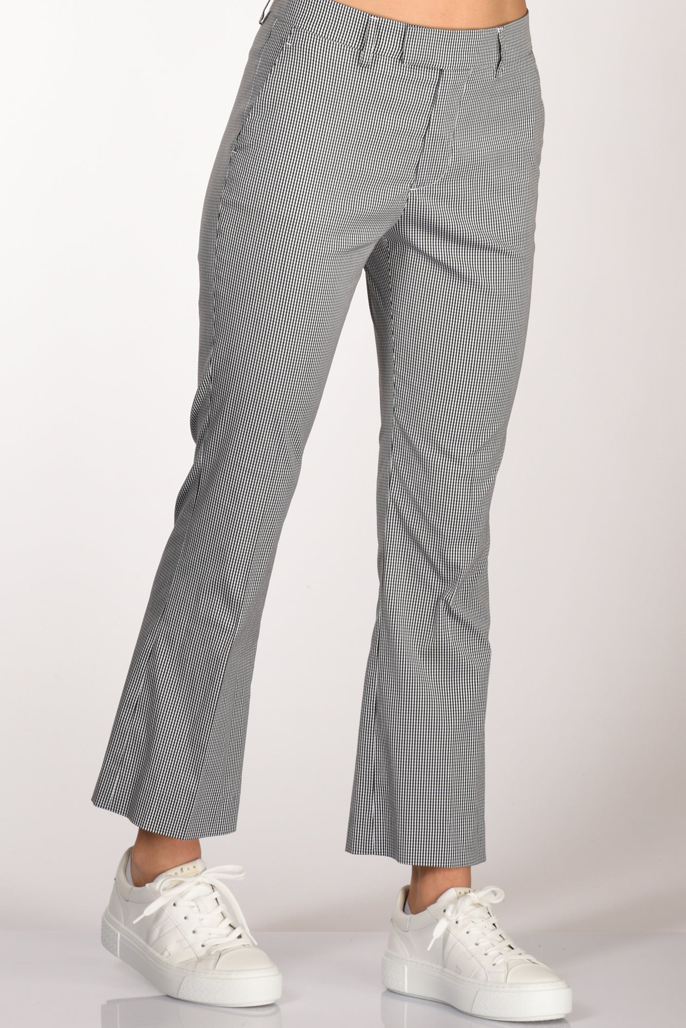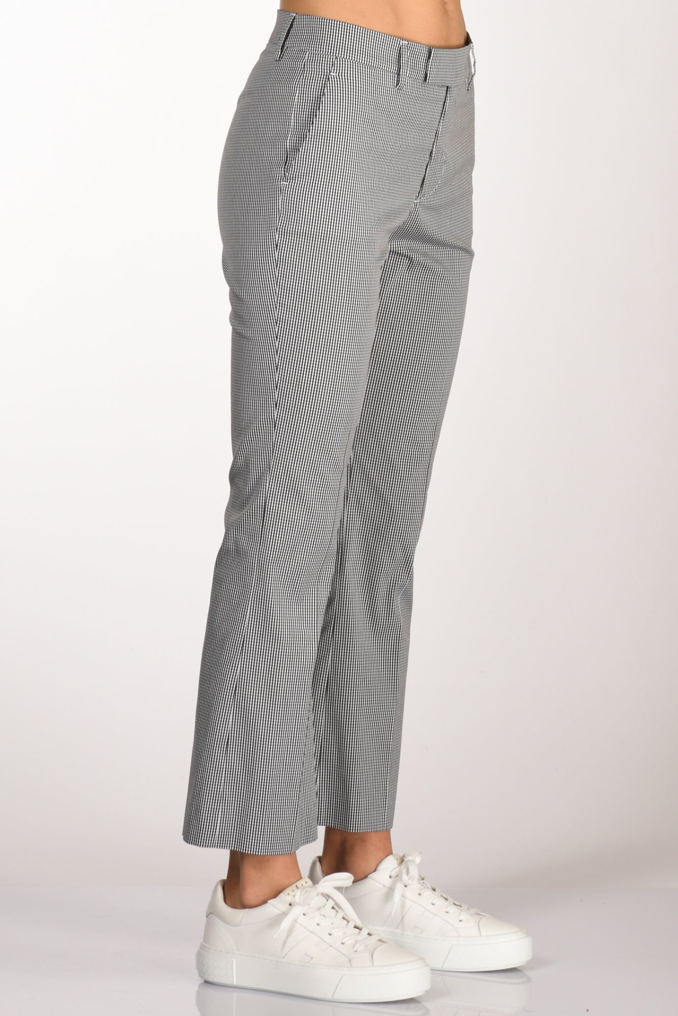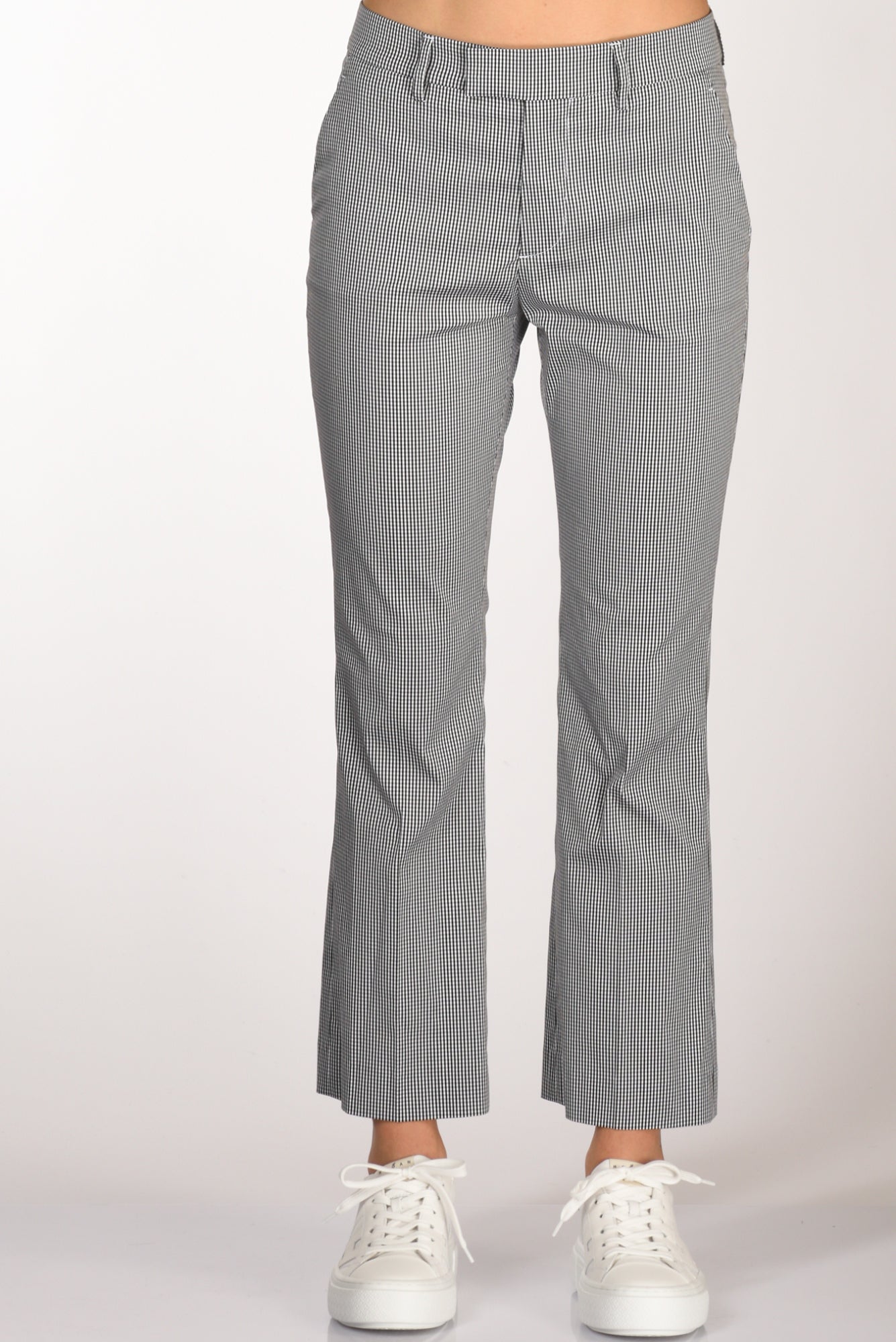 Pantaloni Fondo Trombetta, Stampa Micro Check, Passanti In Vita, Tasche Laterali Inserite, Chiusi Da Zip, Bottone E Gancio Nascosti, Vestibilita' Regular, Composizione 78 Cotone, 17 Poliammide, 5 Elastan, Made In Italy