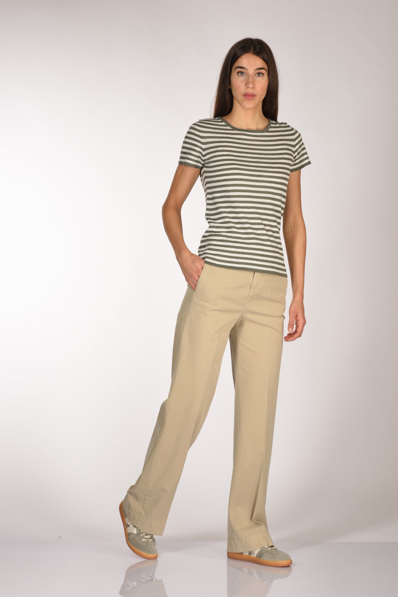 La modella in fotografia è alta 180 cm e misura seno 87 cm, vita 56 cm, fianchi 90 cm indossa la seguente taglia 40 o S mentre di jeans 26 e di calzatura 40