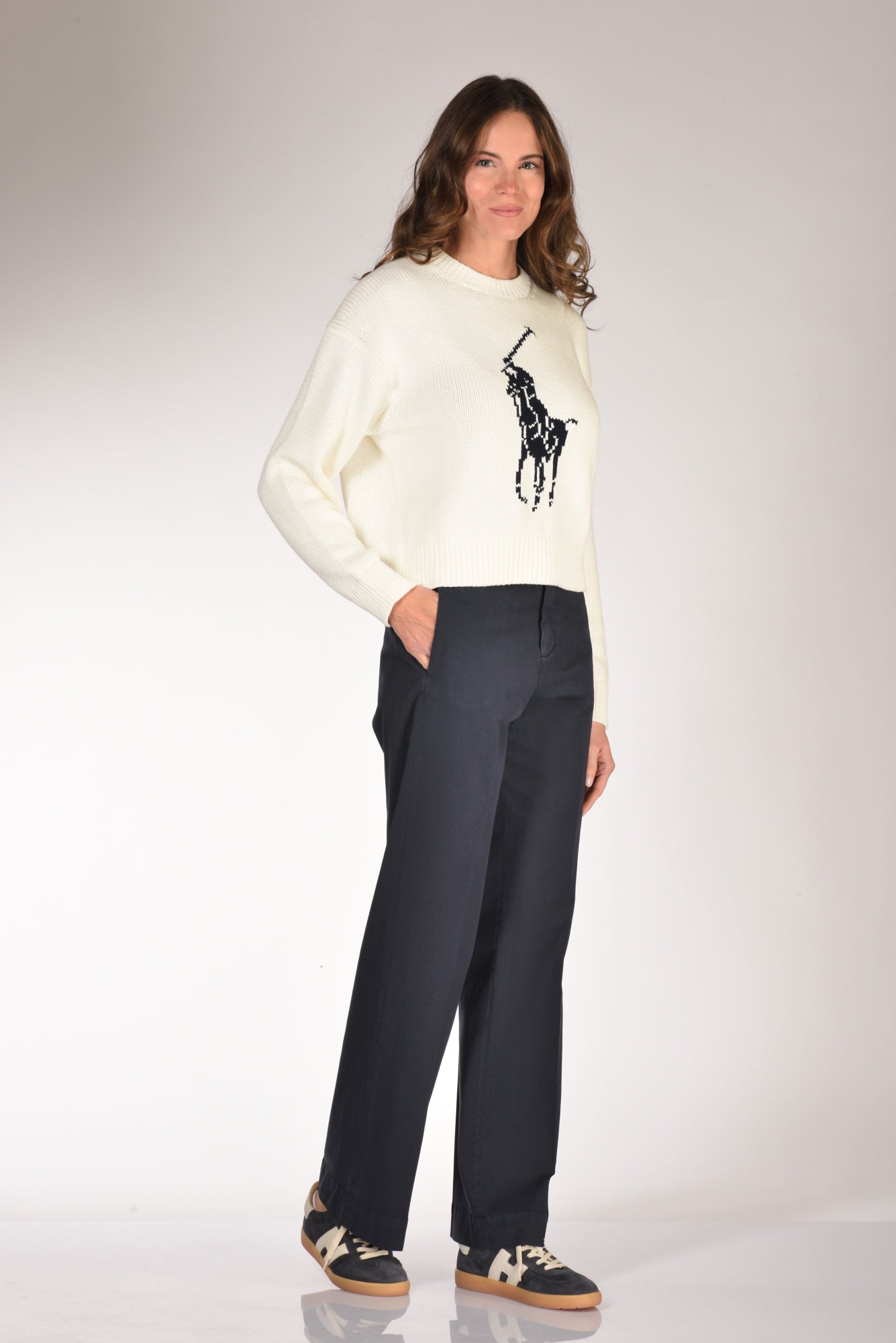 La modella in fotografia è alta 180 cm e misura seno 87 cm, vita 56 cm, fianchi 90 cm indossa la seguente taglia 40 o S mentre di jeans 26 e di calzatura 40