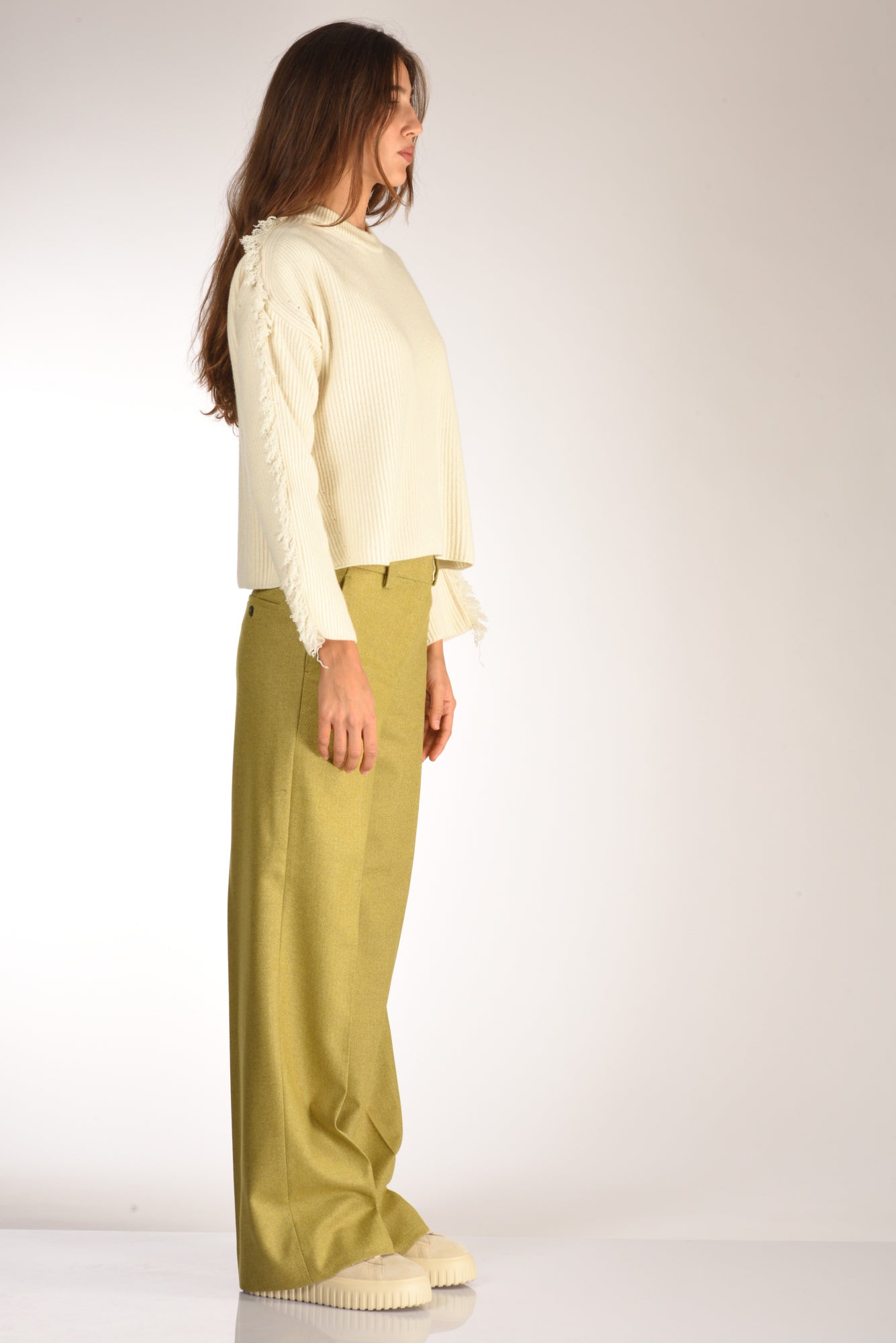 Maglia Cropped, Collo A Lupetto, Spacchi Laterali, Maniche Ampie Decorate Da Frange, Vestibilita' Over, Composizione 70 Lana, 30 Cachemire, Made In Italy