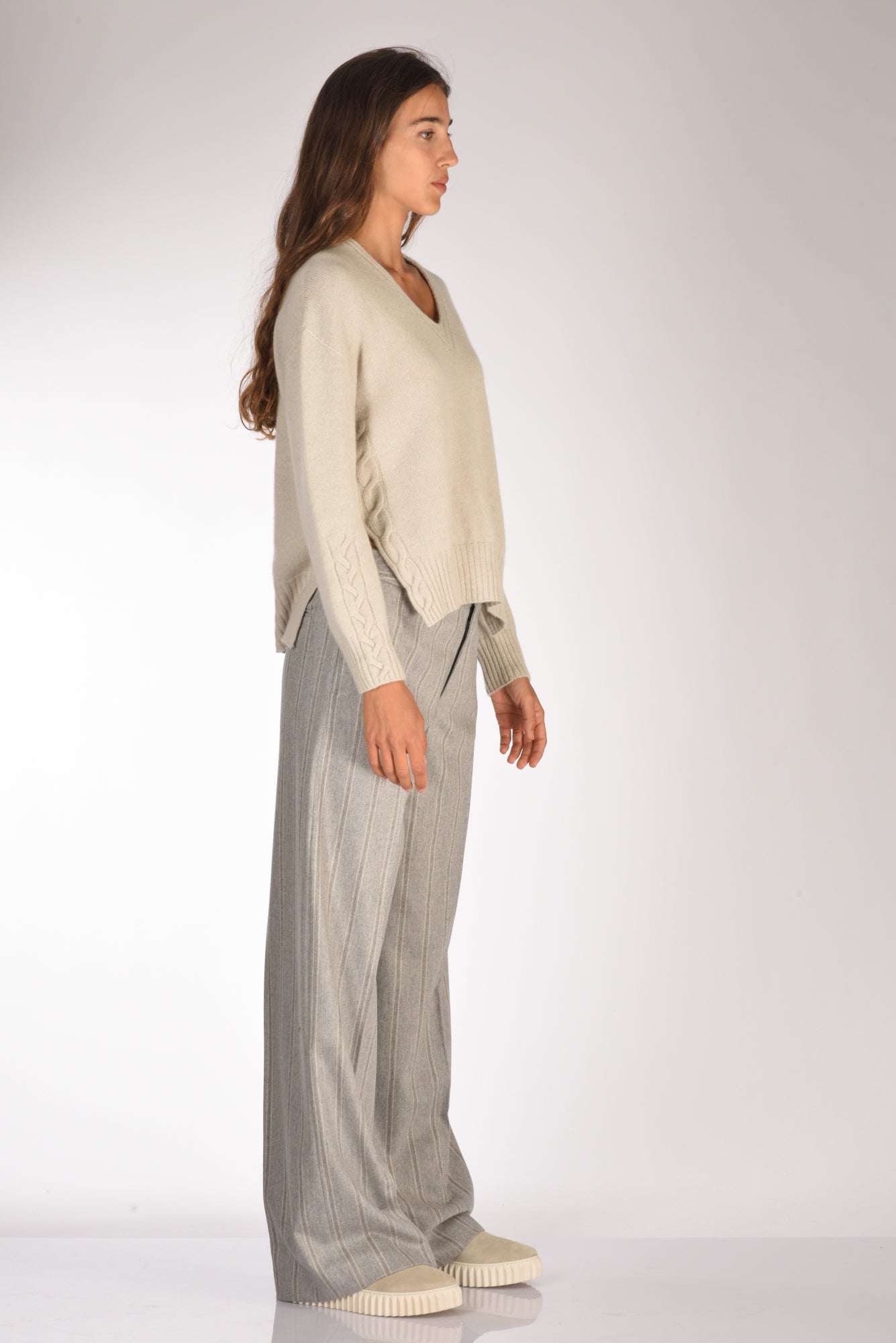 Maglia Scollo V, Spacchi Laterali, Motivo Decorativo Di Treccia Su Polsi E Parte Laterale Frontale, Vestibilita' Regular, Composizione 100 Cachemire, Made In Italy