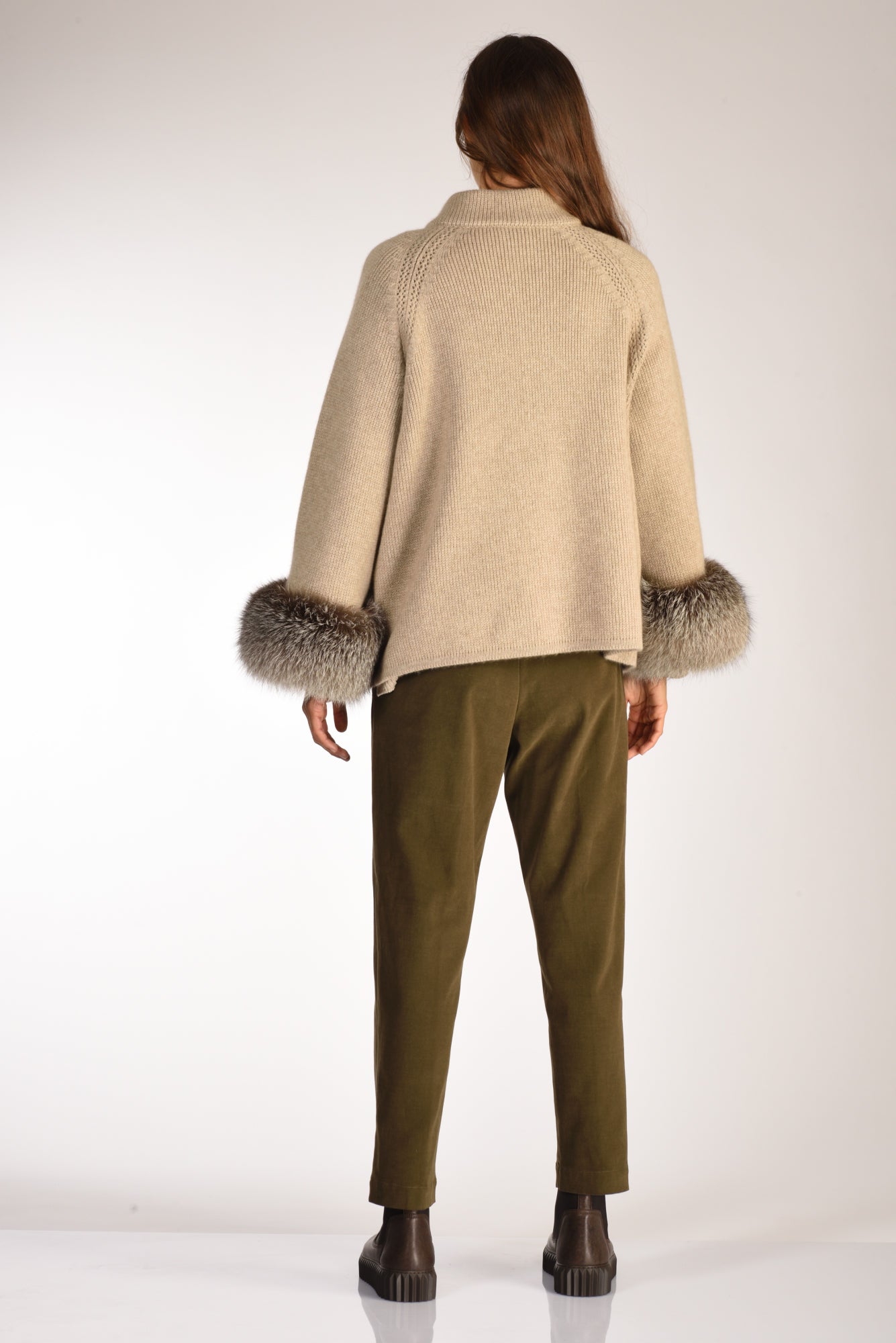 Giacca Collo Alla Coreana, Maniche Raglan Ampia Decorata Con Polsi In Pelliccia, Tasche Frontali Posizionate Diagonalmente, Chiusa Da Bottoni A Pressione Nascosti, Taglia Unica, Vestibilita' Relaxed, Composizione 100 Cachemire, Bordi In Volpe, Made In Italy
