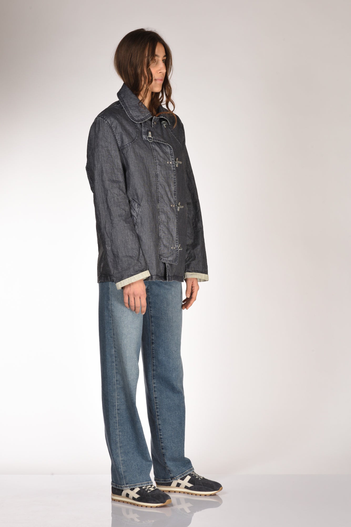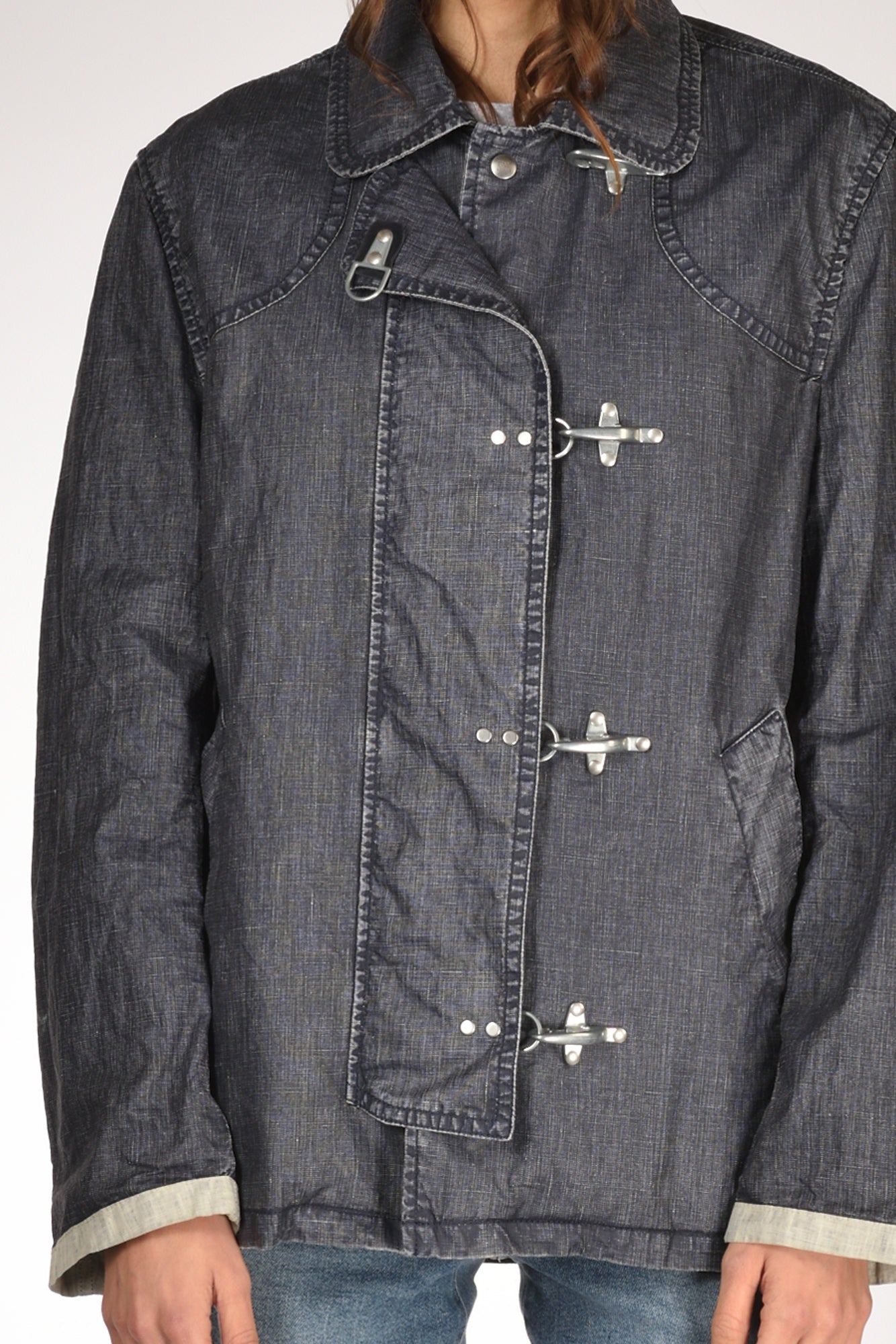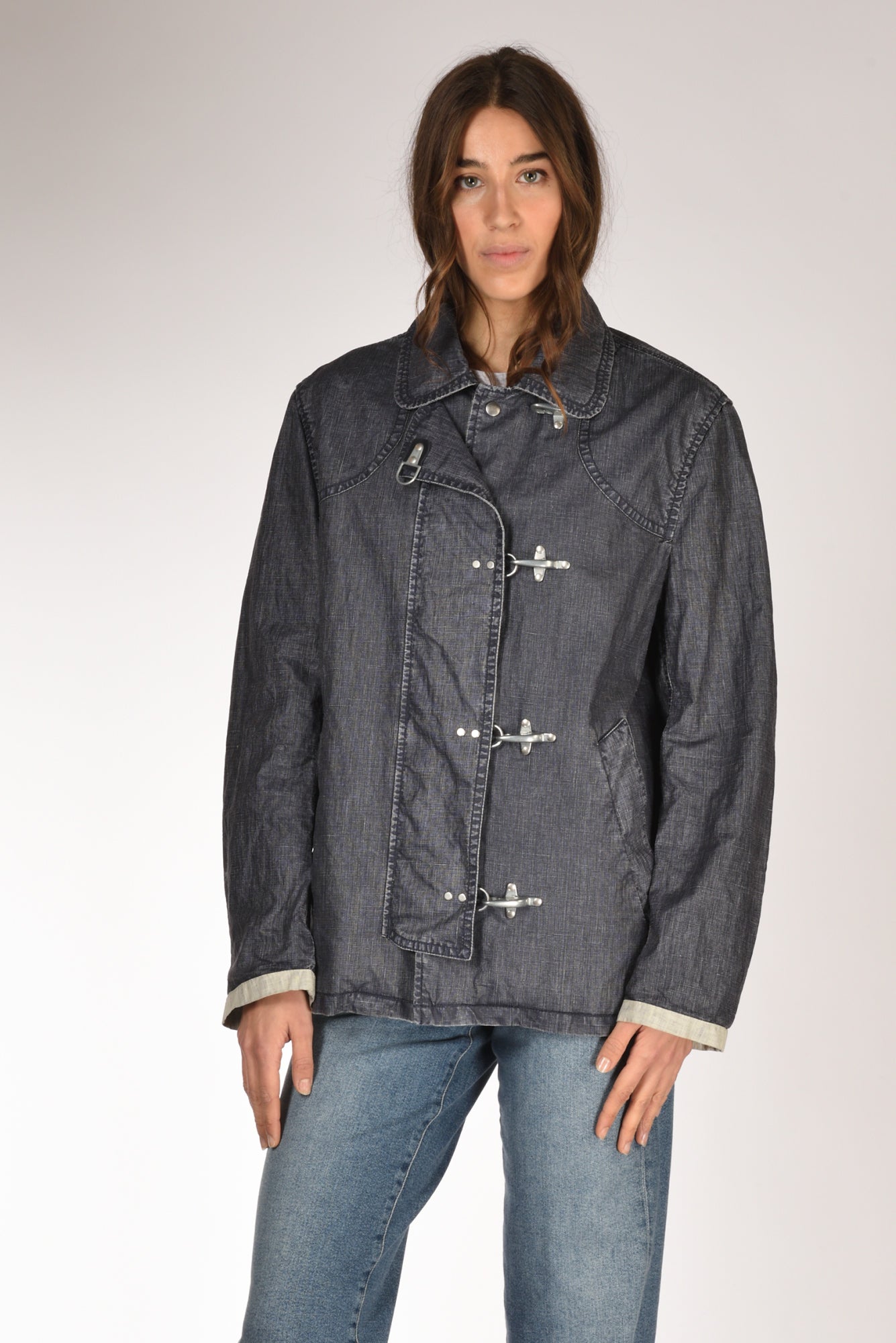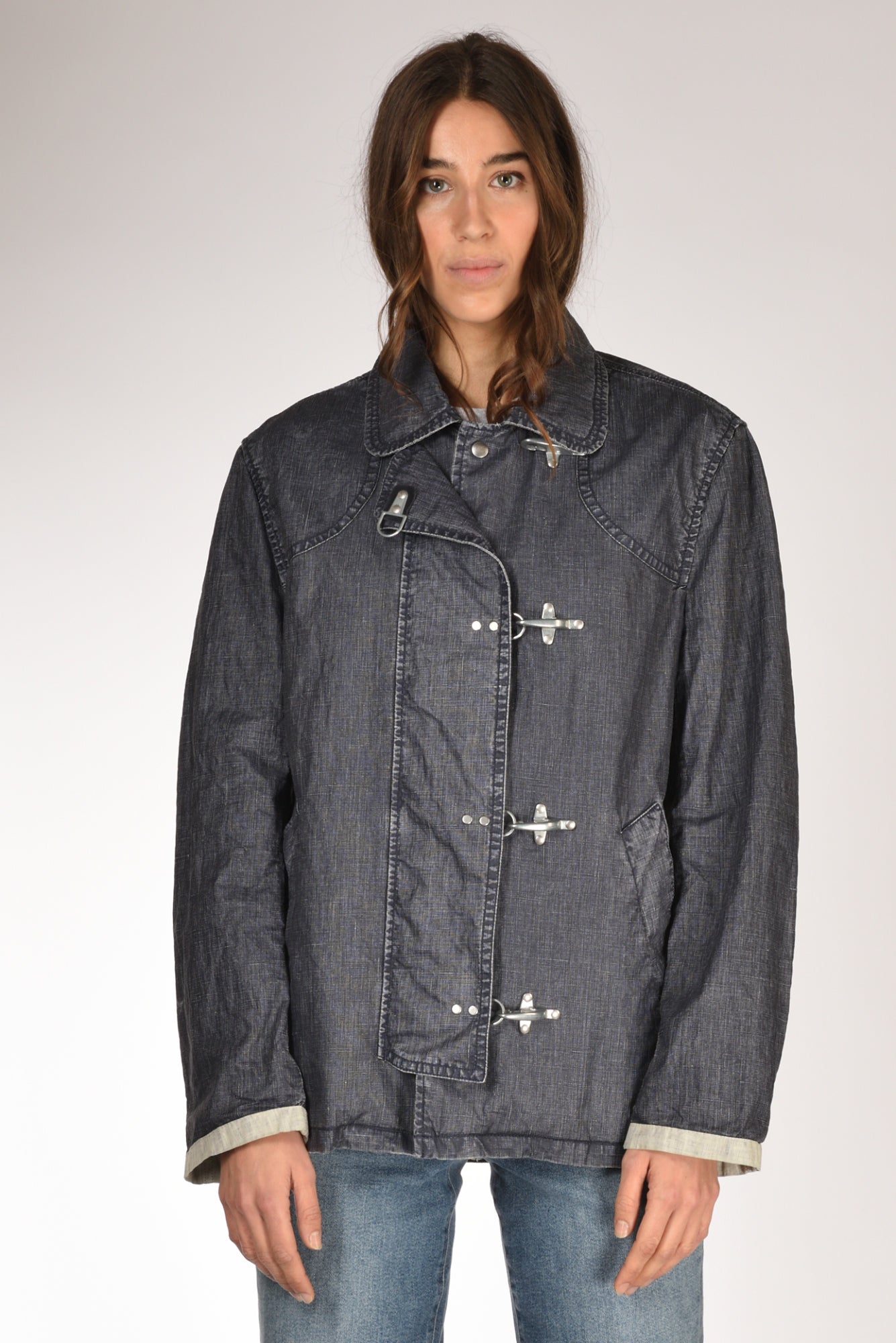 Giacca 4 Ganci Della Collezione Fay Archive, Realizzata In Tela Di Lino Delave' Spalmato E Tinto In Capo, Sfoderata, Collo A Camicia, Manica Lunga Con Polsino A Contrasto, Dotata Di Doppia Chiusura Frontale Con Bottoni Automatici Logati Nascosti E 4 Iconici Ganci A Vista, Tasche Inclinate A Filettone, Vestibilita' Morbida, Made In Republica Moldava, Composizione 100 Lino