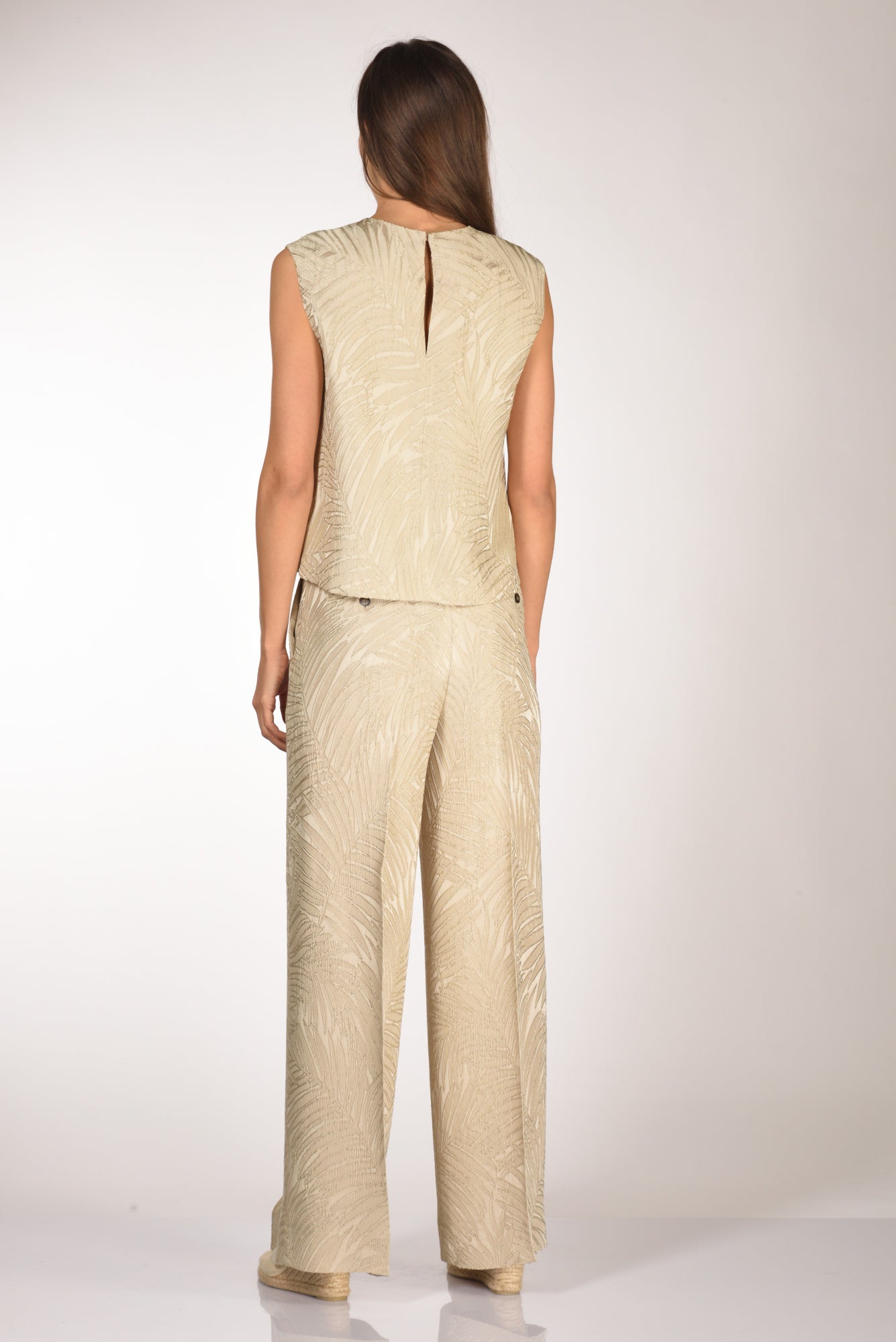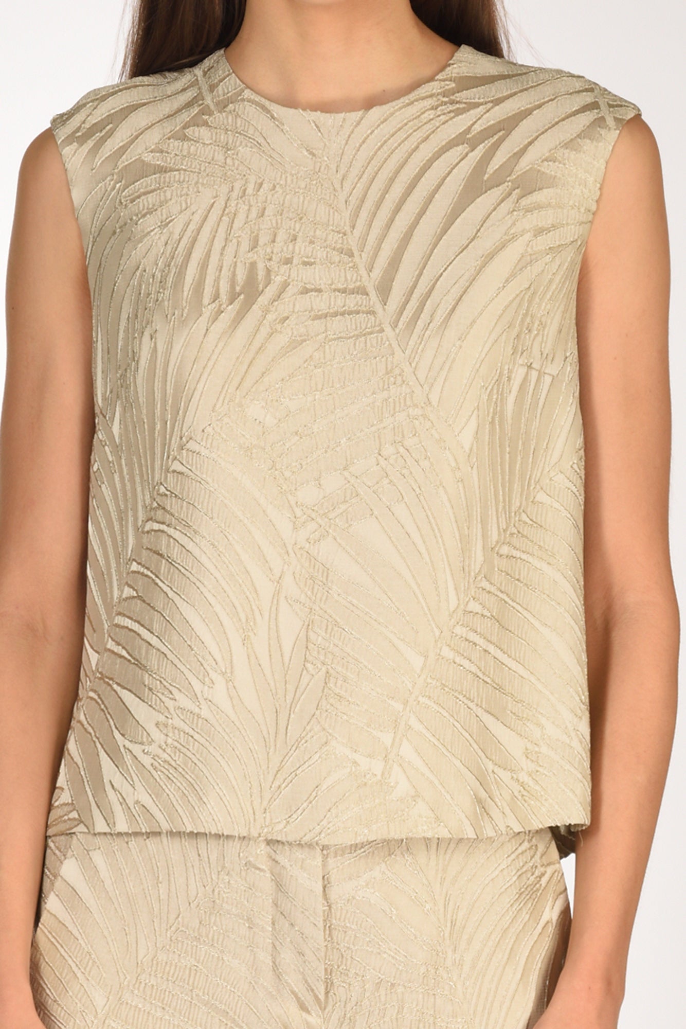 Top Ampio Senza Maniche, Girocollo, Chiusupo Posteriore A Goccia Con Bottone Ed Asola Volante, Tessuto Con Lavorazione A Rilievo, Fondo Spacchi Laterali, Linea Diritta, Vestibilita' Morbida, Made In Italy, Composizione 100 Viscosa
