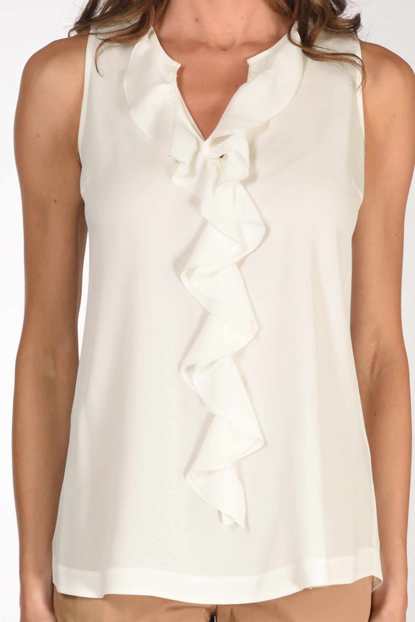 Camicia Senza Maniche Con Profondo Scollo A V Decorato Da Volants, Linea Svasata, Fondo Stondato, Vestibilita' Regular, Msade In Italy, Composizione 60 Viscosa, 40 Seta