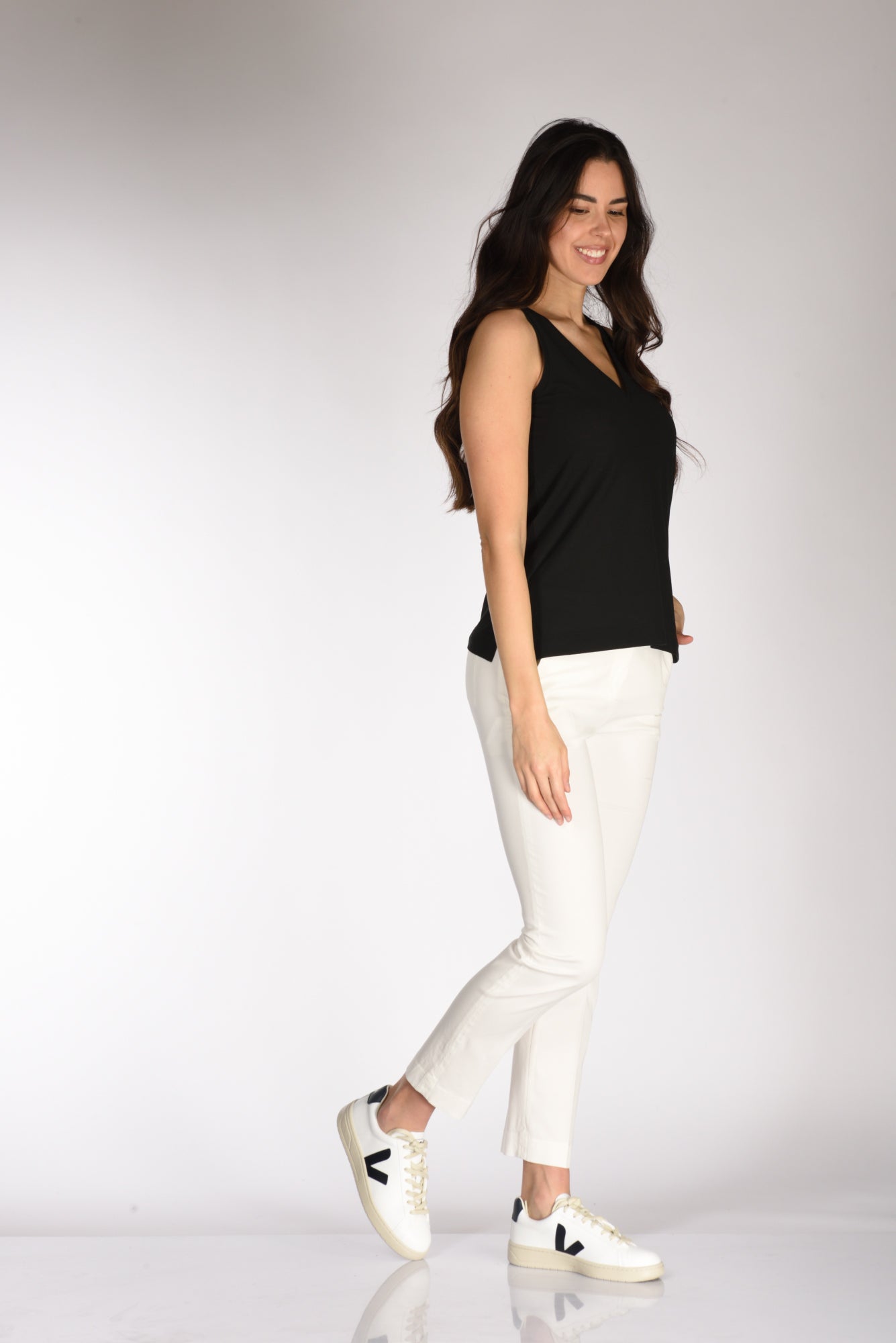 La modella in fotografia è alta 180 cm e misura seno 87 cm, vita 56 cm, fianchi 90 cm indossa la seguente taglia 40 o S mentre di jeans 26 e di calzatura 40
