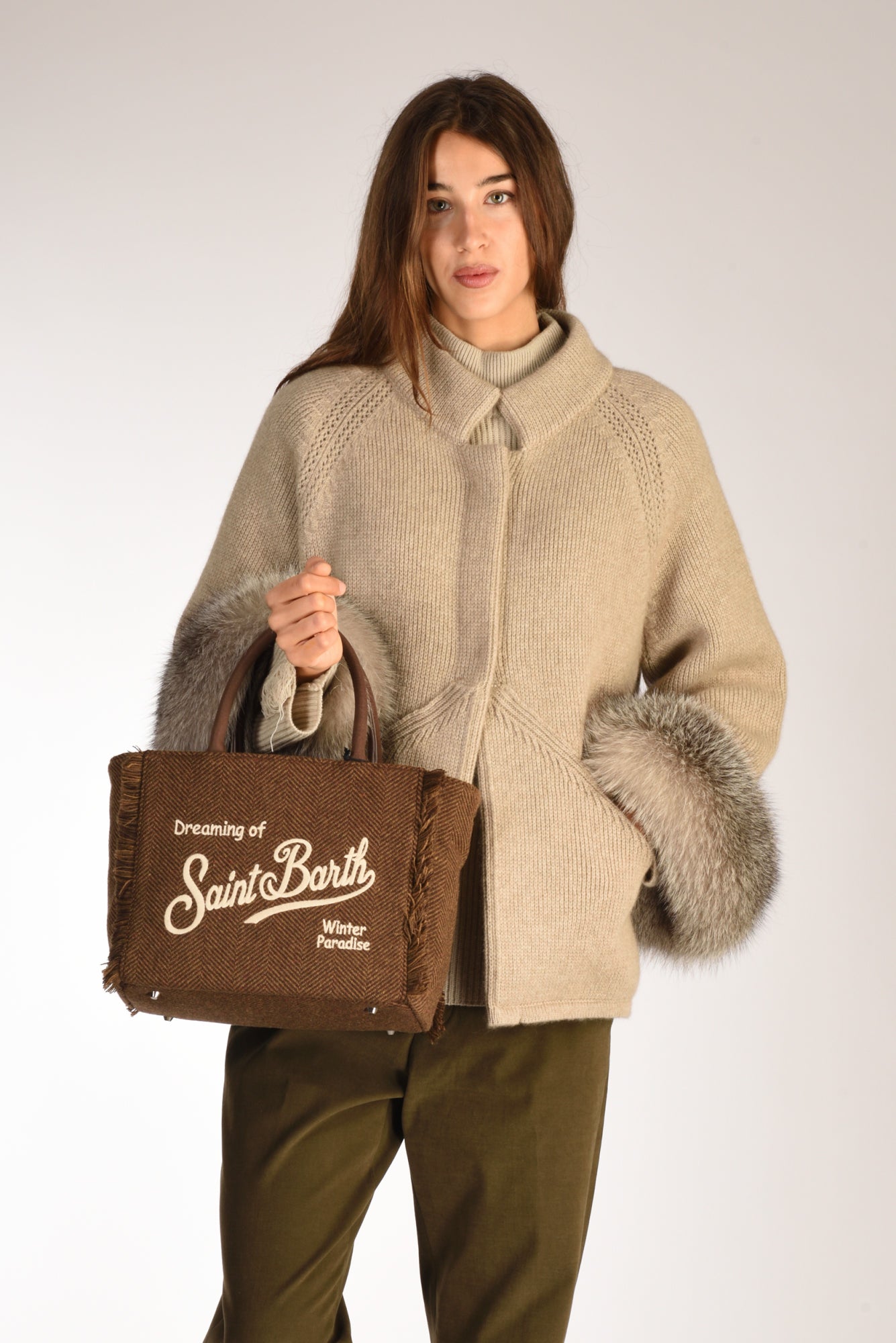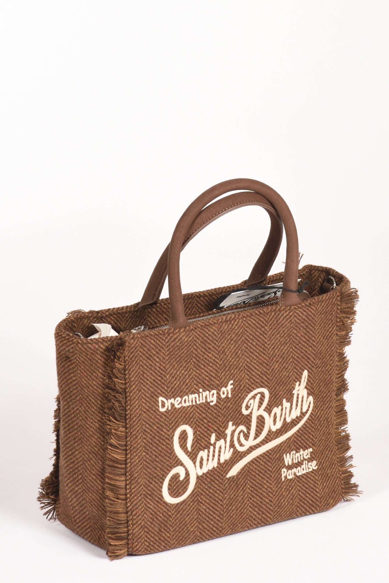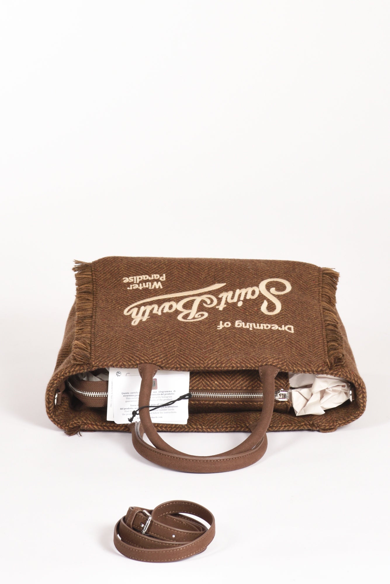 Borsa Effetto Lana, Foderata, Fondo Con Piedini, Frange Laterali, Logo Ambo I Lati, Chiusura Zip Centrale, Due Tasche Interne Multiuso Di Cui Una Zippata, Tracolla Removibile, Composizione 100 Poliestere, Made In China,