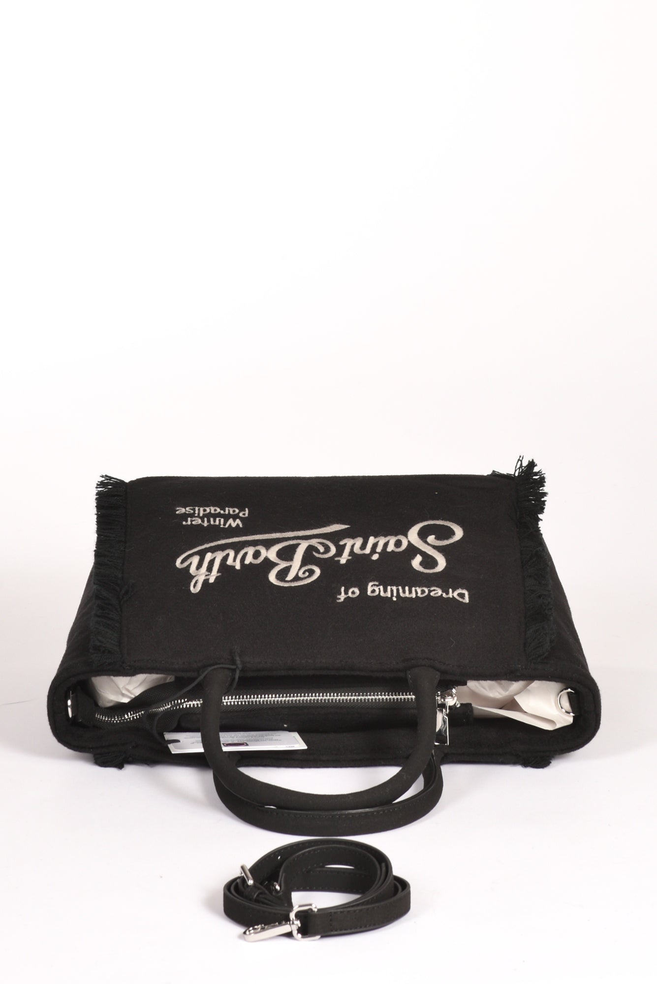 Borsa A Mano Realizzata In Tessuto, Decorata Da Frange, Logo Ricamato Ambo Lati A Contrasto Colore, Due Tasche Interne Di Cui Una Chiusa Da Zip, Chiusura Zip, Tracolla Removibile, Foderata, Made In China, Composizione 85 Poliestere 15 Lana, Fodera 100 Poliestere, Dimensioni 30x22x15 Cm
