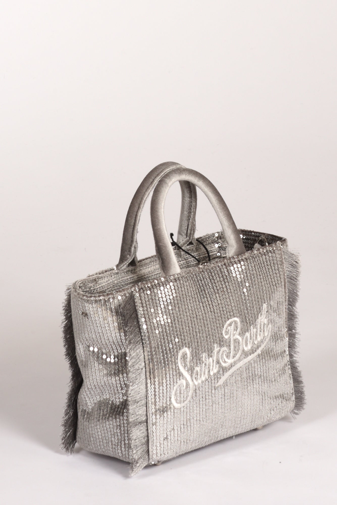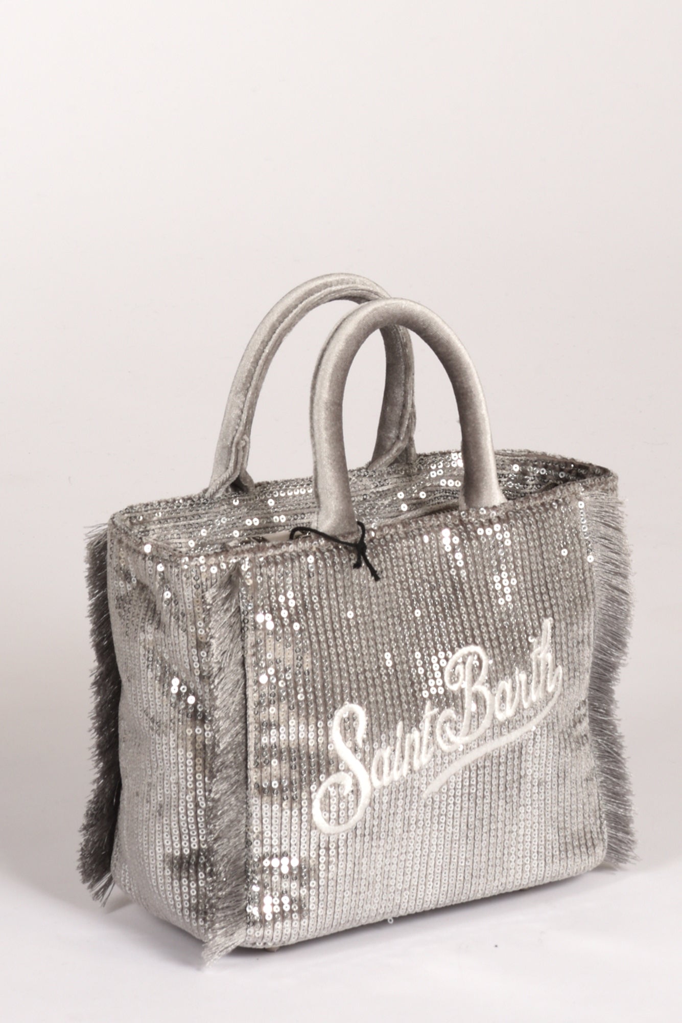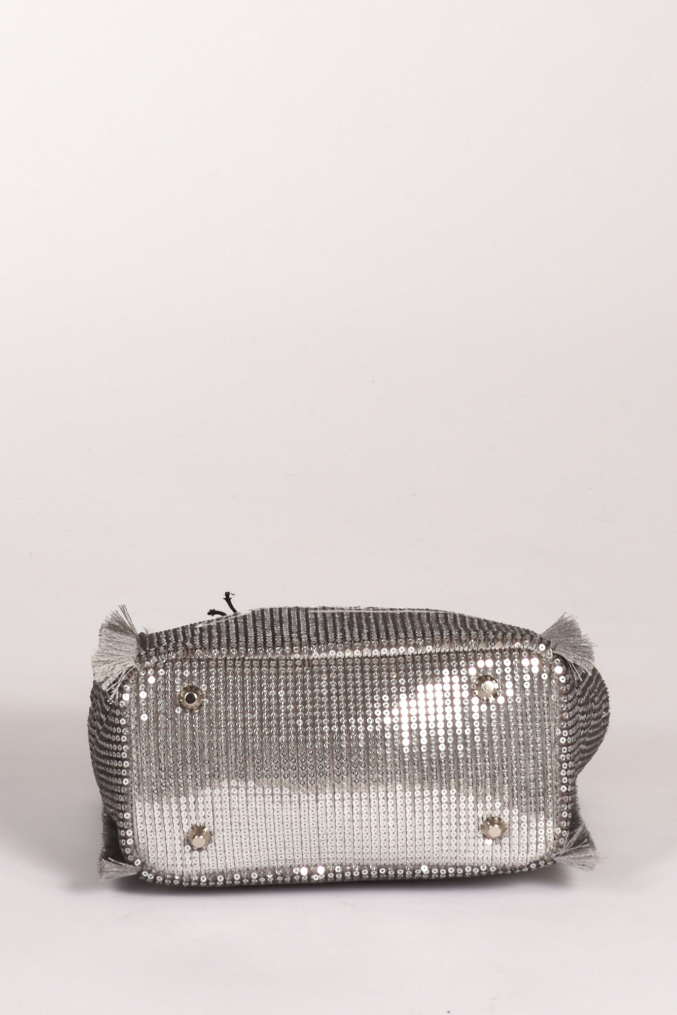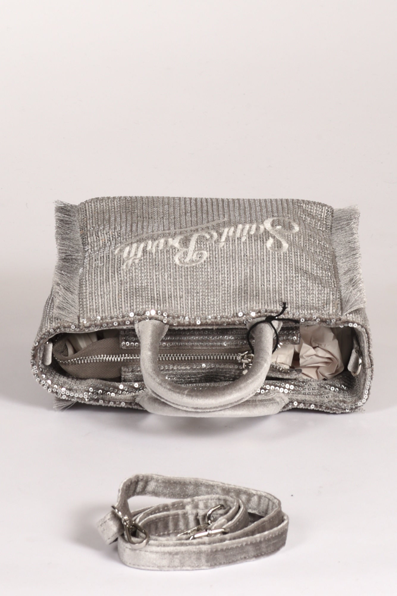 Borsa A Mano In Velluto Decorata Da Micro Paillettes, Foderata, Fondo Con Piedini, Frange Laterali, Logo Ambo I Lati, Chiusura Zip Centrale, Due Tasche Interne Multiuso Di Cui Una Zippata, Tracolla Removibile, Composizione 100 Poliestere, Made In China,