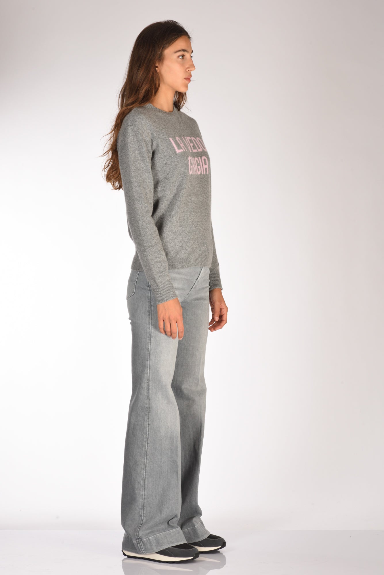 La modella in fotografia è alta 180 cm e misura seno 87 cm, vita 56 cm, fianchi 90 cm indossa la seguente taglia 40 o S mentre di jeans 26 e di calzatura 40