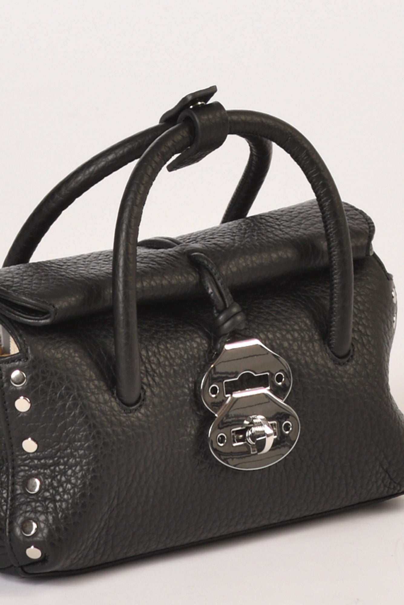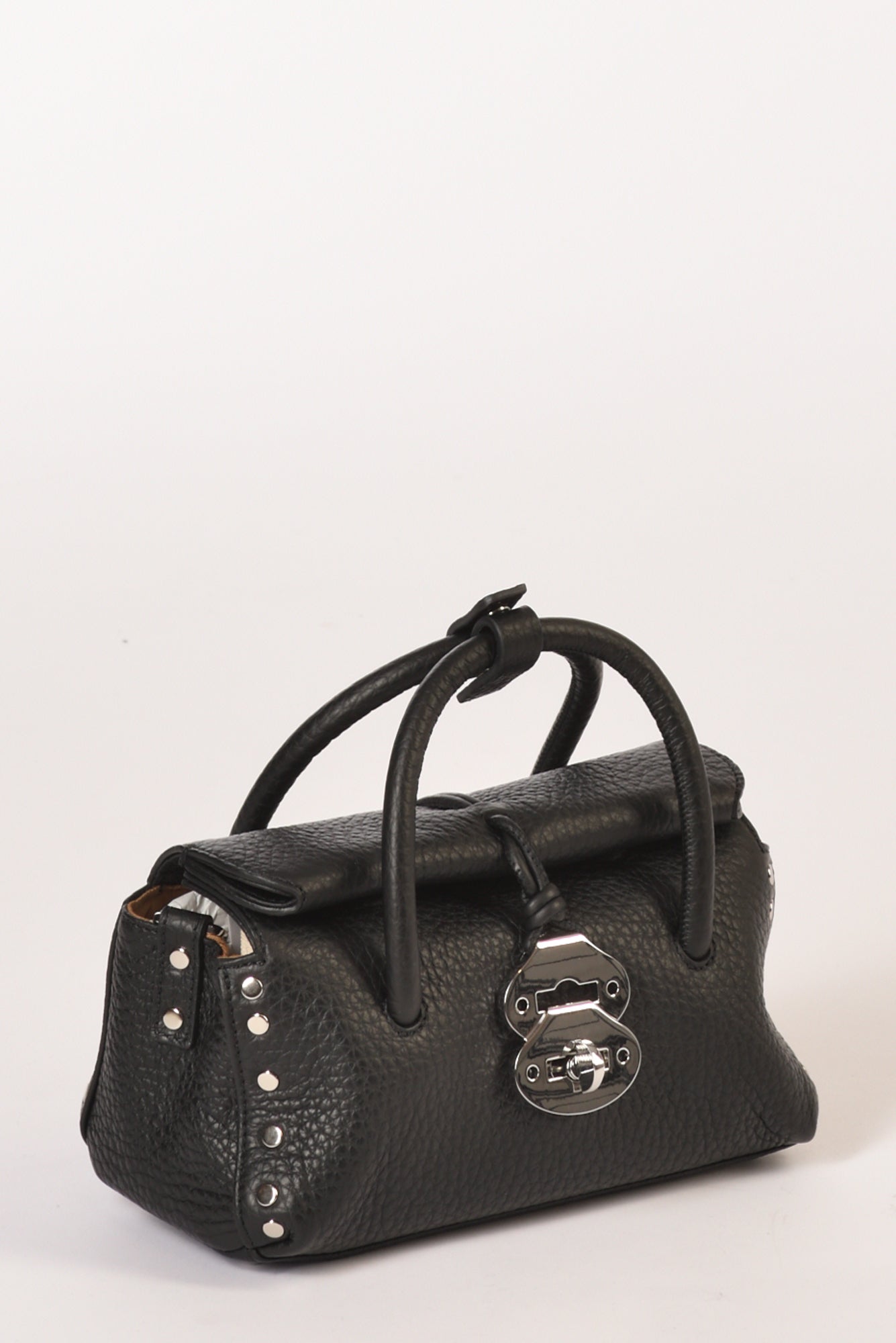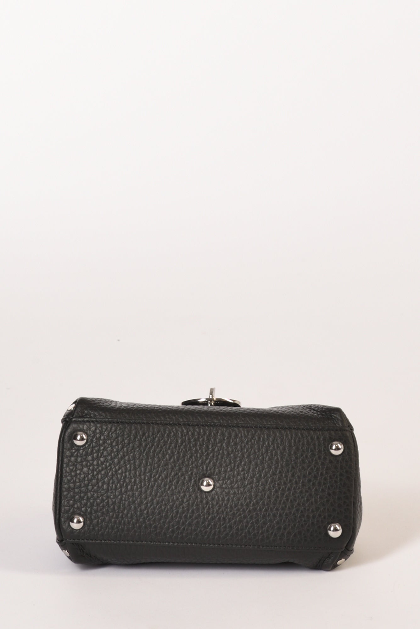 Borsa A Mano, Chiusura Roll-top Magnetica E Nastrini Tubolari Con Fibbia Twist-lock, Tracolla Regolabile Ed Amovibile, Lavorazione Pelle Martellata, Internamente Due Scomparti, Borchie A Vista Metalliche, Fondo Con Piedini, 100 Pelle, Made In Italy